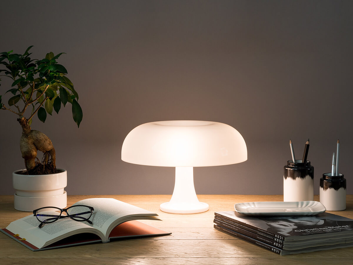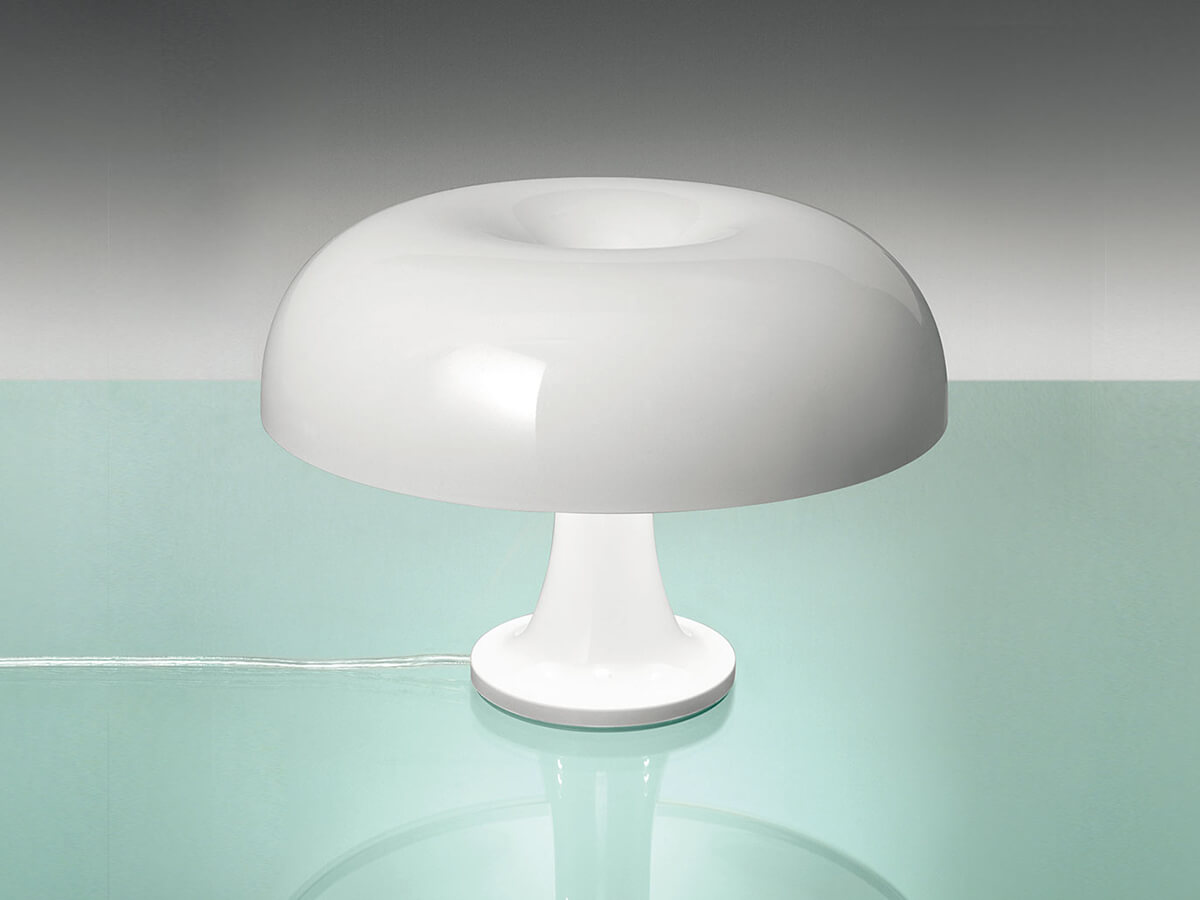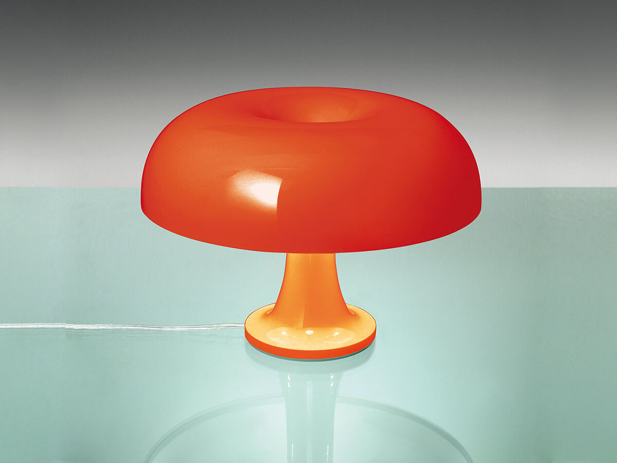 An icon of the 60s, able to remain almost unchanged since the years of its distribution to the general public. The table version is the re-edition of the famous lamp winner of the 1965 Studio Artemide / Domus competition designed for Artemide by Giancarlo Mattioli and the Città Nuova urban planners group. To the eye it looks like a triumph of plastic and flowery colors, where the base in injection-molded ABS resin and die-cast in chromed molds merges with the lampshade cap of the same material, creating a soft and captivating structure. Four bulbs inserted in the upper part give life to a direct and diffused light, ideal for differentiated environments. The shapes of Nesso place it perfectly in diversified spaces, always finding the right perspective.