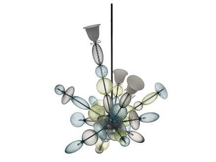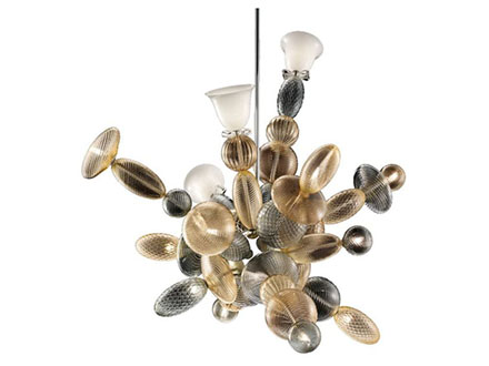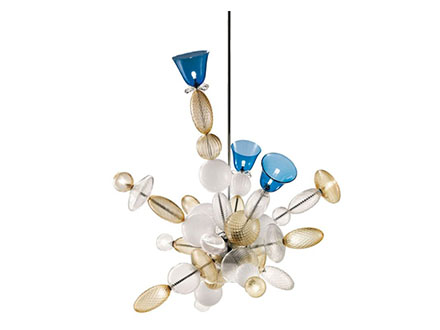 The Perseus chandelier has its origins in the choice of the Barovier&Toso glassworks to combine the ancient Venetian tradition of precious colored crystal chandeliers with surprising forms of the most contemporary design. Presus bears the signature of the Dutch Marcel Wanders and presents itself as a fascinating explosion of shapes that radiate from a central nucleus according to a suggestion of richly worked round or oval elements, almost as if it represented a sample of the different glass decoration techniques that Barovier&Toso has mastered over its centuries-old tradition. In addition to the shapes, the various elements that make up the arms also differ in the delicate colors, according to a series of fixed and carefully studied color combinations.