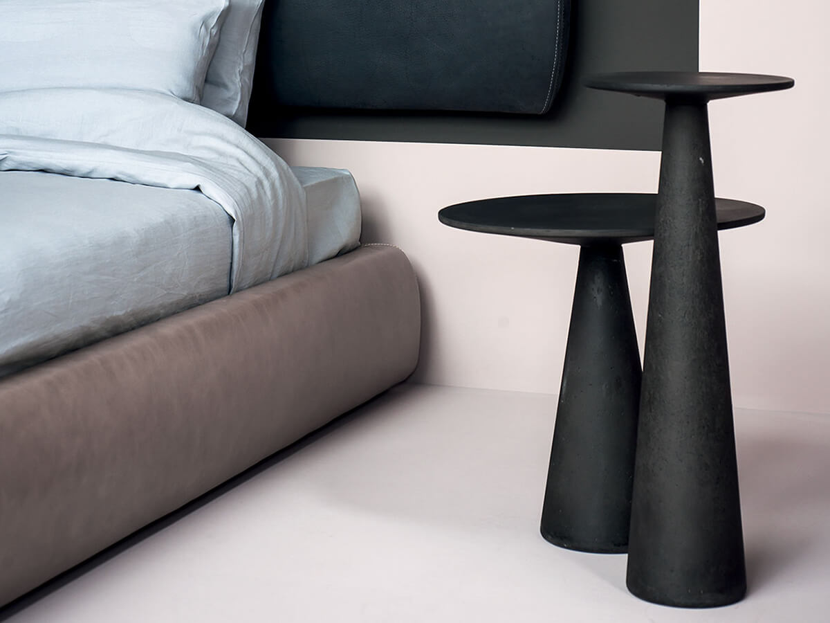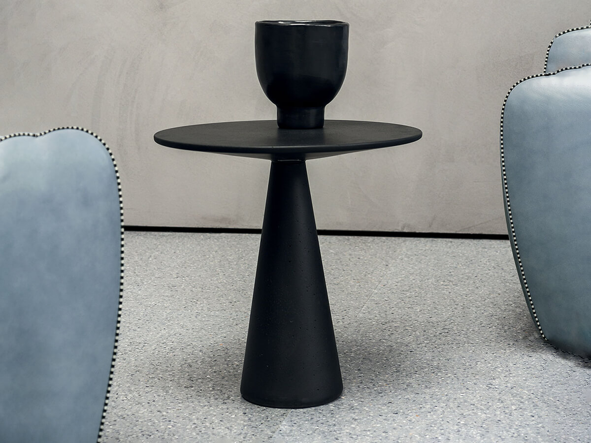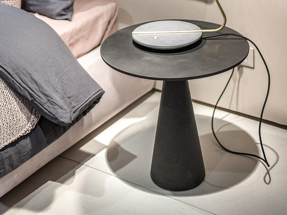 The Jove collection is declined in numerous proposals for the living and dining space, giving life to a complete assortment that is as compositional as it is functional. The Jove coffee table stands out for the characteristic cone shape of the base fused to the round top, available in different sizes and sizes. The material of which it is made, agglomerated concrete, gives it a particularly material and raw nature, an ideal focal point for heterogeneous furnishings where you want to place an element of extreme personality. In its meaning as a dining table, Juno lends itself particularly well to everyday use thanks to the intrinsic strength of the stone it is made of.* Technical features: structure and top in grey concrete with black ebony marble grit
