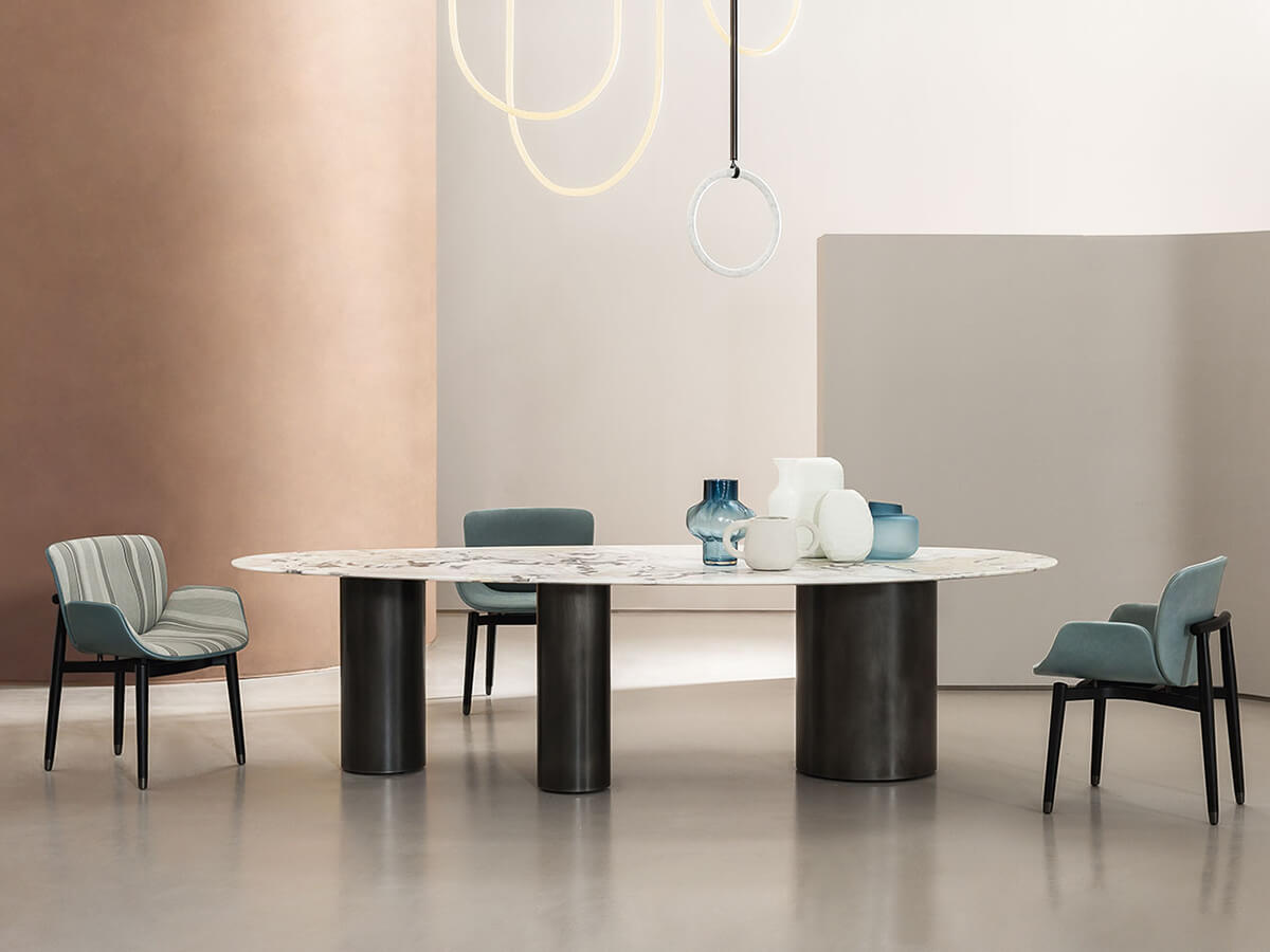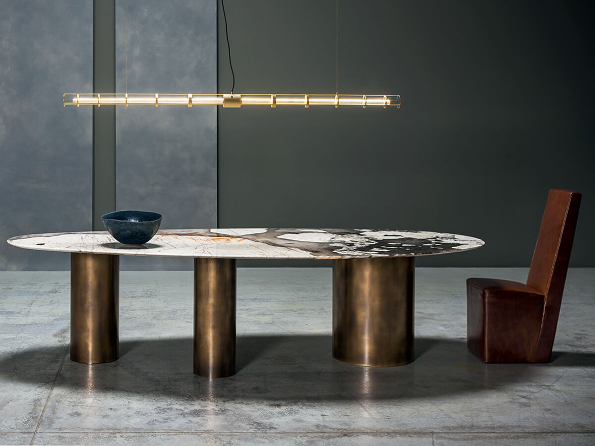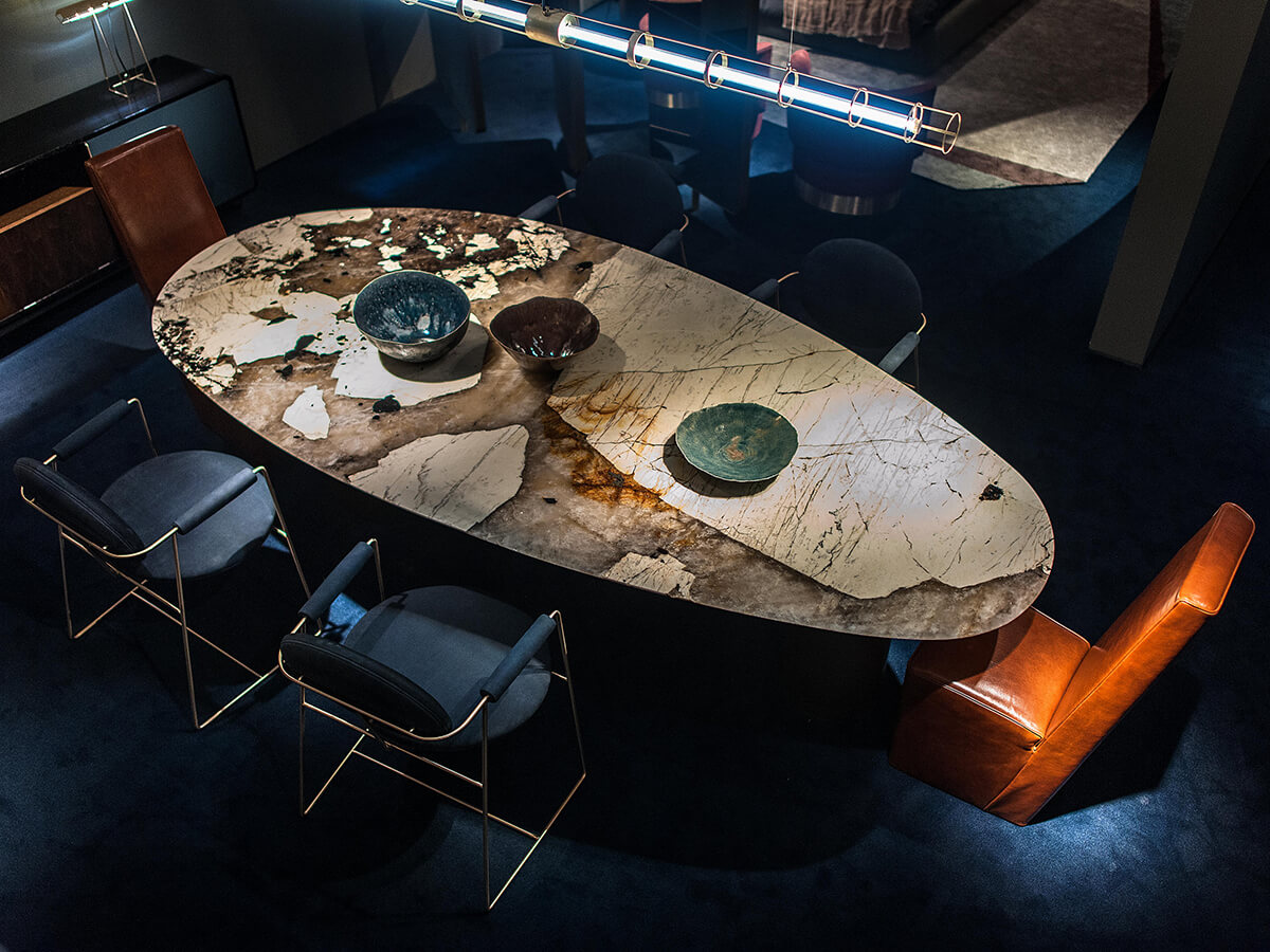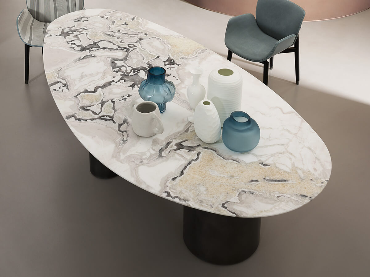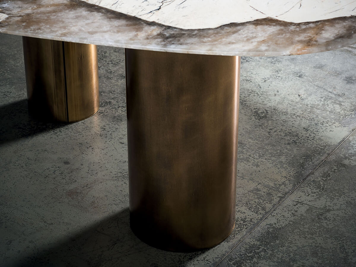 One of the many iconic pieces by Baxter, capable of summarizing the ethics and creative essence in its decisive and full of personality trait. The Lagos table represents a versatile piece of furniture, capable of being placed in the different rooms of the house, favoring convivial spaces and areas dedicated to conversation. The living space structured in this way is embellished with a unique element whose singularity is not based only on the presence of three legs - instead of the canonical four - but also on the specific nature of the stone used as a support surface. Each model is born different from the others, distinguished by the texture and designs of the selected slab, thus giving life to unique and unrepeatable furnishing elements.