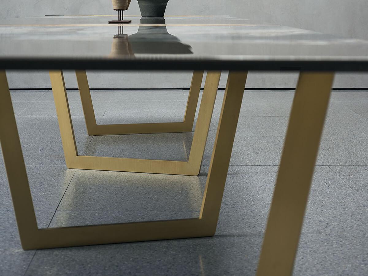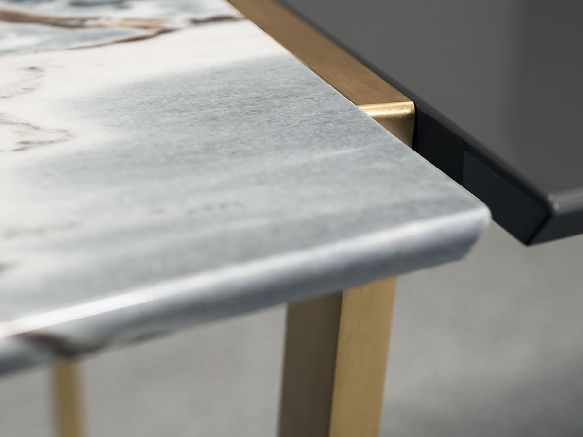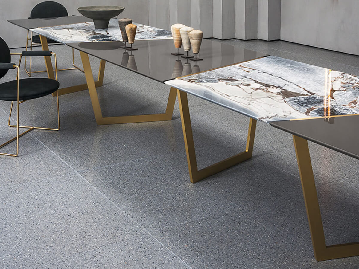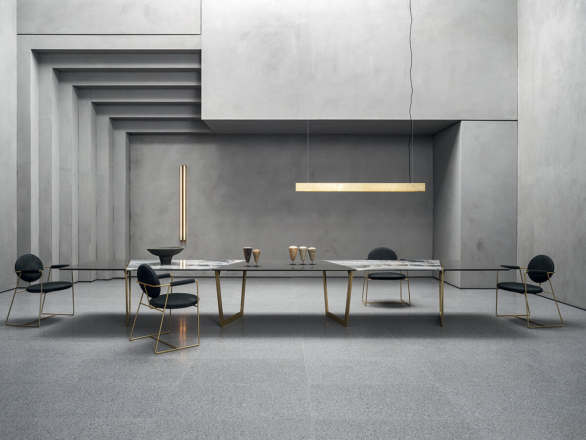 An extremely versatile piece of furniture, capable of configuring itself according to need or taste and changing its appearance based on the functions indicated. Hagit Pincovici designs this model with a clear reference to use in diversified environments, from the smallest to the largest. She consequently shapes a naturally extensible motif, which can be configured in different sizes without losing its sculptural charm. The top alternates parts in MDF with stone sheets protected with special water-repellent and resistant to use oils. The solid underlying structure is in painted metal to further embellish the uniqueness of Pangea.* Technical features: base and decorative inserts of the top in satin brass
