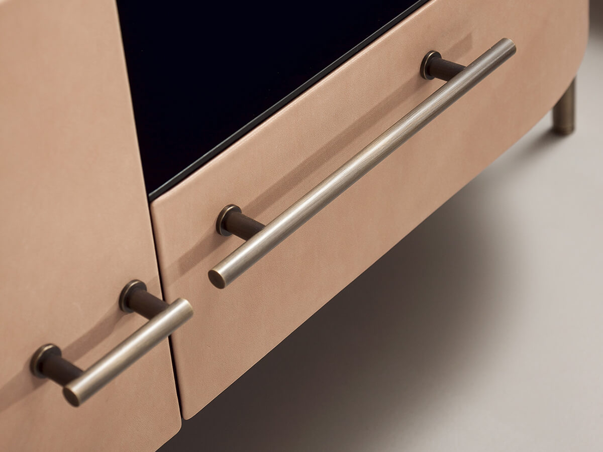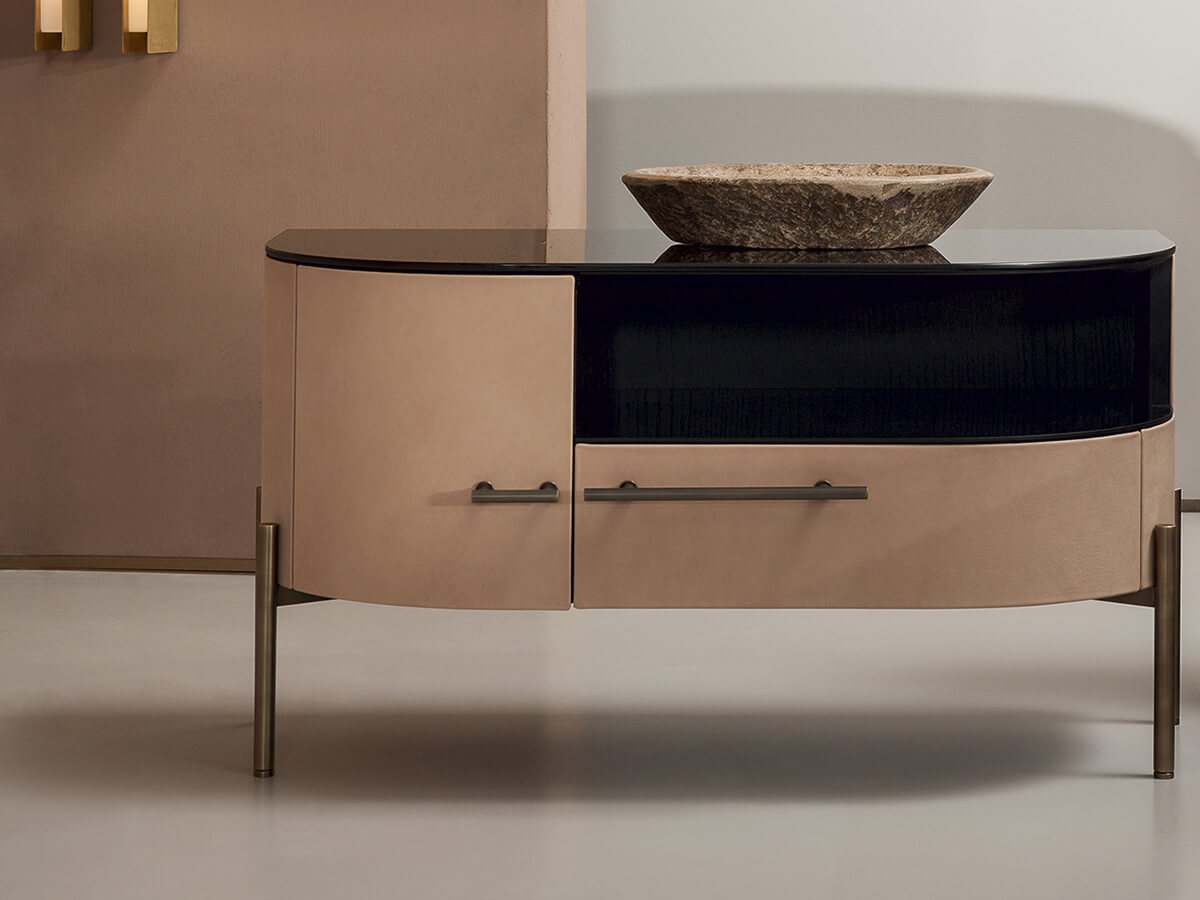 The Plissé product line expresses a way of perceiving fresh and original furniture that nevertheless does not disdain a note of nostalgia for the tastes and fashions of the last century. In its bedside table version Plissé stands out for its rounded shapes combined with precious metal inserts that with handles and feet embellish the figure giving it a refined character. A complete assortment of Baxter leathers contributes to making Plissé a multipurpose bedside table, suitable for different styles and tastes of the bedroom. The door and the front of the drawers are carefully coated, leaving nothing to chance. The back-lacquered glass top gives a note of elegance.* Technical features: structure in matt black stained oak; base, handle and details in brushed burnished with black back-lacquered glass top