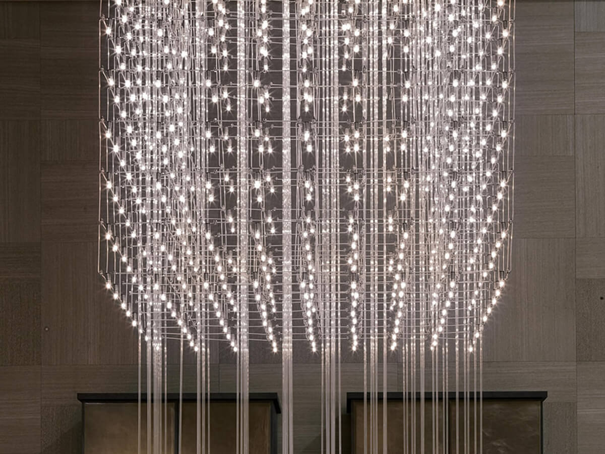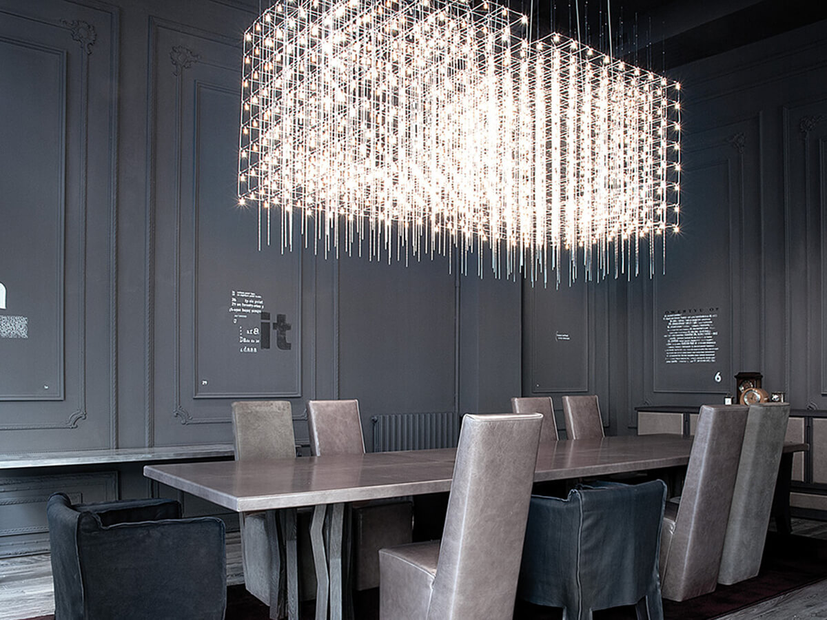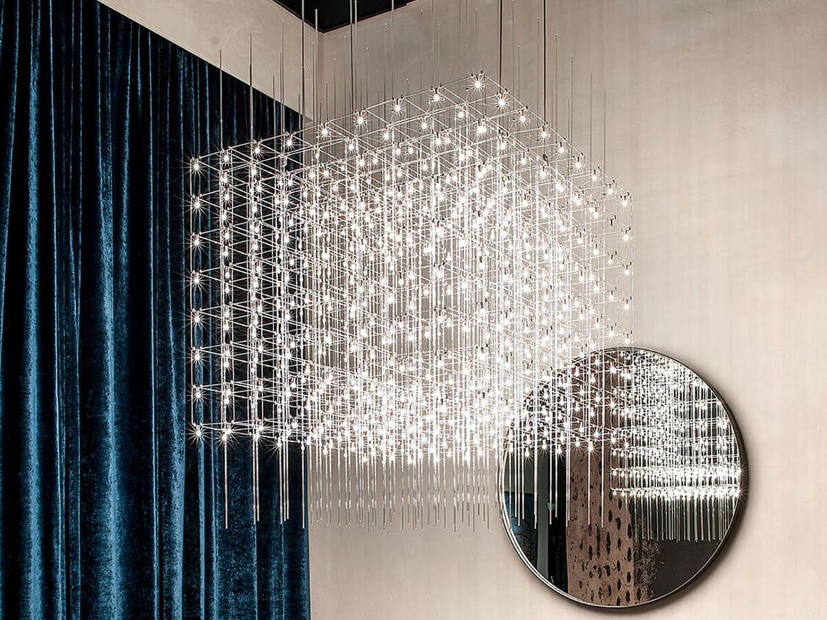 One of the most evocative works of Baxter, capable of attracting the eye not only for its originality, but also for its supreme aesthetic result. Q3 is a chandelier of important dimensions, created to offer a particle light that does not dazzle but at the same time fills the spaces with a homogeneous and diffused light. Its square shape is softened by the many filaments that, starting from the center, develop downwards and upwards, giving the impression of witnessing a real luminous "waterfall". The nickel wires are connected together with special clamps and built-in lamp holders.* Technical features: curved nickel wires with 548 Led light points; fringe made up of 64 removable glass rods