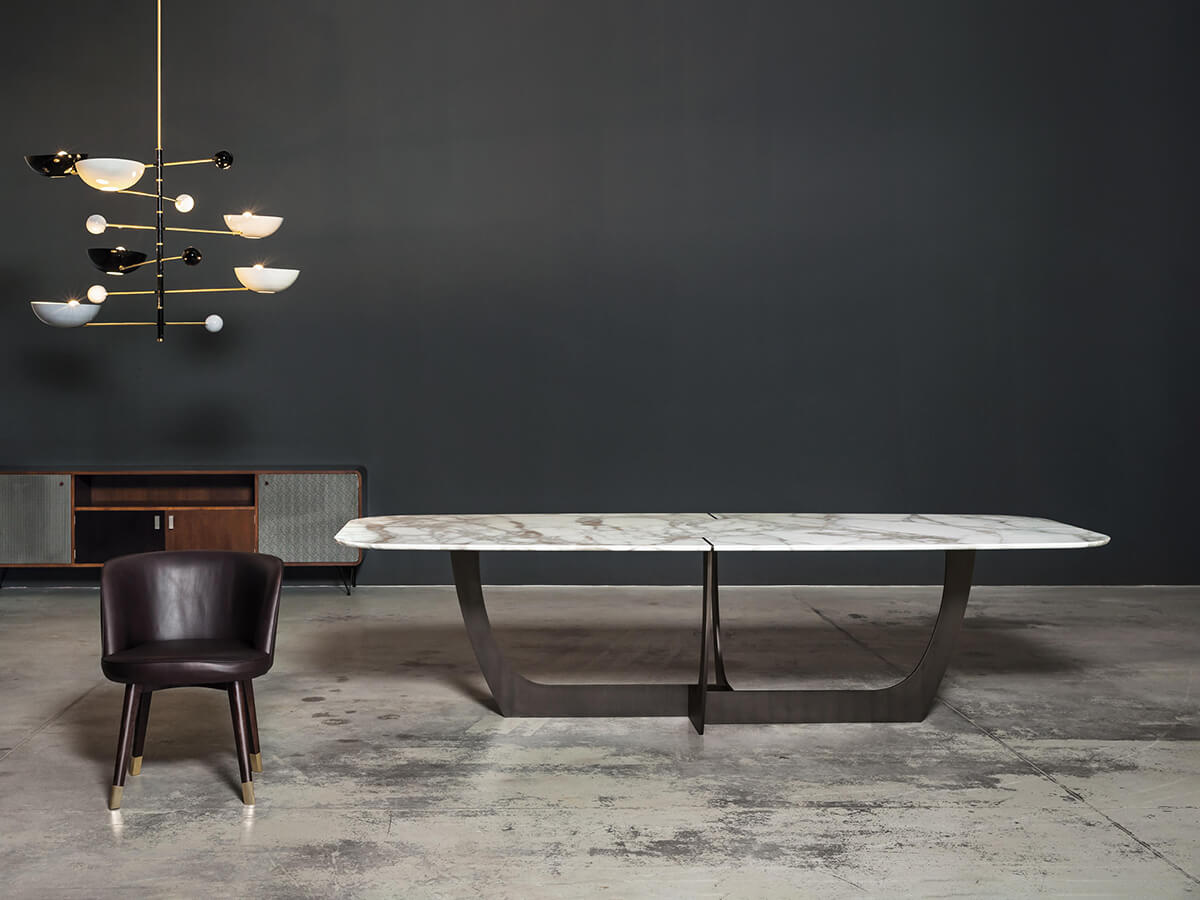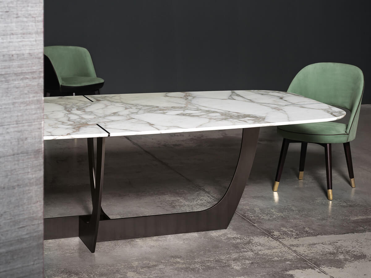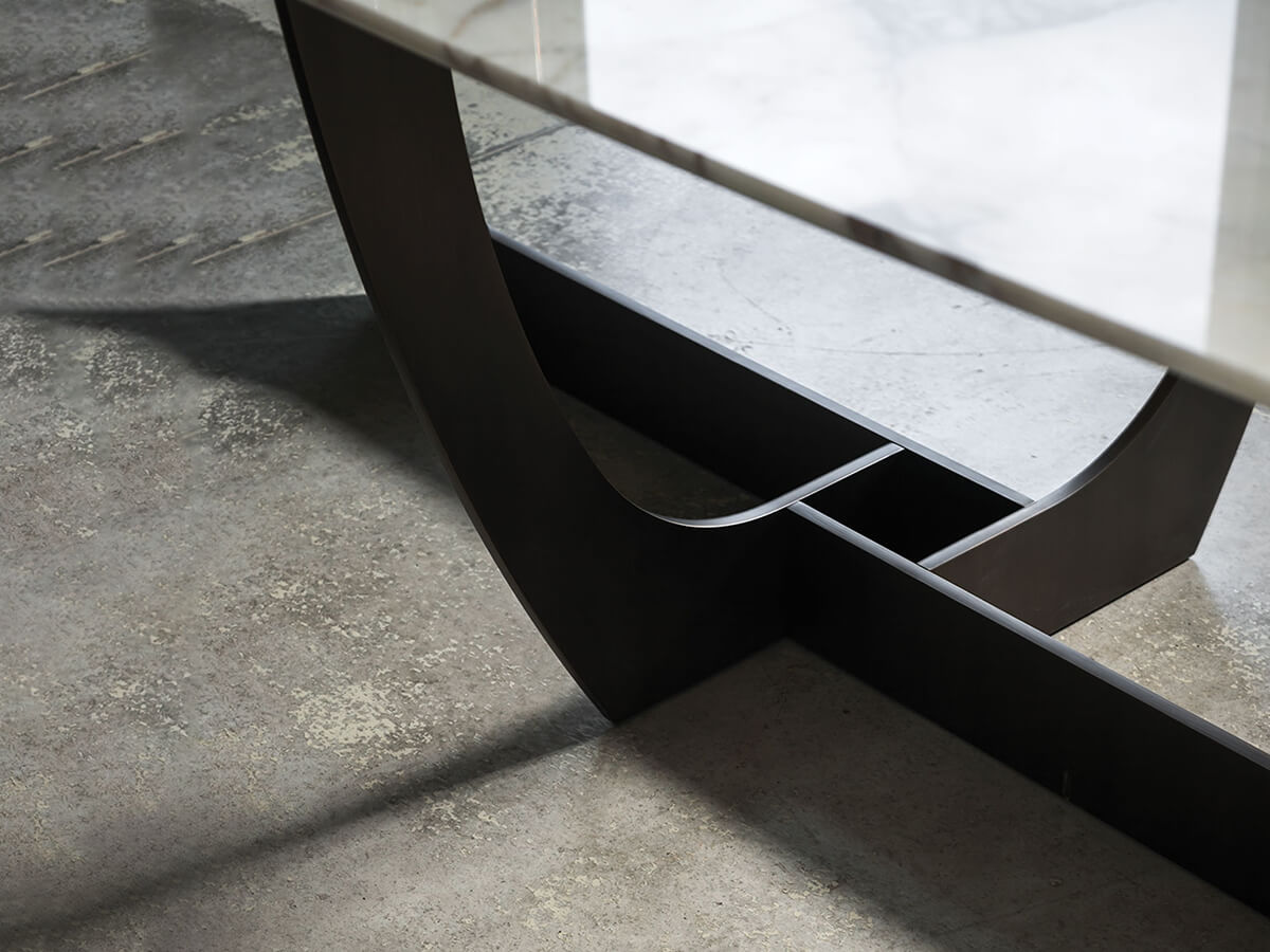A table with a strongly evocative design, which starts off inspired by the keel of a ship thanks to the superb interweaving of the supporting legs. The base is in metal, working according to different inspirations, and formed by four different supports intertwined in the center so as to in turn form a strong and extremely balanced structure. The overlying top is in stone with water-repellent protective oil. These rich variations serve to enhance the very shapes of the worked design so as to be slightly elliptical or square, with rounded corners.