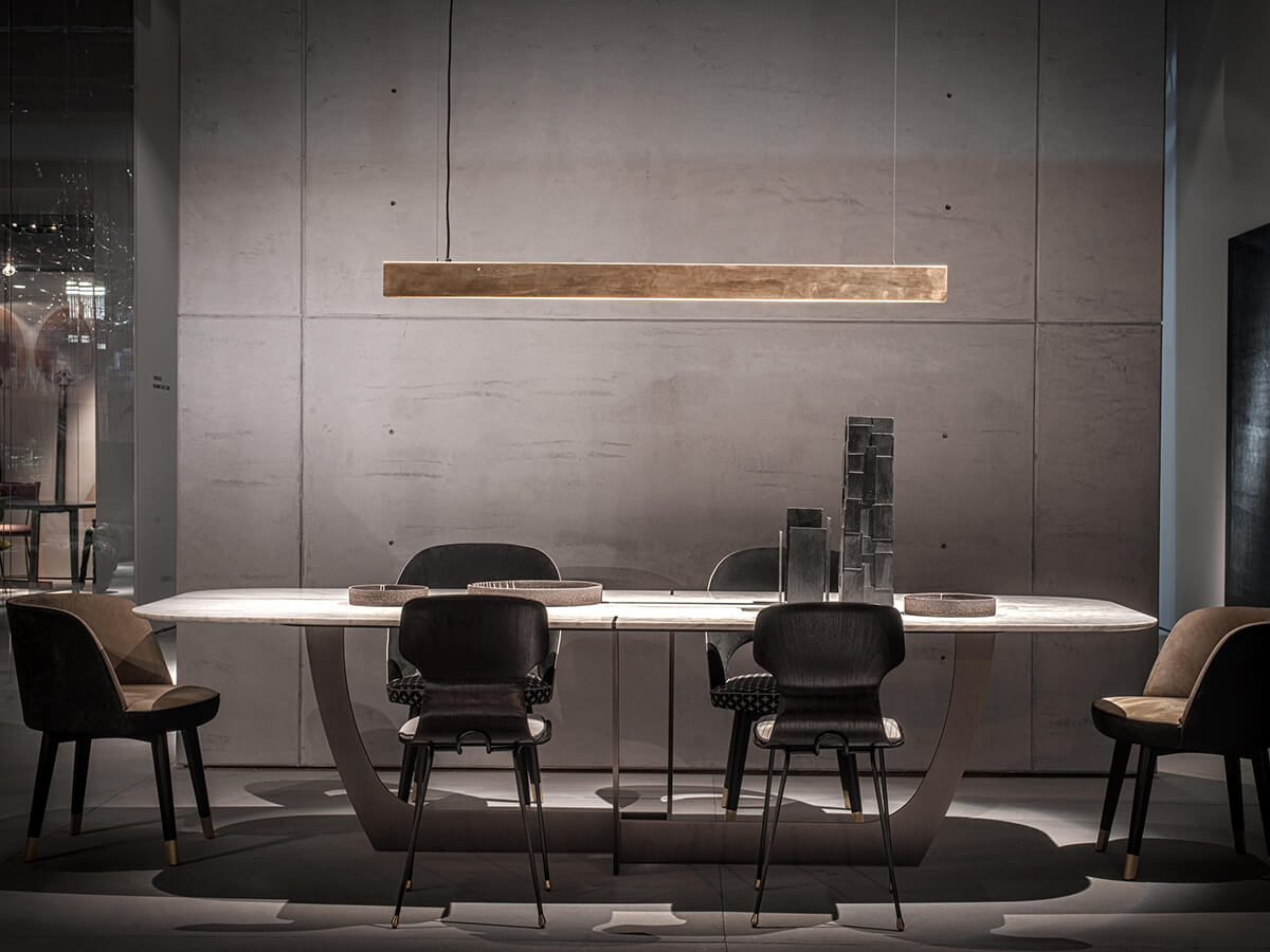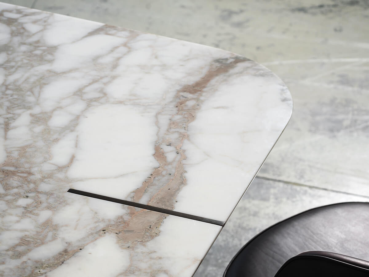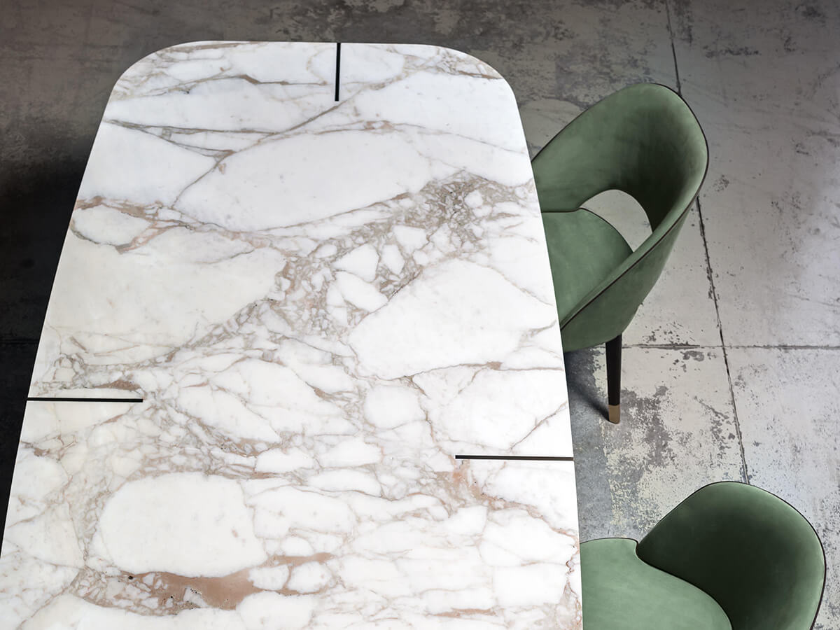 A table with a strongly evocative design, which starts off inspired by the keel of a ship thanks to the superb interweaving of the supporting legs. The base is in metal, working according to different inspirations, and formed by four different supports intertwined in the center so as to in turn form a strong and extremely balanced structure. The overlying top is in stone with water-repellent protective oil. These rich variations serve to enhance the very shapes of the worked design so as to be slightly elliptical or square, with rounded corners.