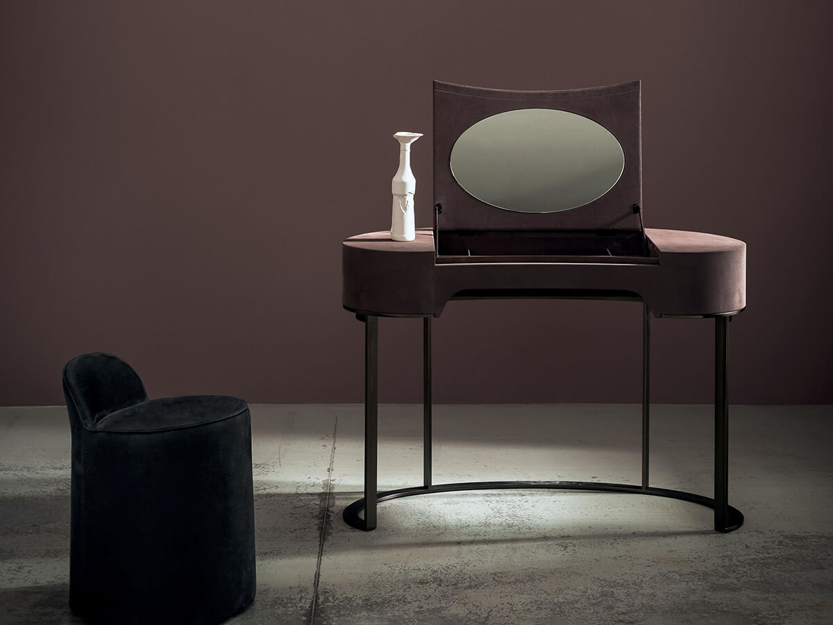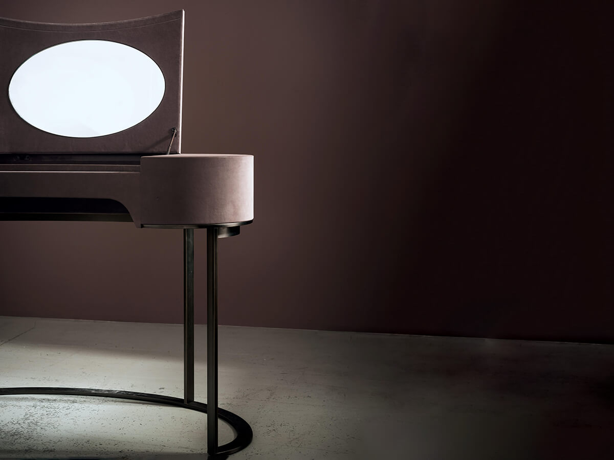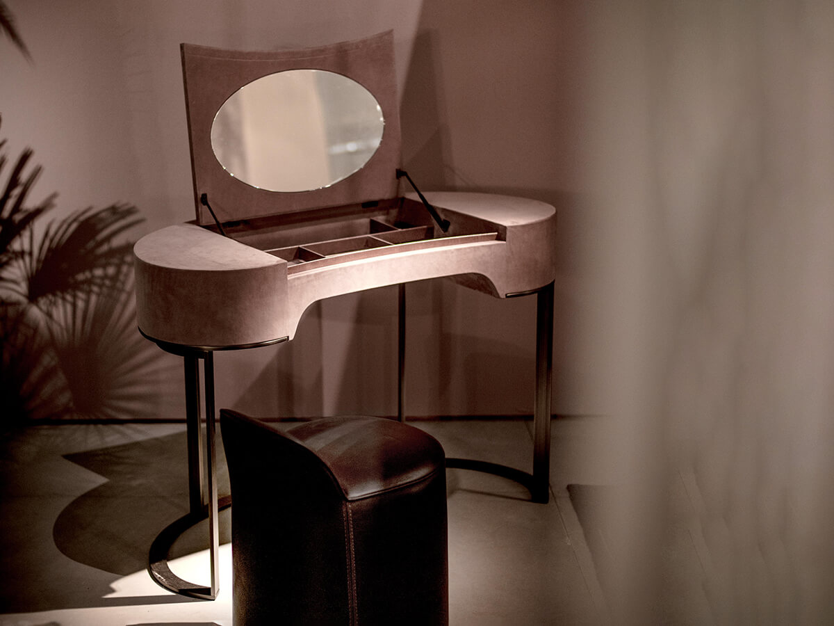Yves is a multipurpose desk, able to conform according to taste or need in multiple declinations designed to meet the needs of contemporary living. His pure and essential nature places him well in any context and environment of the house, without ever being excessive or inappropriate. The base in satin brass-plated metal supports the MDF structure with Baxter leather upholstery. The numerous color proposals accentuate the personal character of this desk. In the dressing table version, it offers a folding top with oval mirror, an ideal complement for the sleeping area or private spaces where you want to have an intimate space for self-care.* Technical features: folding top with oval mirror