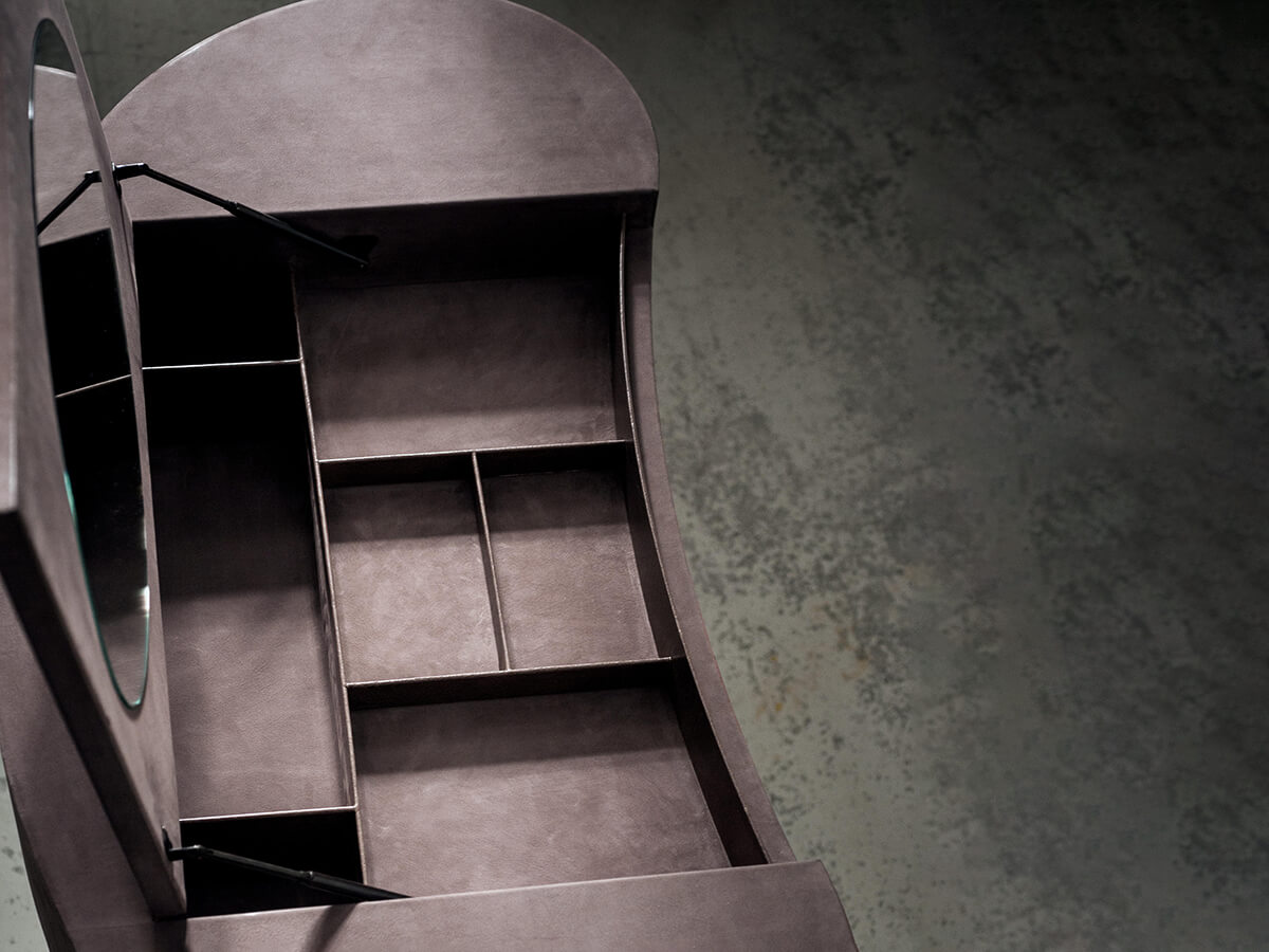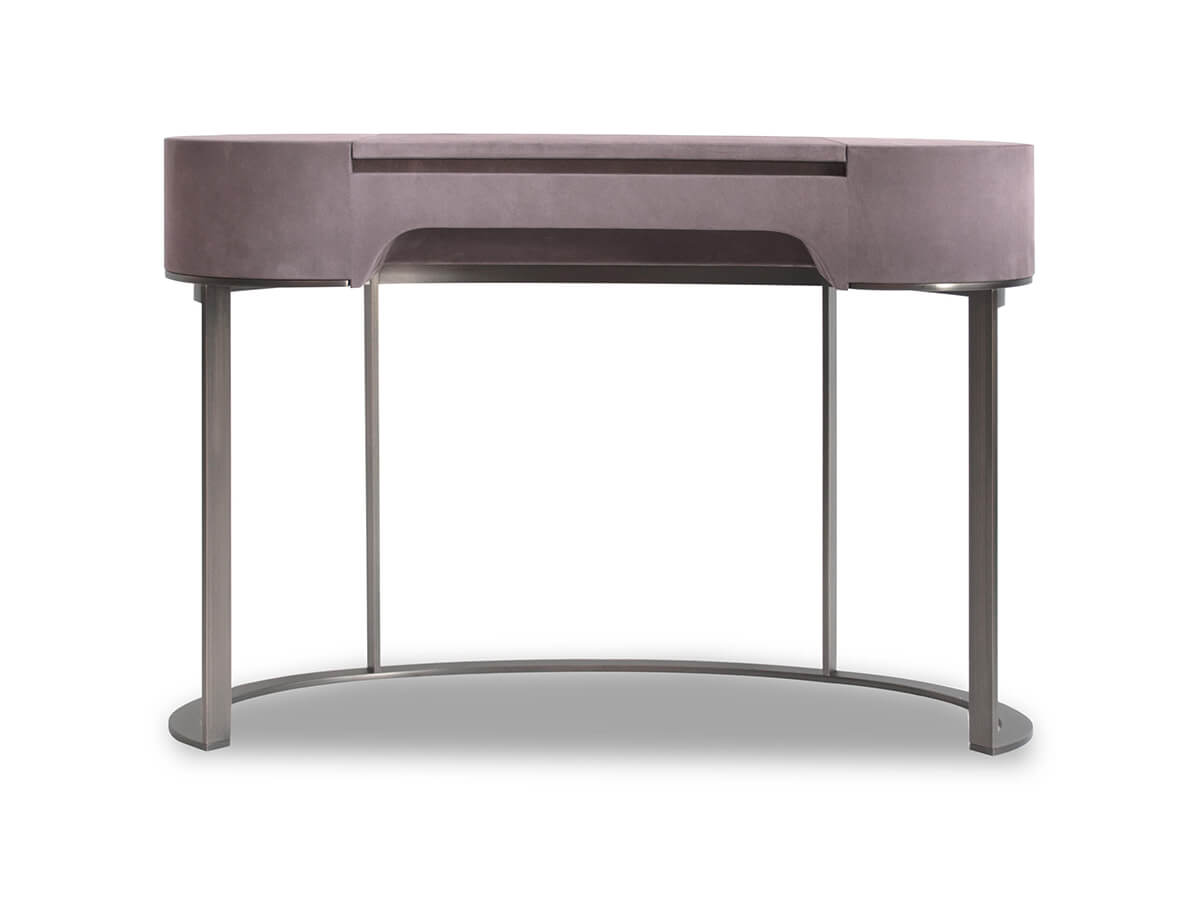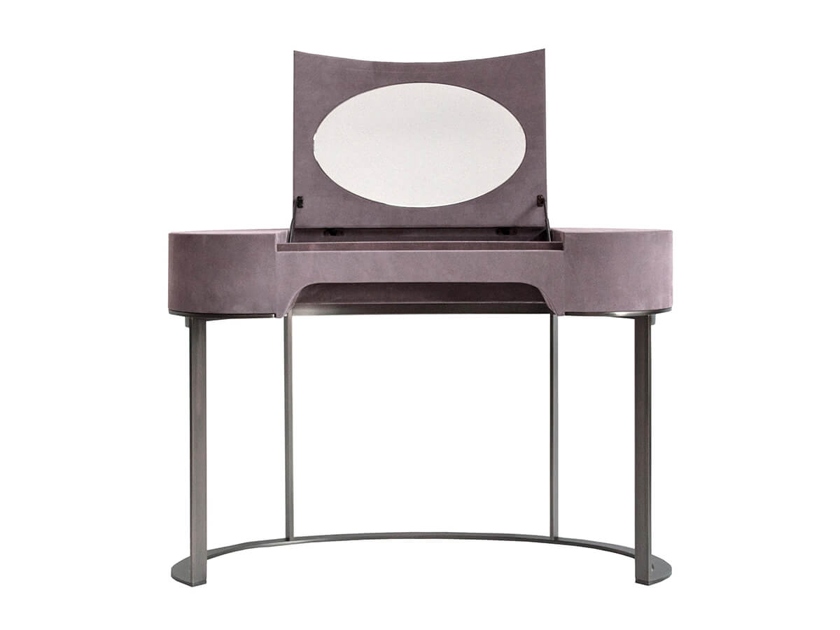 Yves is a multipurpose desk, able to conform according to taste or need in multiple declinations designed to meet the needs of contemporary living. His pure and essential nature places him well in any context and environment of the house, without ever being excessive or inappropriate. The base in satin brass-plated metal supports the MDF structure with Baxter leather upholstery. The numerous color proposals accentuate the personal character of this desk. In the dressing table version, it offers a folding top with oval mirror, an ideal complement for the sleeping area or private spaces where you want to have an intimate space for self-care.* Technical features: folding top with oval mirror