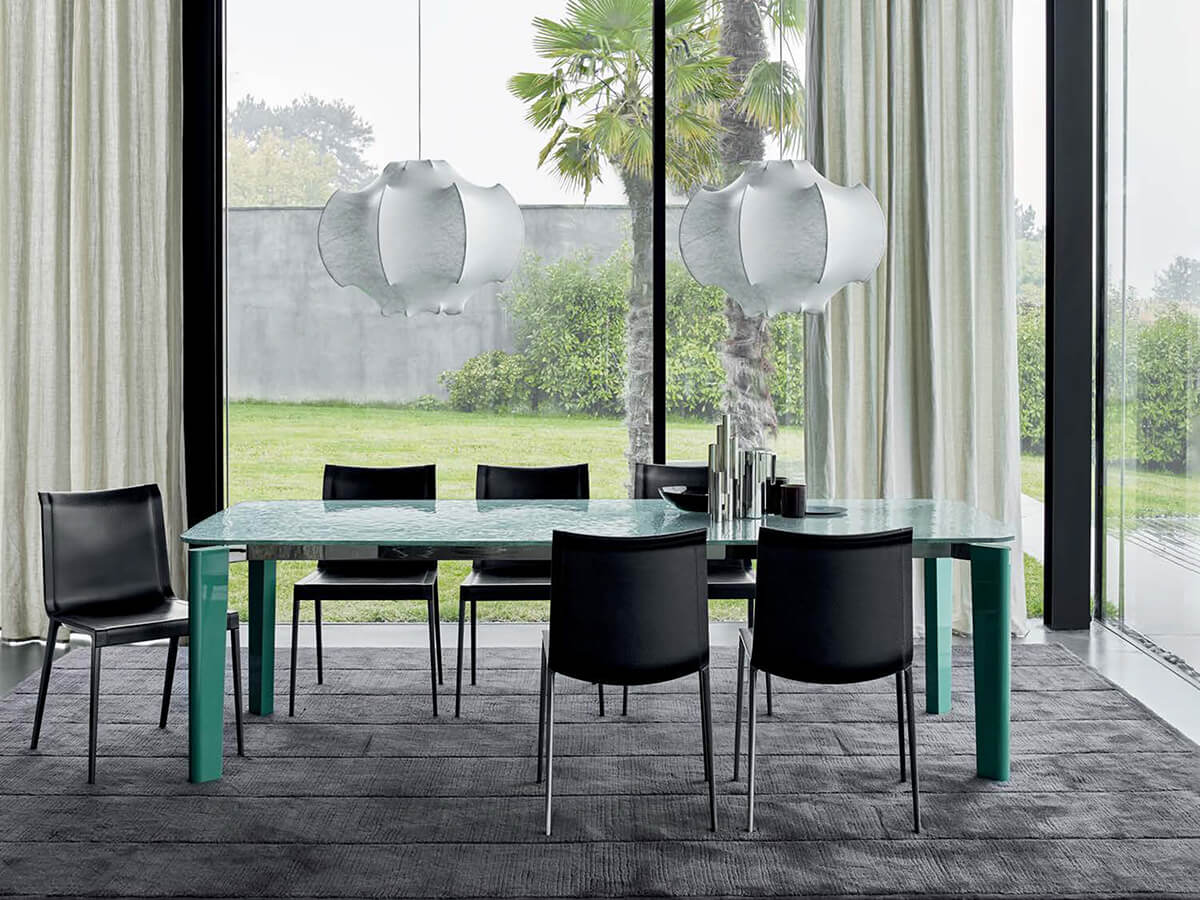 An architectural vision of the common dining table gave birth to Oskar, a piece of furniture where elegance and design refinement are intertwined in a highly suggestive piece of furniture. The homage to the architect Oscar Niemeyer is evident not only from his name, but from the very choice of creating a structure that is both fluid, sensual and material. The most obvious reference consists in the use of cathedral glass. The uncooled sheet is placed on top of a metal plate with an imperfect surface. Numerous other finishes of the same suggestion are available to expand the possibilities of choice according to taste. The legs in solid beech support the entire structure in the raised eye thanks to the particular processing of the grafts.* Technical features: glass top available in green cathedral finish