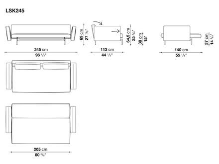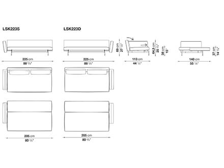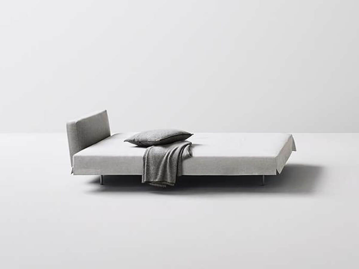 The Saké sofa was born from the idea of a light and welcoming upholstery, but above all with a distinctive elegance that leaves nothing to chance. Piero Lissoni designs it using thin steel feet to lift it from the ground and give it a strongly contemporary flavor. The seat in three dimensions, armrests and backrests with a linear or enveloping shape, in various sizes, conform in different solutions adaptable to space and needs, thus making Saké a unique and extremely versatile piece. From the seating system, B&B Italia has also created the sofa bed version, a perfect example of functional transversality. In this guise, the armrest, right or left, takes on the function of a headboard, while the backrest folds down to accommodate the single bed.