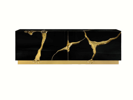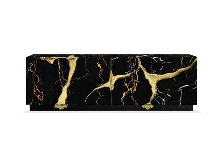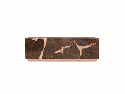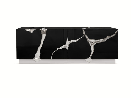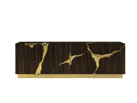 The Lapiaz sideboard features an exceptionally elegant and sophisticated design, which mixes high-level aesthetic research with craftsmanship that focuses on the richness of details. Lapiaz draws inspiration from ancient karst formations, obtained by manually inserting polished brass and a stainless steel mirror finish from which a perfect surface is obtained. Doors and drawers are in different shapes and open onto differentiated compartments in poplar root veneered wood. The hammered gold details and the reflective facade perfectly match sophisticated and extremely elegant spaces where you want to add a touch of abstraction and beauty. Ideal for living environments, it can also find space in public situations such as hotels and reception areas.