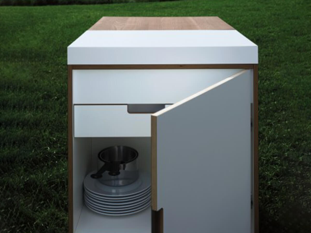 Joe Colombo's Minikitchen kitchen is one of the most iconic projects in the Boffi catalog. Conceived in 1963, it is proposed as a very compact portable kitchen, capable of enclosing all the material needed for cooking in a single cube.The Minikitchen Outdoor version takes Joe Colombo's original intuition of a "nomadic cuisine" to its extremes, allowing it to be used even in covered outdoor environments. Suitable for cooking on the veranda or in the garden, or perfect for use on a yacht, this variant is made of marine plywood panel covered in white or black Lasermat and can include a protective cover made of nautical technical fabric. to protect it from atmospheric agents when not in use.