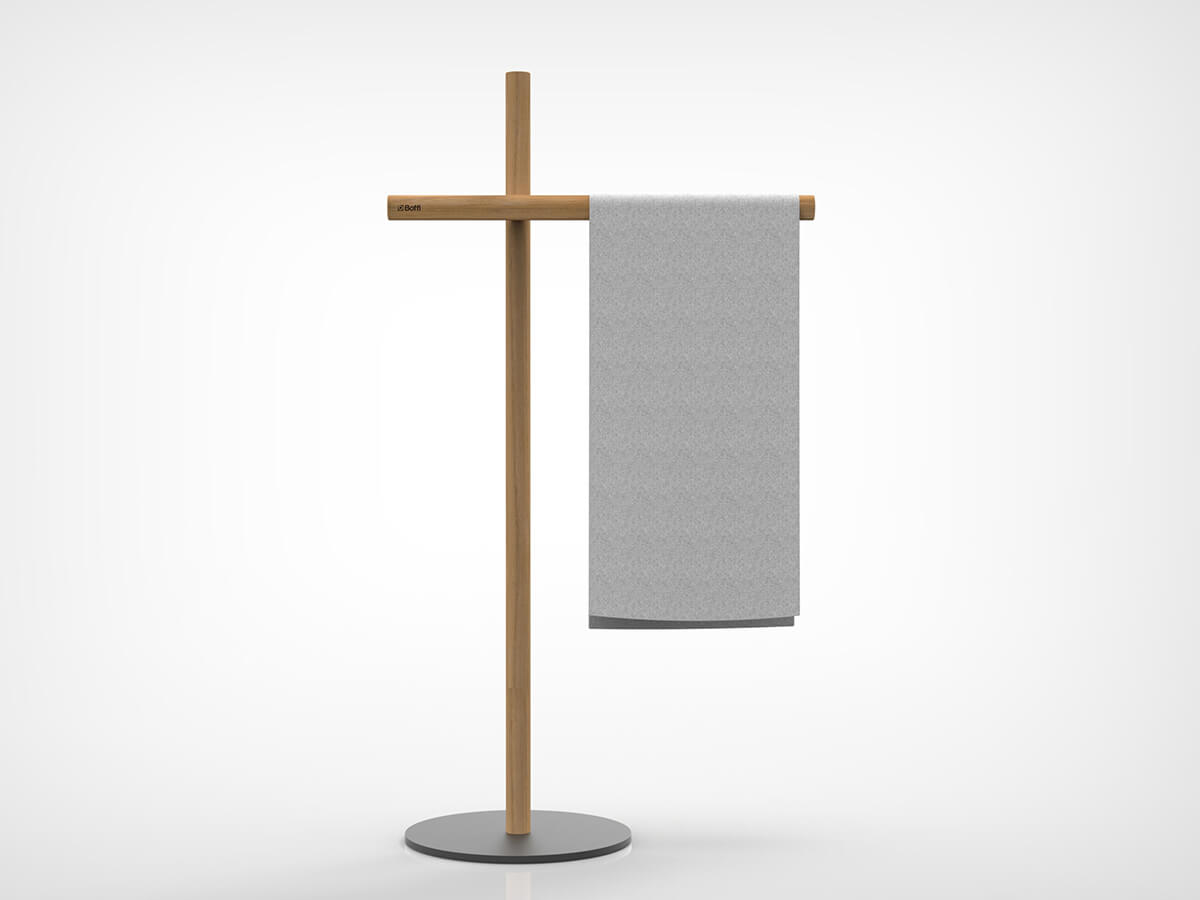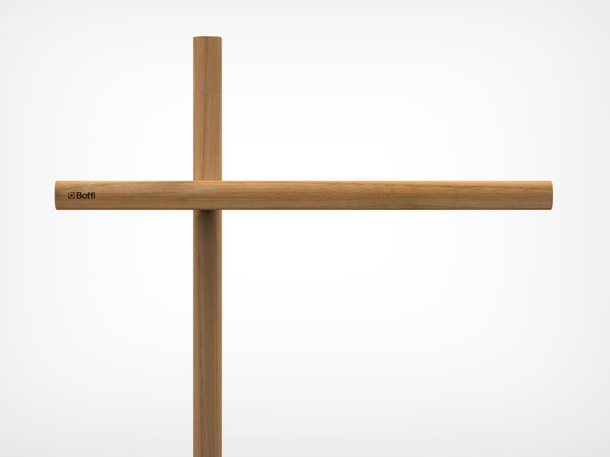 The Twig bathroom accessories series, designed for Boffi by Keiji Takeuchi, is characterized by the extensive use of light wood which gives its various elements a natural and harmonious look. Designed for a welcoming and ecological bathroom, Twig combines elements in solid Iroko wood with tops in white Cristalplant, with a pleasant contrasting effect. It consists of a very wide range of accessories of all types, from roll holders attached to the wall to soap holders, from discreet hooks for wall-mounted towels to toothbrush holders and toilet brush holders with essential lines. In particular, a free standing towel rail is proposed here, whose arms make up an elegant cross, a small bathroom table and an essential clothes rail on the wall.