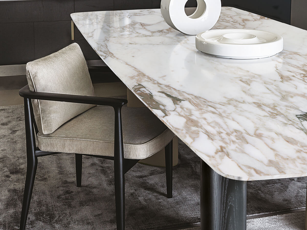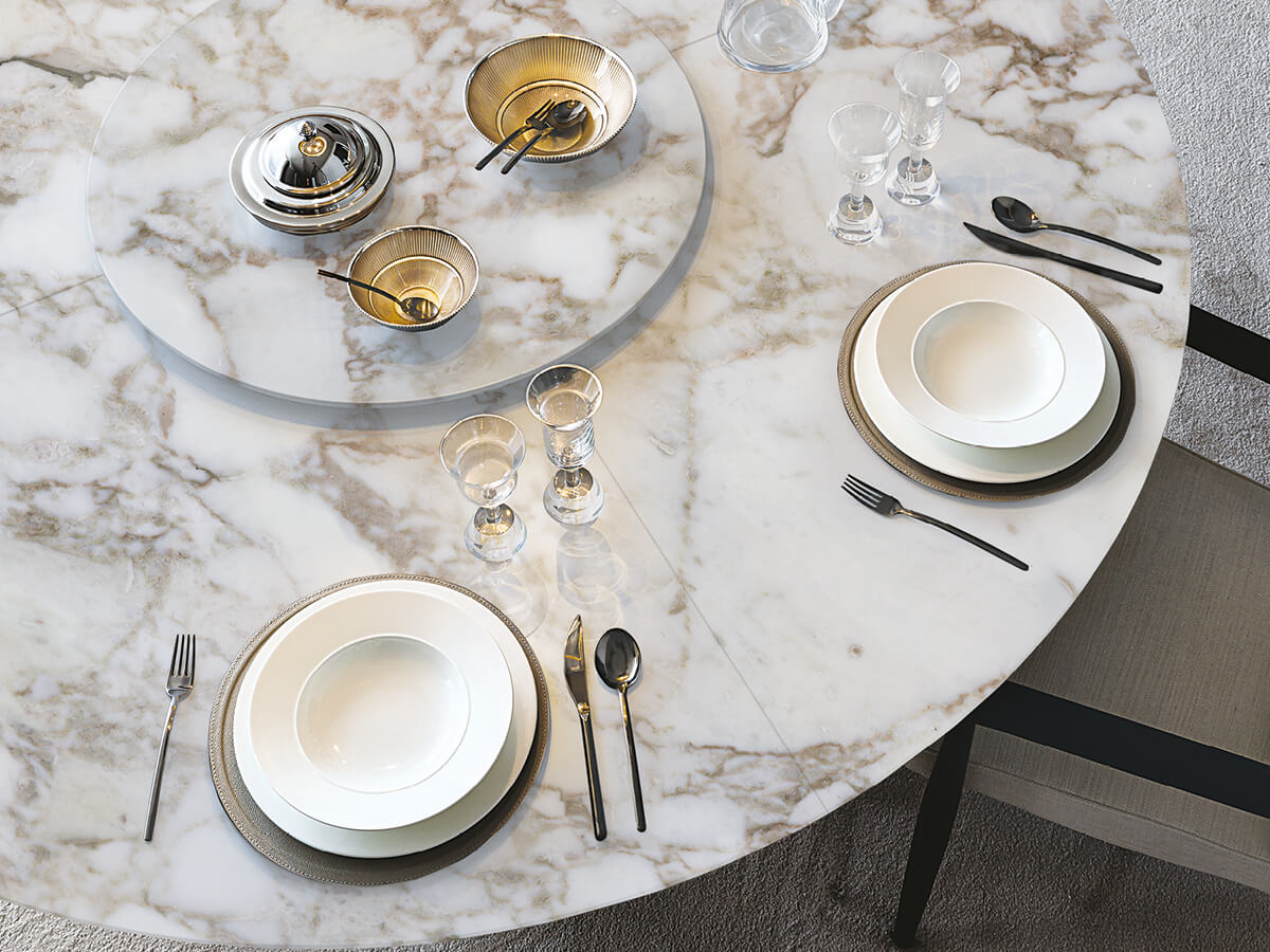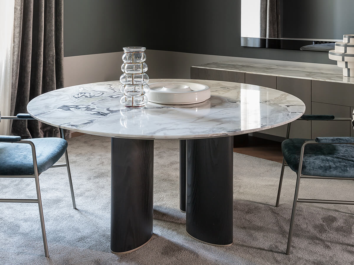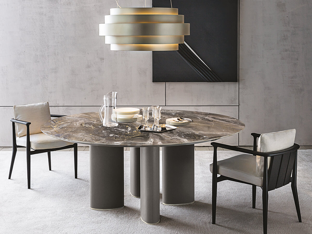 Arne is part of a family of modular tables with a characteristic and extremely elegant cut, capable of offering an extremely precious alternative to the furnishing of the living room or dining area for the oval legs covered in leather with tailored stitching or in wood, embellished with tips in painted steel. No less relevant are the available tops, of various sizes and shapes (round, oval and rectangular) whose marble material allows extreme customization of each piece. Arne is a table of extreme beauty and expressiveness, versatile and yet capable of catalyzing the gaze. Ideal is the Lazy Susan complement, a functional marble swivel tray, to be placed in the center of the round table.