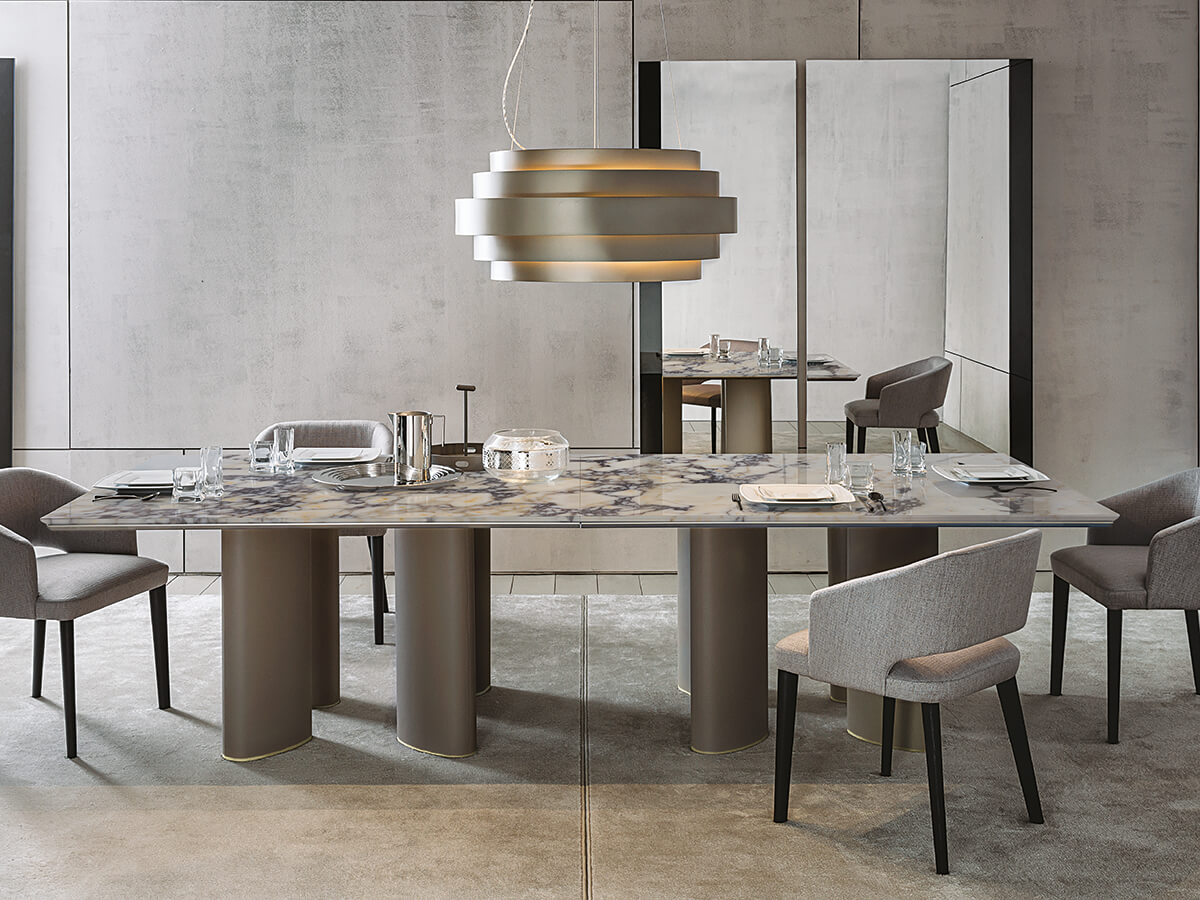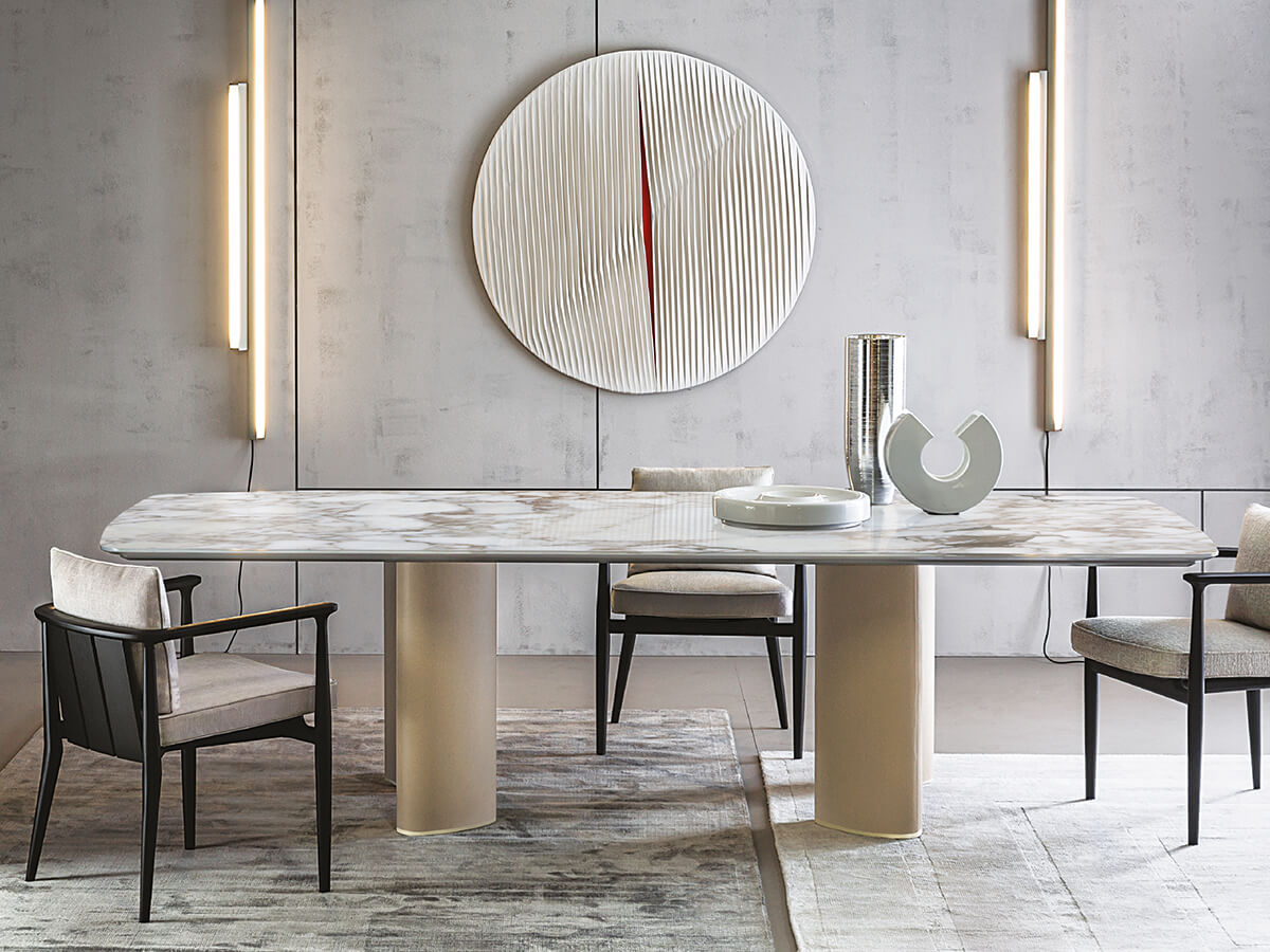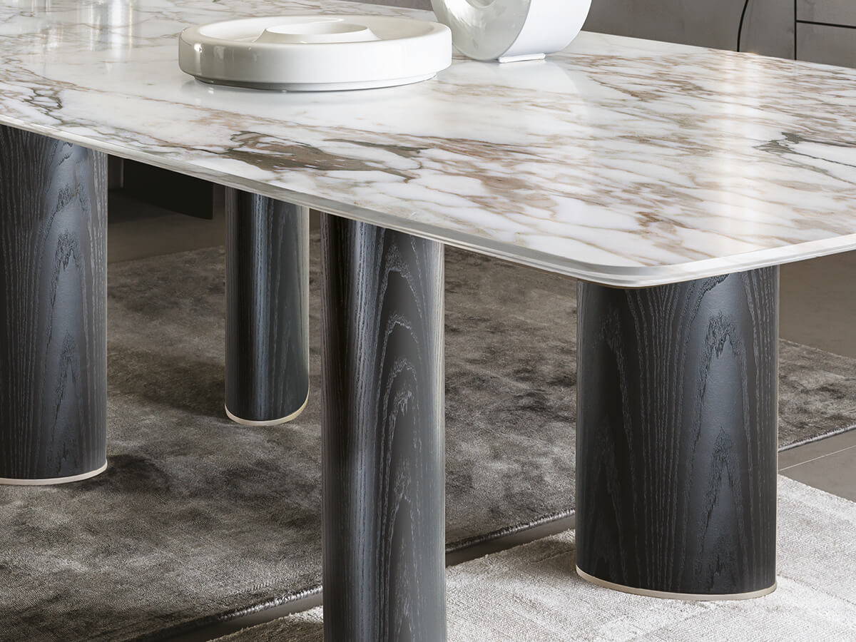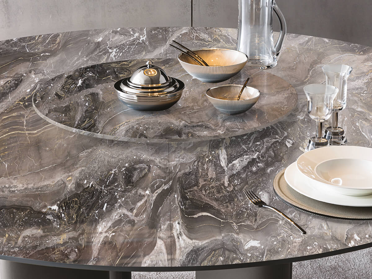 Arne is part of a family of modular tables with a characteristic and extremely elegant cut, capable of offering an extremely precious alternative to the furnishing of the living room or dining area for the oval legs covered in leather with tailored stitching or in wood, embellished with tips in painted steel. No less relevant are the available tops, of various sizes and shapes (round, oval and rectangular) whose marble material allows extreme customization of each piece. Arne is a table of extreme beauty and expressiveness, versatile and yet capable of catalyzing the gaze. Ideal is the Lazy Susan complement, a functional marble swivel tray, to be placed in the center of the round table.