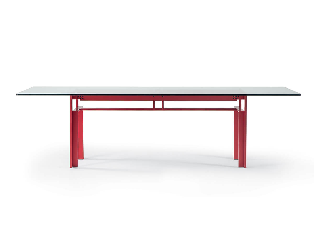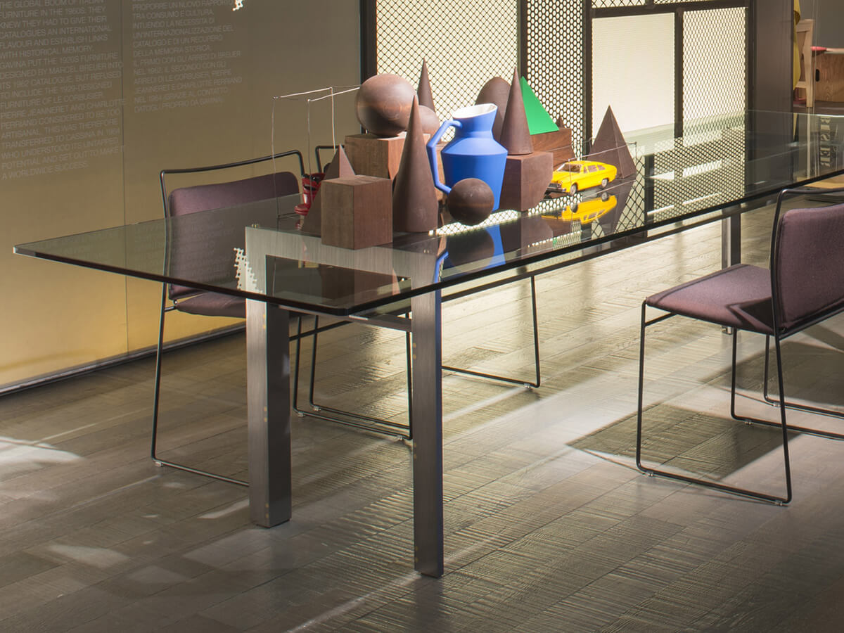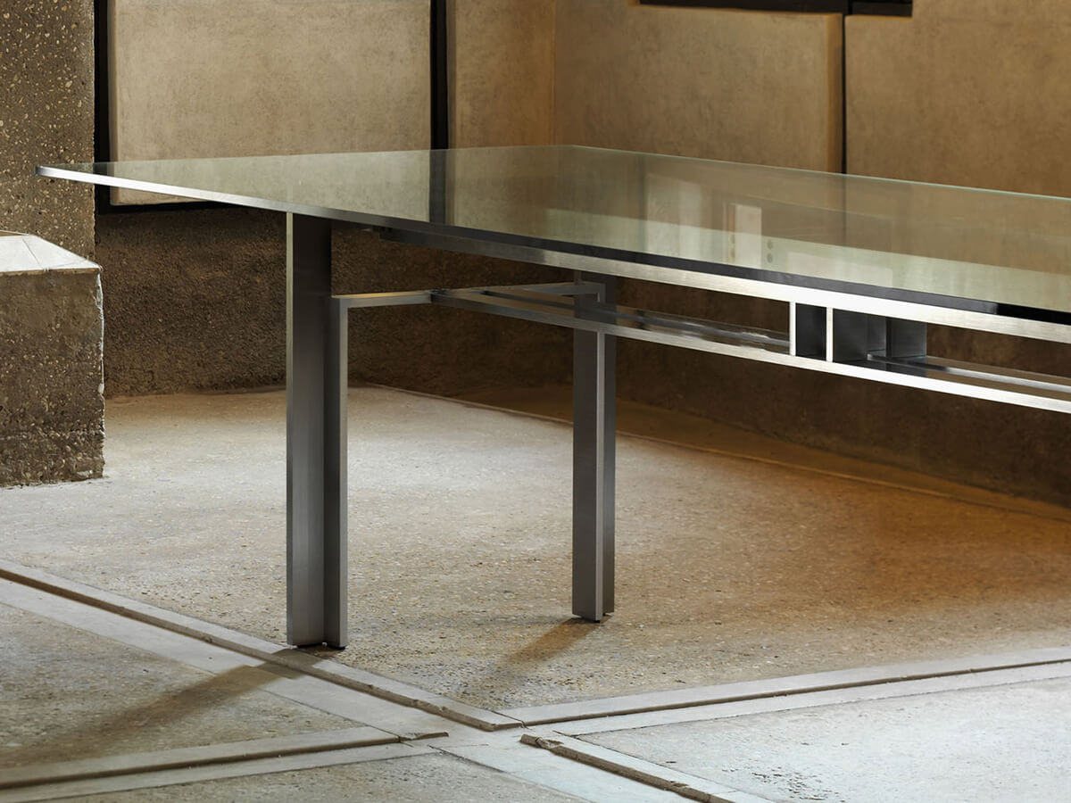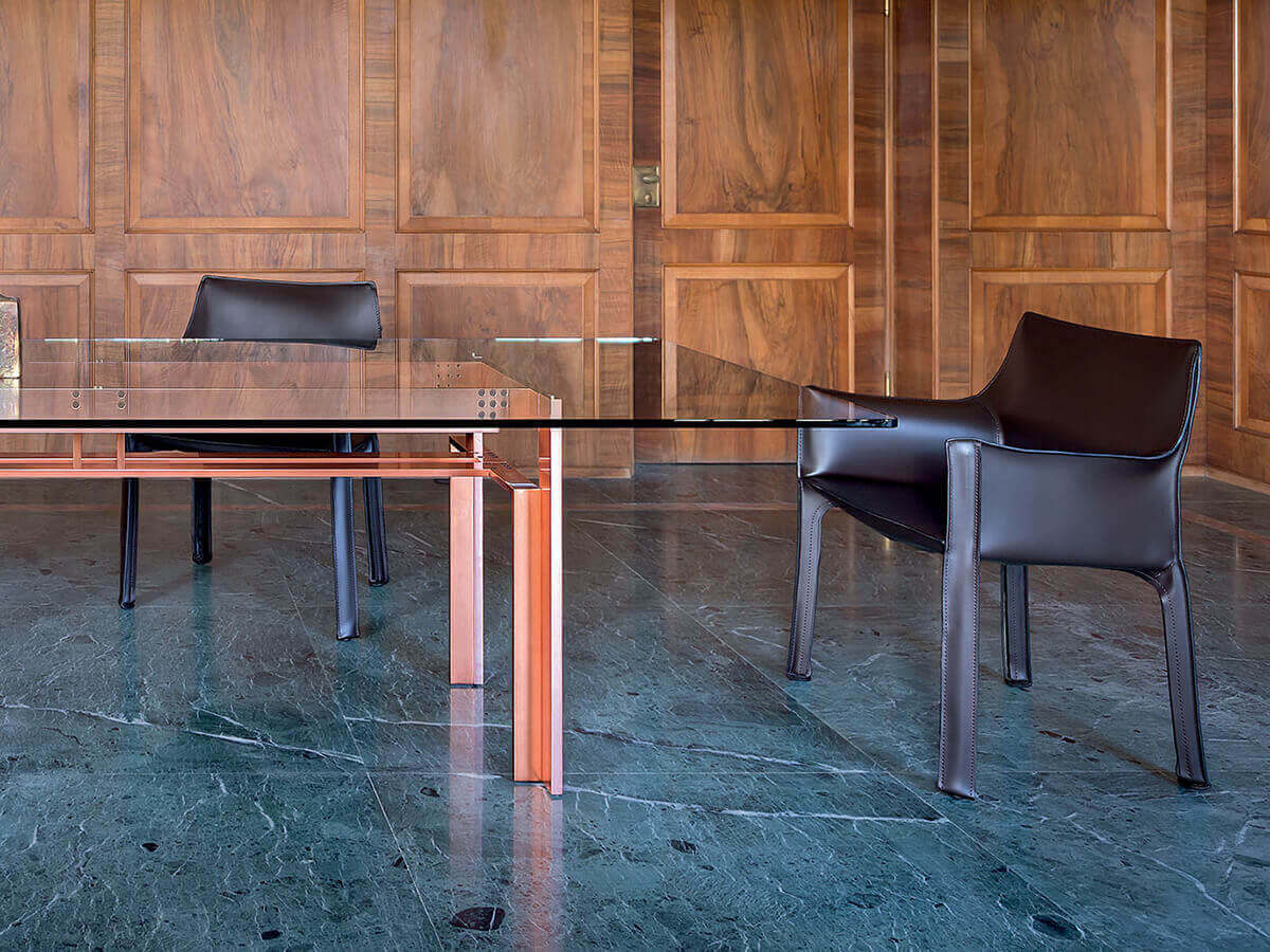 The Doge table is a masterpiece of Italian design, born from a sculptural structure that became an emblem of the Ultra-rational movement that in the 1960s managed to overcome the limits imposed by the rationalist current thanks to the recovery of traditional aesthetic values. This model is part of the SimonCollezione, later updated thanks to the introduction of new treatments and materials developed as part of the C90 Mutations program. The architectural base defined by thick flat profiles constitutes the soul of the table, further enriched by the detail of the support elements visible thanks to the transparency of the glass. An object of great value, to which is added Cassina's absolute aesthetic and craftsmanship mastery in giving it the connotations of timeless furniture.