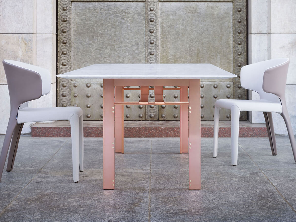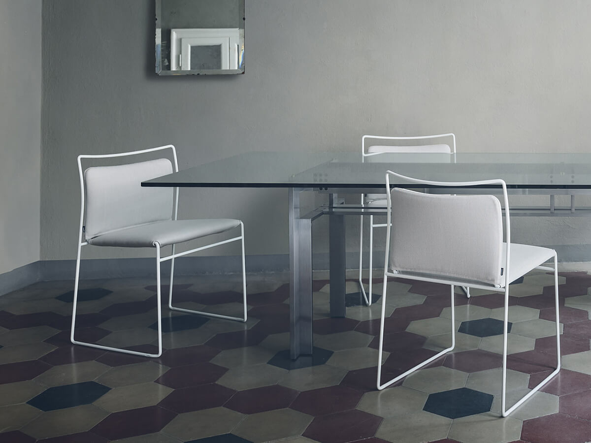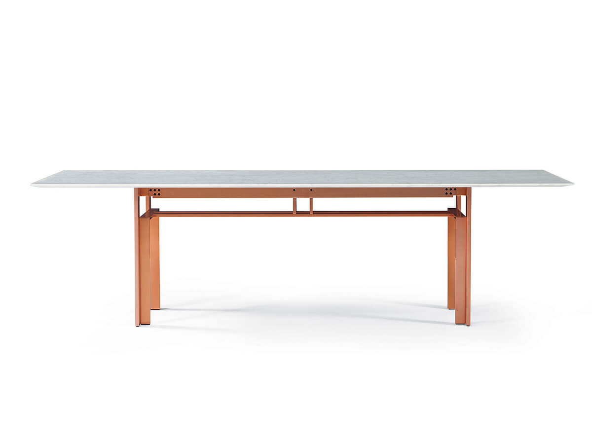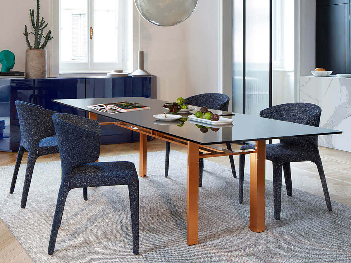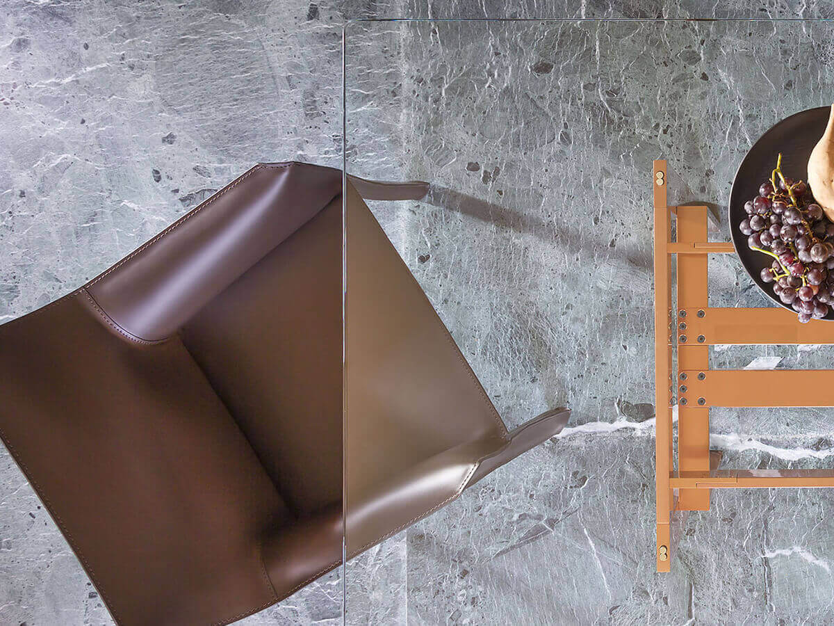 The Doge table is a masterpiece of Italian design, born from a sculptural structure that became an emblem of the Ultra-rational movement that in the 1960s managed to overcome the limits imposed by the rationalist current thanks to the recovery of traditional aesthetic values. This model is part of the SimonCollezione, later updated thanks to the introduction of new treatments and materials developed as part of the C90 Mutations program. The architectural base defined by thick flat profiles constitutes the soul of the table, further enriched by the detail of the support elements visible thanks to the transparency of the glass. An object of great value, to which is added Cassina's absolute aesthetic and craftsmanship mastery in giving it the connotations of timeless furniture.