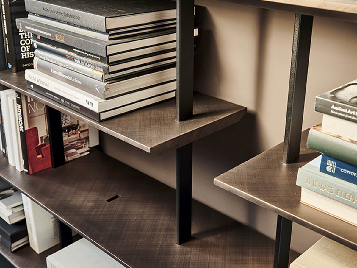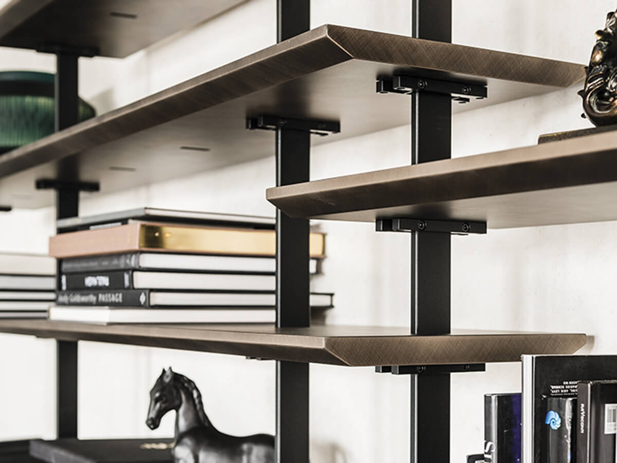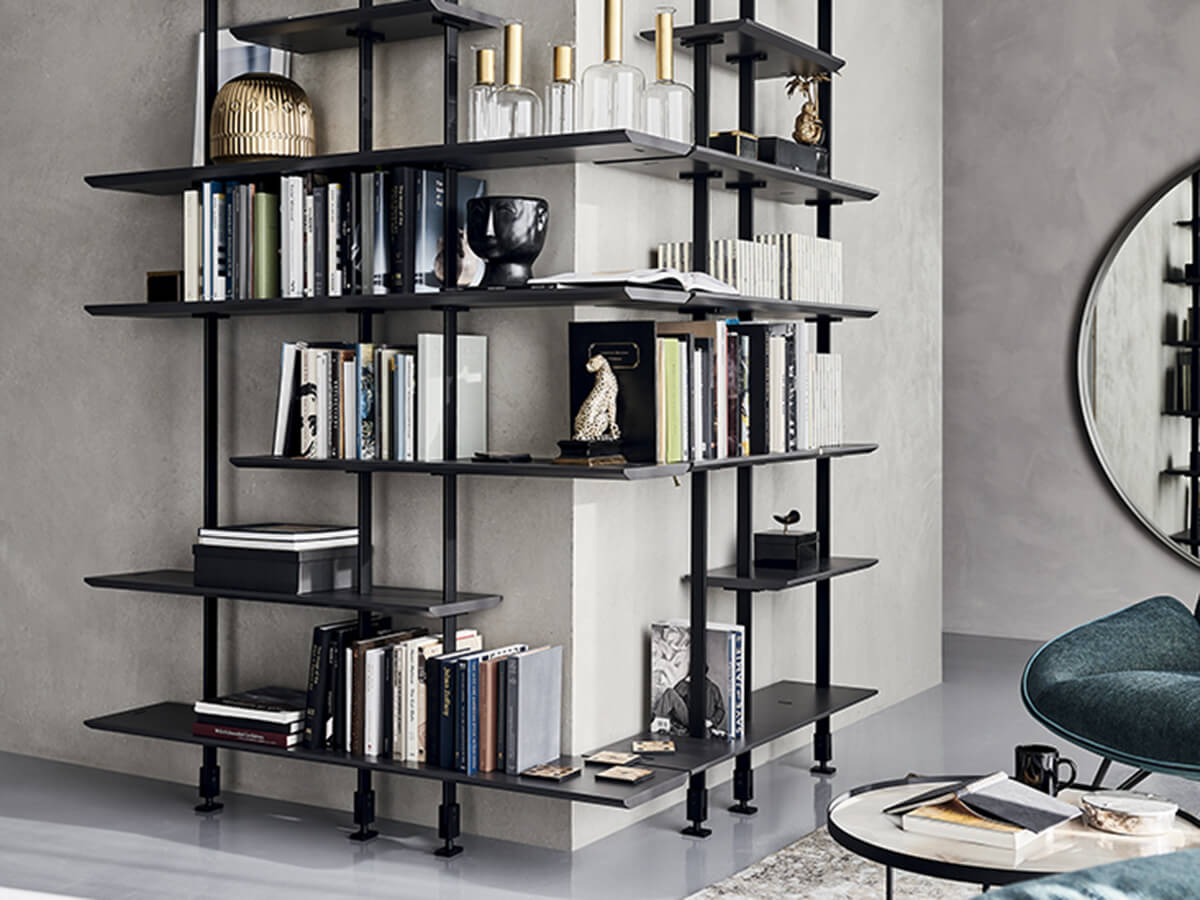 Ethereal and slender, the Airport bookshelves by Cattelan Italia stands out among the various pole bookcases available on the market for how it combines the sense of luxury typical of the brand's products with an impression of airy lightness. The thin uprights can go from floor to ceiling or be connected to the wall by means of brackets, thus giving rise to versatile and always new compositions enlivened by the dynamic effect of the shelves offset from each other. The ingenious technique underlying the system also allows it to be composed in an angular version, following the edge of the wall and acting as a link between different spaces. The uprights are available in different metal finishes, while shelves and containers can also be made in various essences and or in painted wood in various colors.