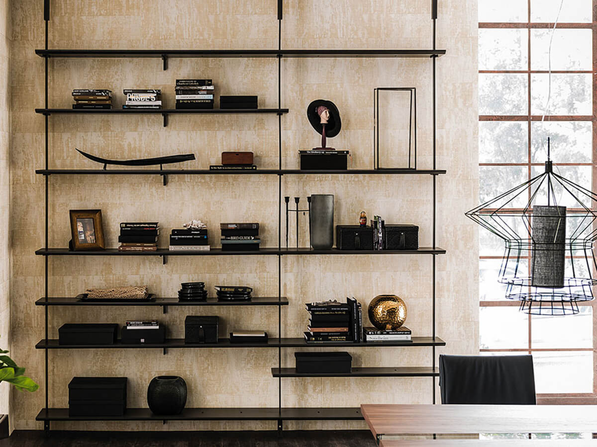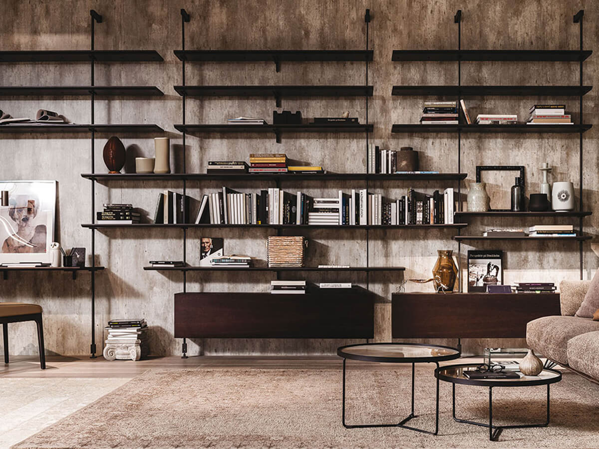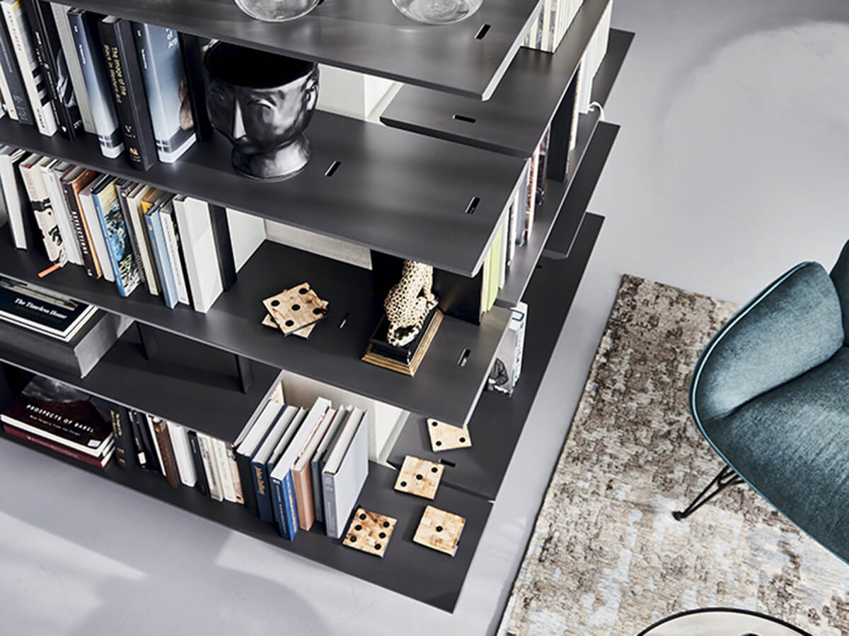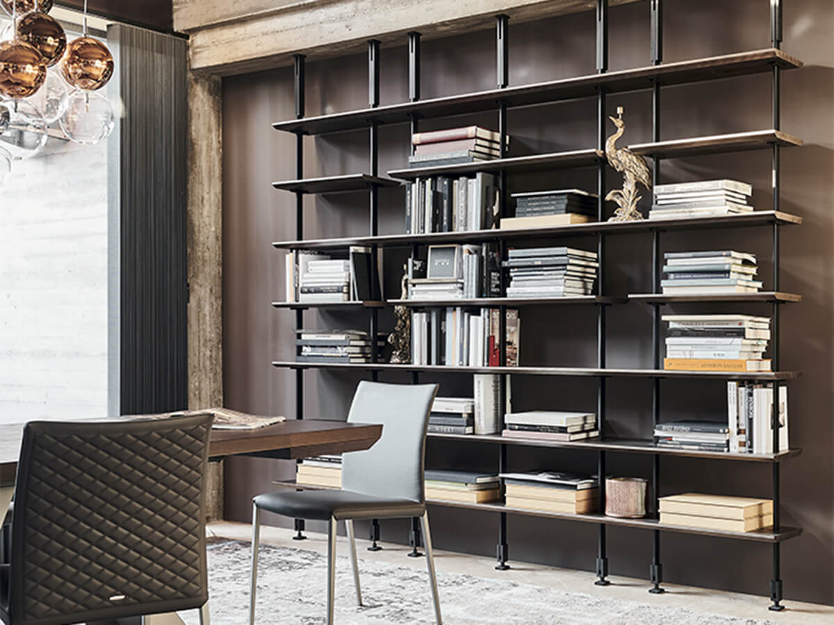 Ethereal and slender, the Airport bookshelves by Cattelan Italia stands out among the various pole bookcases available on the market for how it combines the sense of luxury typical of the brand's products with an impression of airy lightness. The thin uprights can go from floor to ceiling or be connected to the wall by means of brackets, thus giving rise to versatile and always new compositions enlivened by the dynamic effect of the shelves offset from each other. The ingenious technique underlying the system also allows it to be composed in an angular version, following the edge of the wall and acting as a link between different spaces. The uprights are available in different metal finishes, while shelves and containers can also be made in various essences and or in painted wood in various colors.
