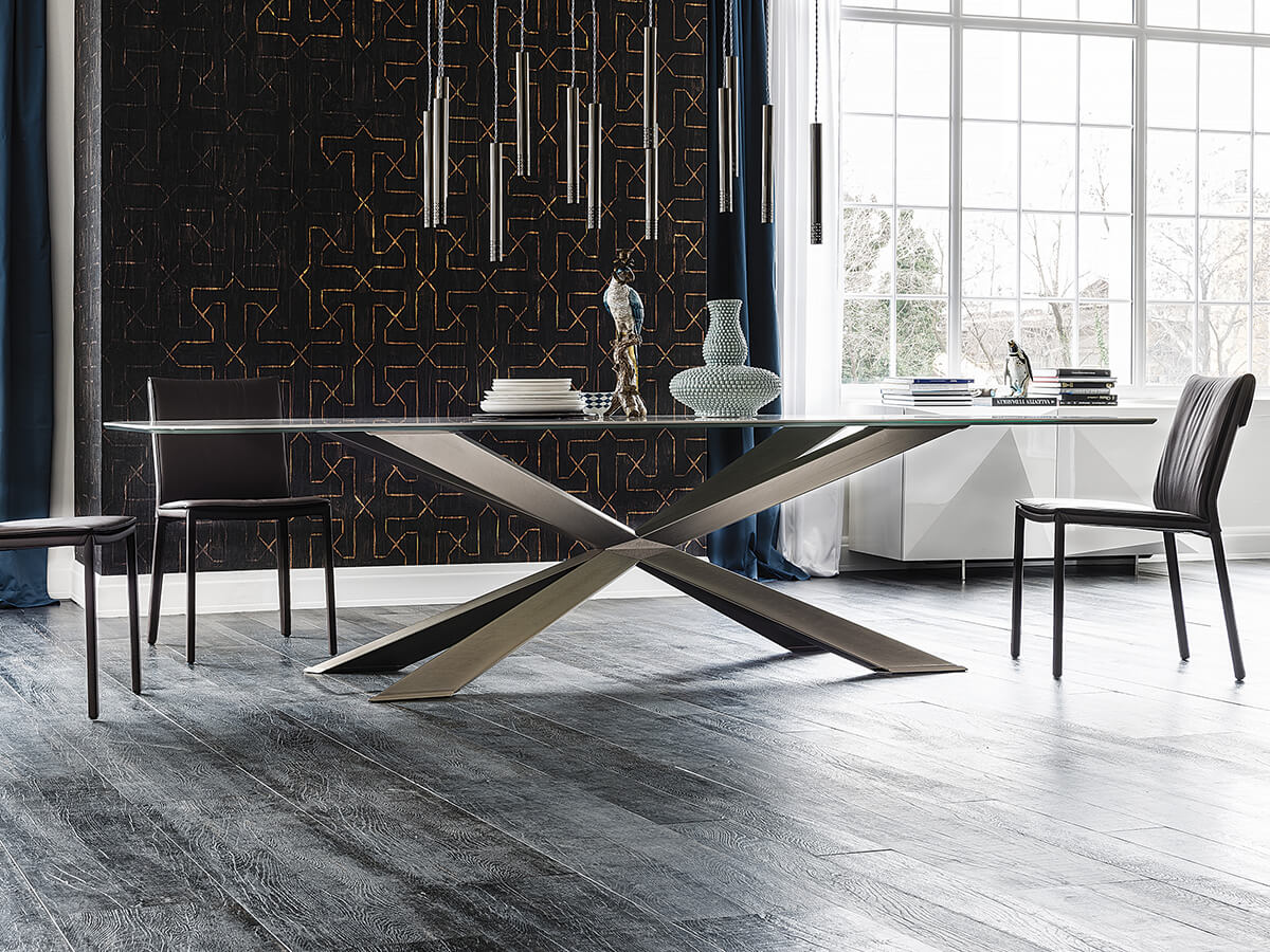 Spyder is a table with strongly geometric and rigorous shapes, able to arise the imagination and satisfy the taste of those who want to furnish the dining area or living room with a characterizing element. Spyder is characterized by the base available in different finishes including matt black, graphite, white, polished stainless steel, satin bronze and more, including Canaletto walnut and Heritage oak. The upper top is in 15 mm transparent glass, alternatively available in extra-clear transparent with reverse beveled edges. There are numerous alternatives of shape (round, square and rectangular) and dimensions, ideal for placing the Spyder wherever you wish. Technical features for the Wood version: top available in Canaletto walnut, burned oak or natural