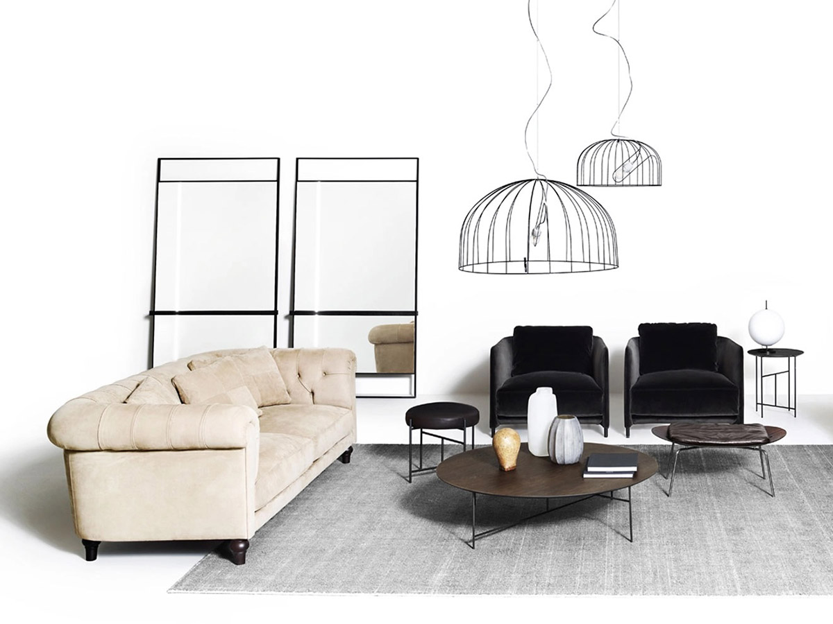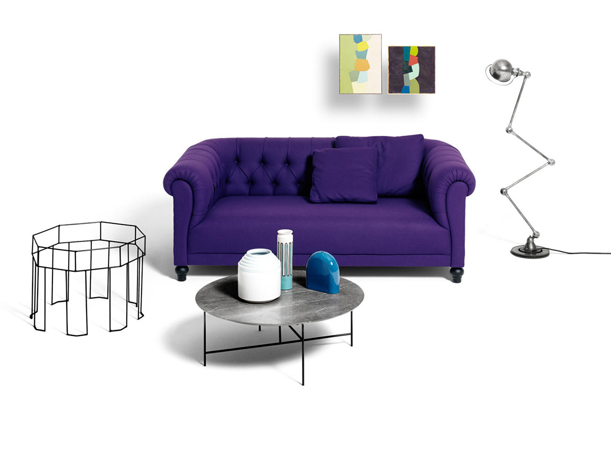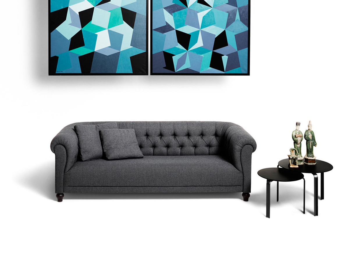 De Padova revisits a vintage classic, the iconic Chesterfield sofa, dressing it in a more modern and contemporary way. The shape of the most famous of living room sofas is here reprised by identifying the proportions of the armrests and backrest, the wooden feet and the unmistakable curl of the seat. The capitonné quilting is a must, a distinctive element that has survived over the years without ever losing its charm. The whole therefore re-presents known canons and styles, but adds a touch of new, modern, reprised not only by the finishes used but also by some stylistic details that make the difference.