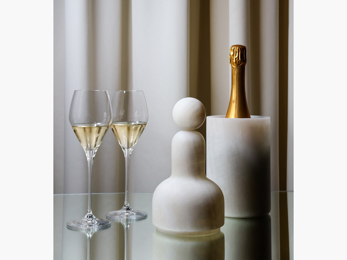 An object designed for the table, essential for all those who love to enjoy a good wine or a bottle of champagne at the right temperature or, even better, cold. Cooler G is a thermos designed to keep drinks cool thanks to the insulating internal coating. The external part is made of Grand Antique marble where you can admire black and white shades that intertwine in precious natural designs, housing the bottles and protecting against impacts and external agents.