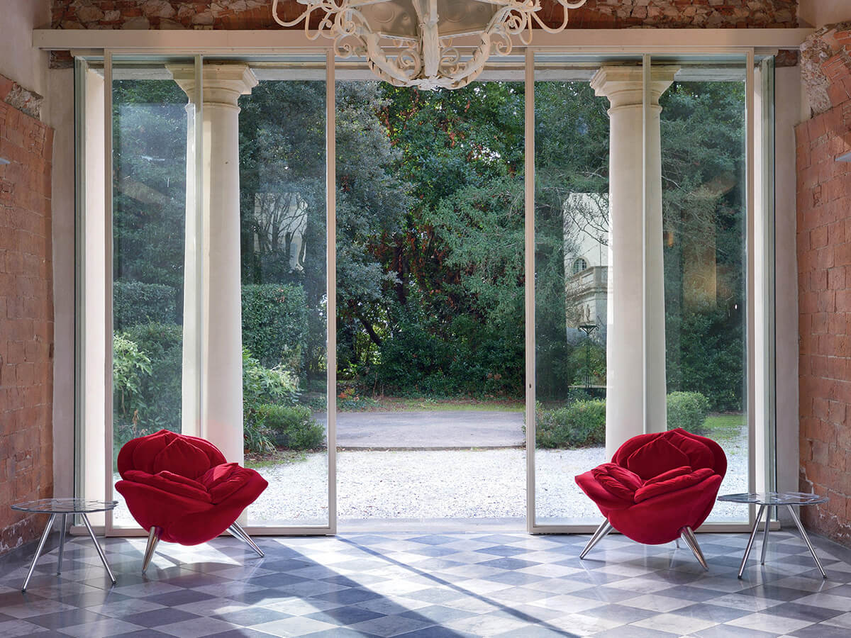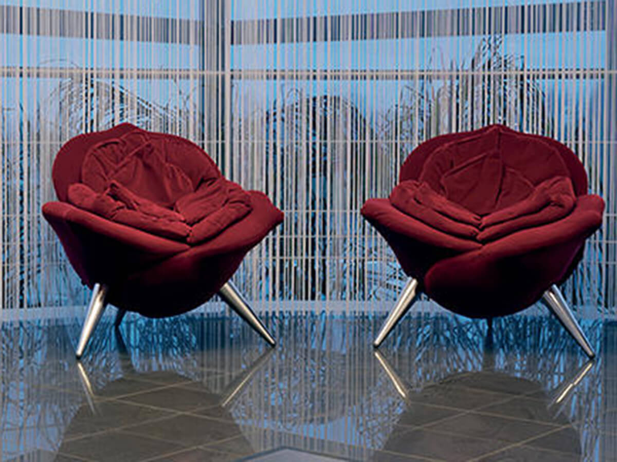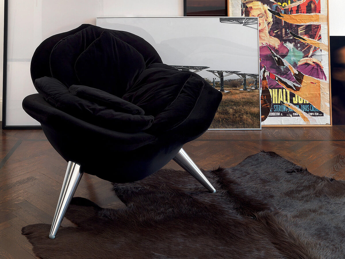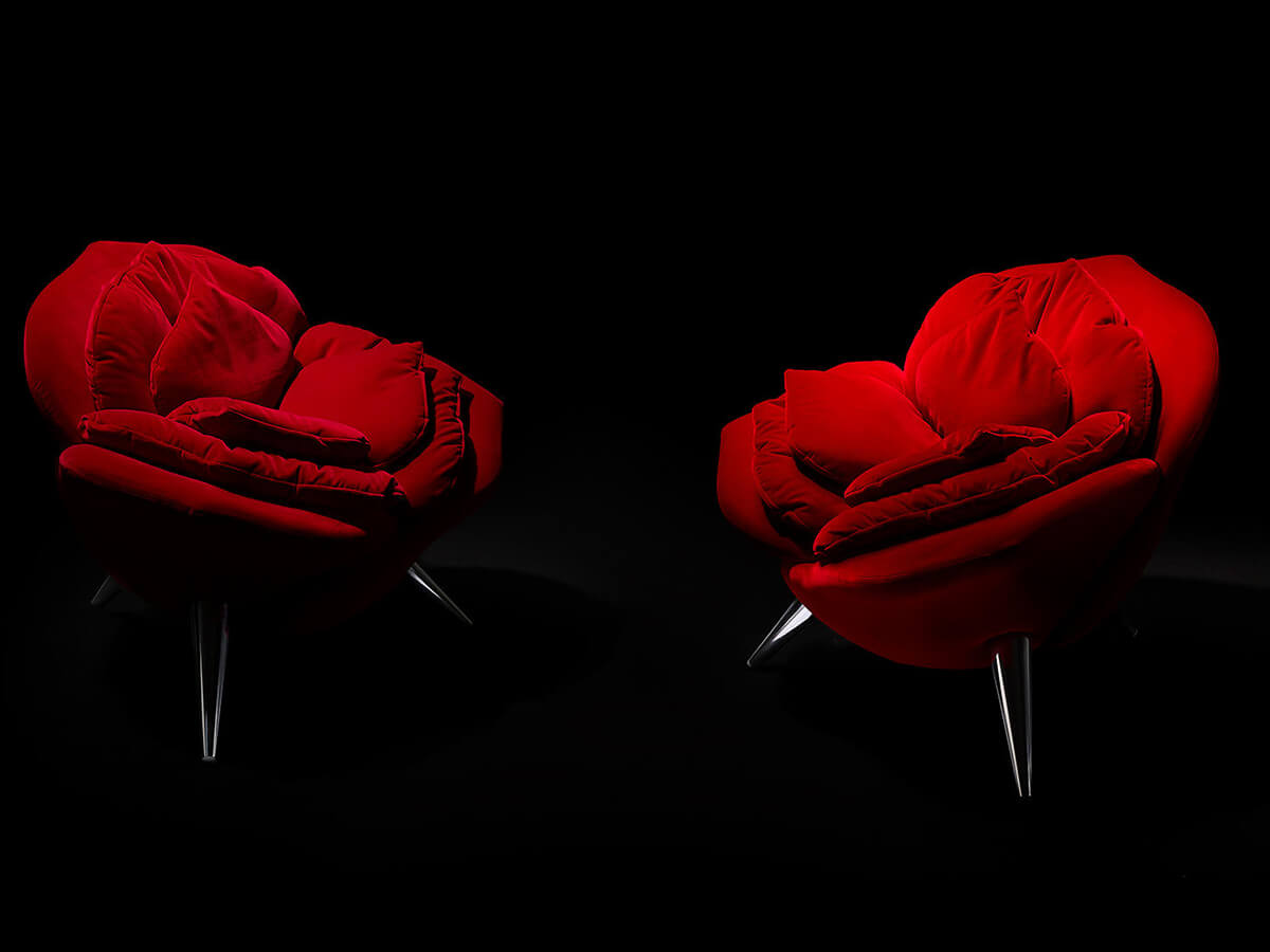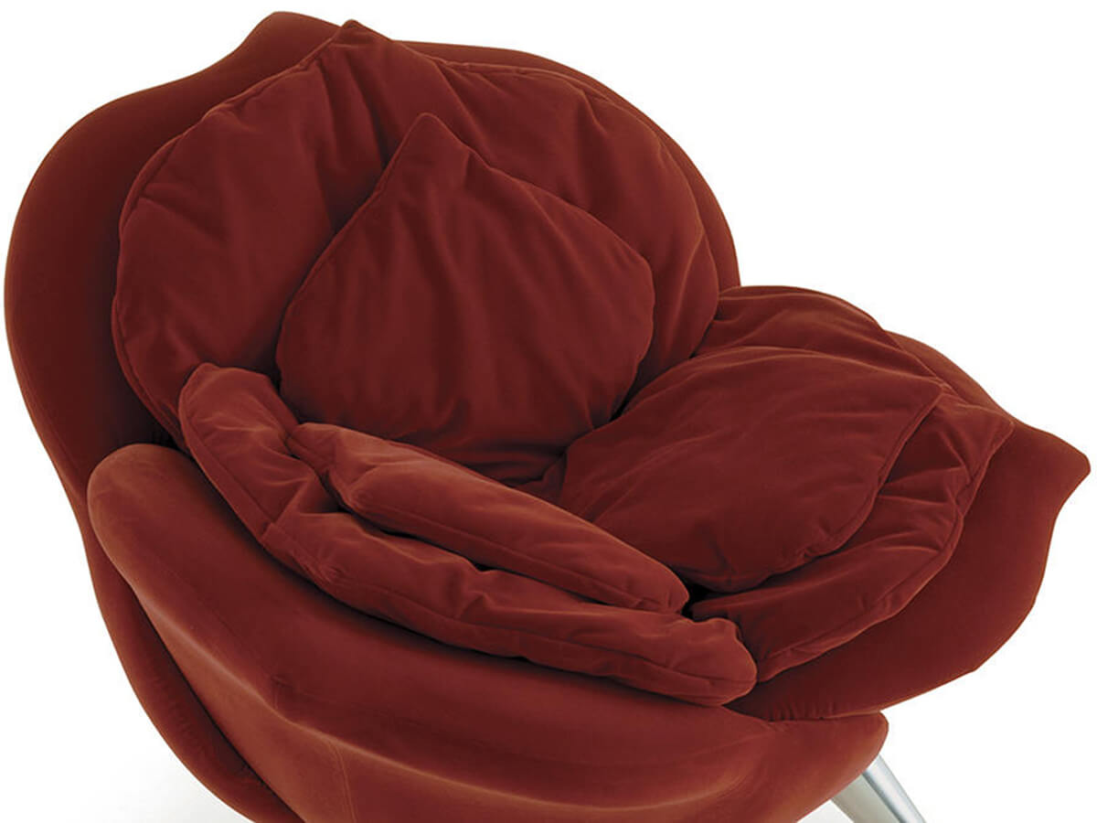 An armchair with an iconic design, capable of expressing a romantic ideal of design. Rose represents a rose-shaped velvet structure. The petals are the padding, shaped to create a comfortable support for the body. The realization is heavily based on manual skills, an essential element in every Edra furnishing element. Rose is available in different fabrics and coverings designed to enhance its shapes and emotions. Due to its peculiarity it adapts very well to private but also public contexts, placing itself as a focal point on which to attract attention.