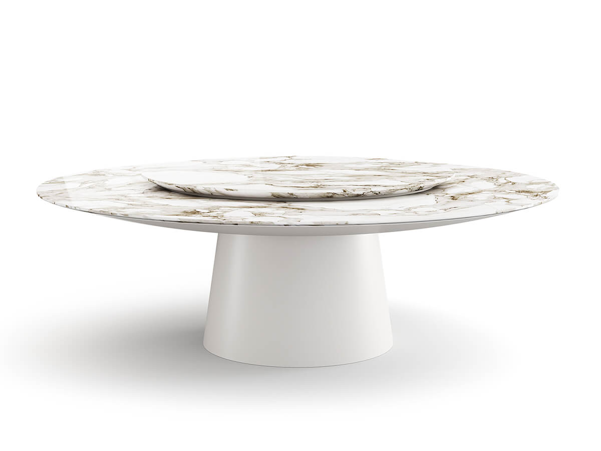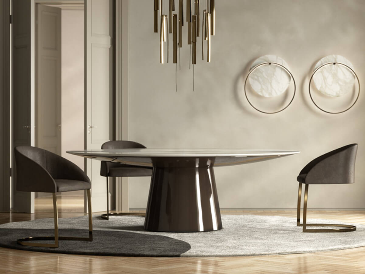 A table with innate elegance, capable of summarizing design research and aesthetic refinement in a single solid form. Ufo is a table with top and undertop completely made of plywood, as well as the base, covered with a strong and well-shaped cone. The top, on the other hand, can be in essence, with numerous possibilities for variations. Ideal for those looking for a modern touch within their dining or living spaces. Technical features: Classic version: top, base and undertop in glossy or matt lacquer; Full version: wooden top, base and undertop; Marble version: top in marble, undertop and base in glossy or matt lacquer Bronze version: undertop and base in cast bronze Brass version: undertop and base in cast brass