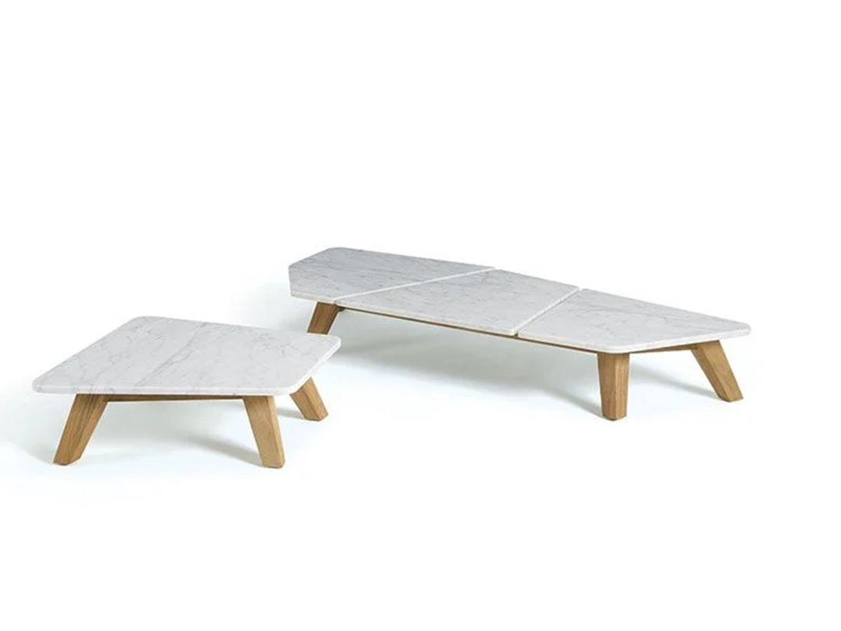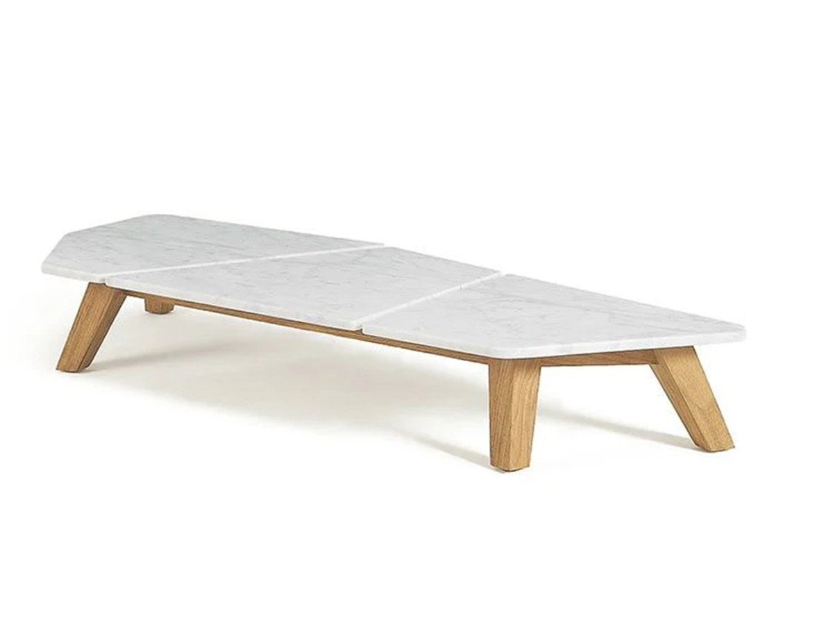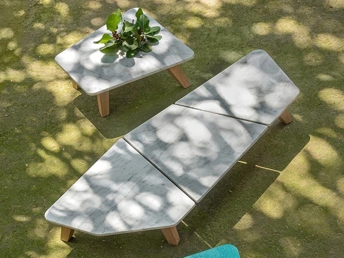 A low table with a minimal flavor, which has managed to make asymmetry its strong point, challenging conventions and reinventing the way of living life in the open air. Among the numerous outdoor proposals by Ethimo, Rafael stands out for the use of the stone that makes up the top and the texture where there is a strong air of craftsmanship and uniqueness. No less relevant, the use of marble contributes to creating a sophisticated and extremely material variant to the numerous proposals, offering enthusiasts a tasteful alternative that is difficult to imitate thanks to the uniqueness of the material used. The teak structure helps to create a certain balance between top and base, between naturalness and solidity in which Rafael lives.