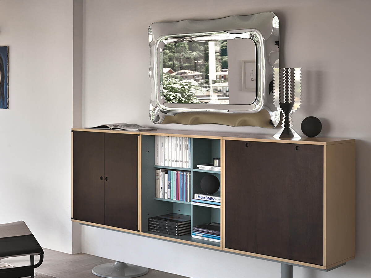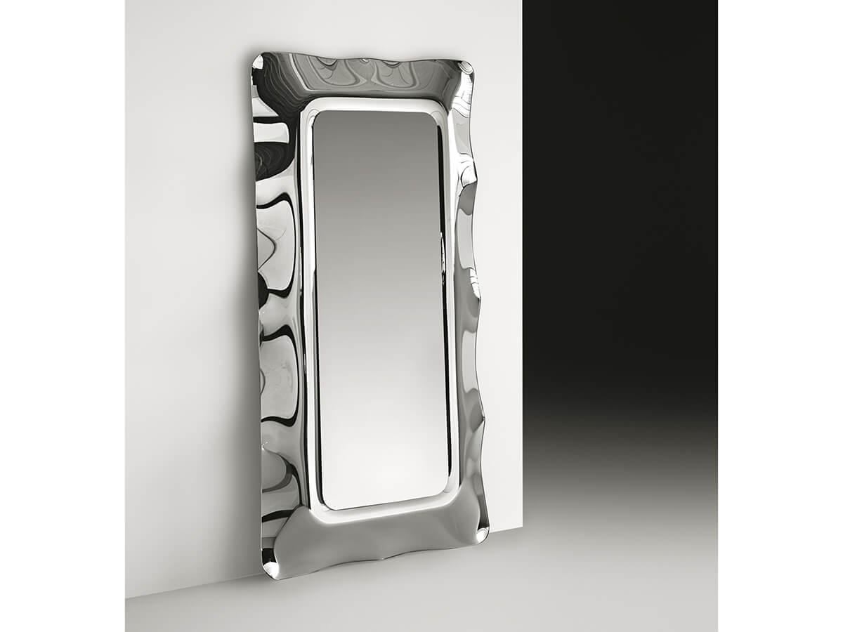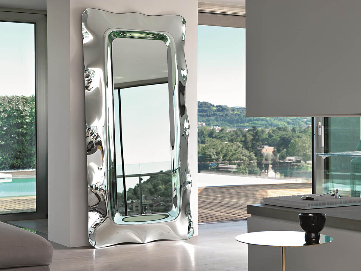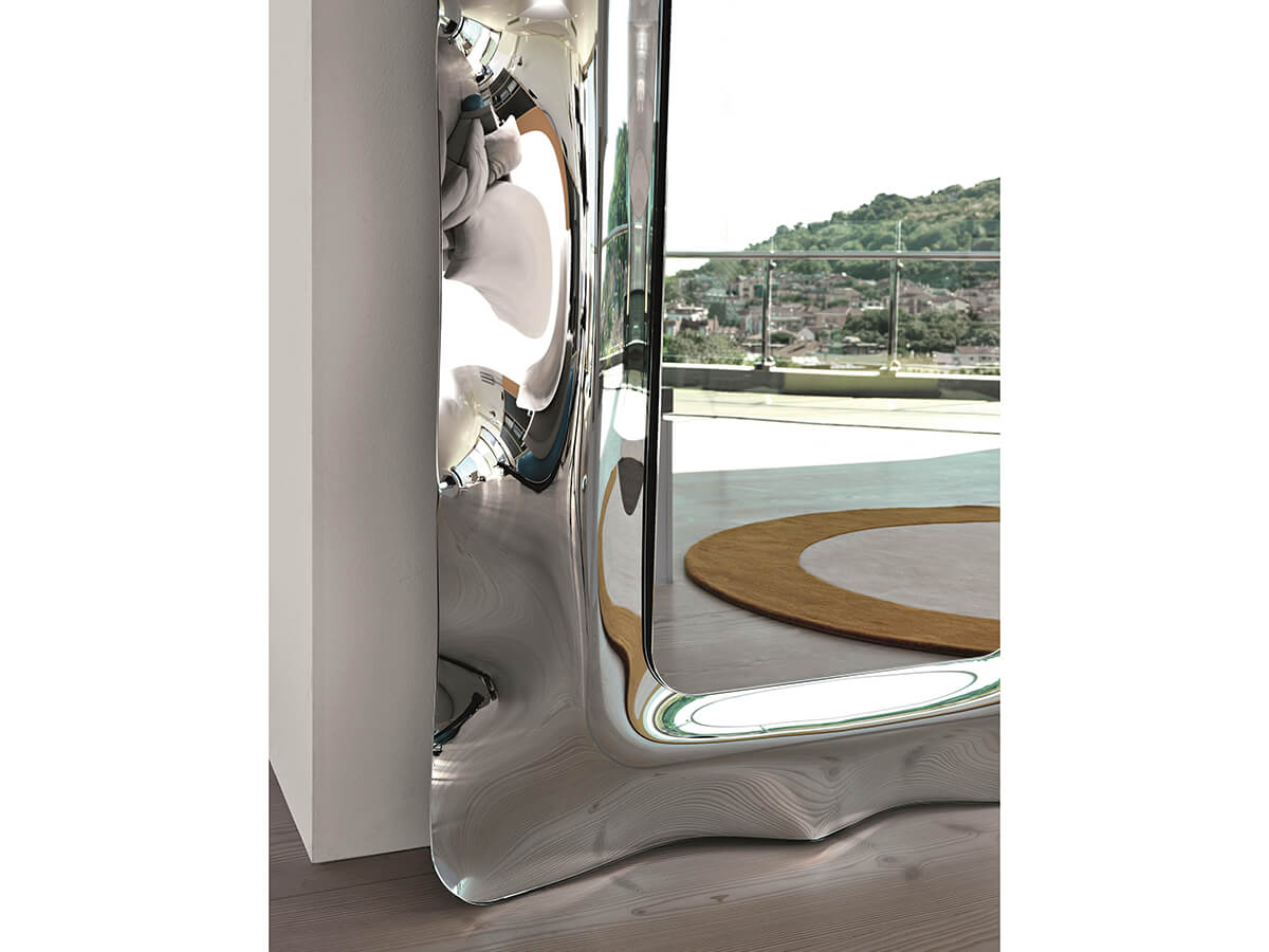 A piece of furniture with a timeless charm, lively and versatile depending on where you want to place it. Dorian was born from Fiam's craftsmanship, which has always been a guarantee of quality and attention to detail. In its being, Dorian encloses the supreme art of high-heat fused glass of which the 6 mm back-silvered frame is made up. The rear frame in painted metal supports the entire structure and at the same time allows it to be hung both horizontally and vertically in any room of the house. Dorian's beauty lies precisely in its gentle appearance, made of flounces and waves capable of creating a unique and high-quality atmosphere.