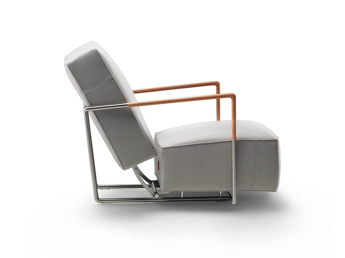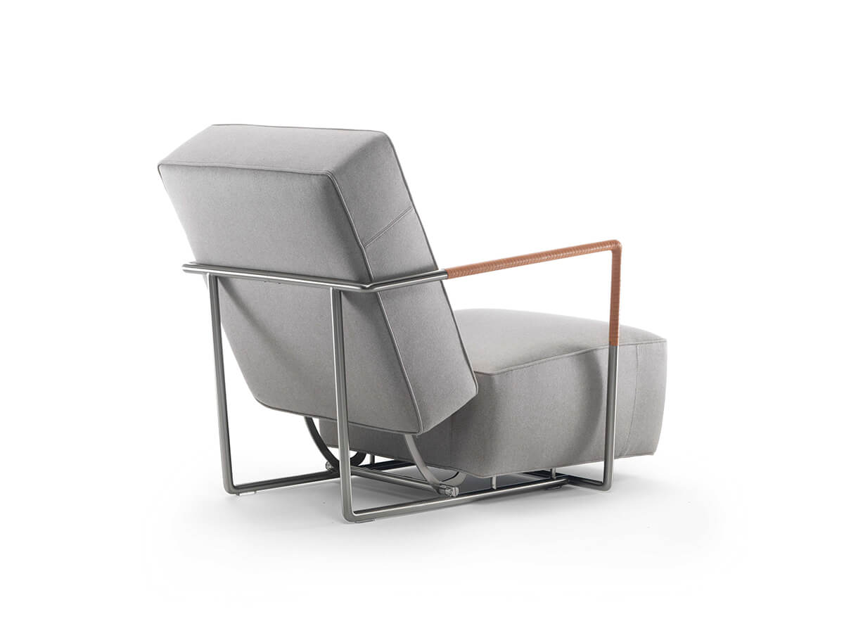 A tribute to the Modern Movement, born from the great inspiration of Antonio Citterio and guided towards modern forms and designs by the Flexform craftsmanship quality. The use of black leather and the tubular metal structure highlight the solid anchor that A.B.C has towards an illustrious past. The low seat, on the other hand, is contemporary, resulting in a perfect integration of the padded volumes within the supporting structure, available in different finishes. Complete with footrest pouf, A.B.C is a guarantee of comfort. The A.B.C re-edition has a different design of the base and the elimination of the armrest which gives a softer look to the structure in general. Optional accessory is the headrest pad with goose down padding for an even more accentuated feeling of comfort.* Technical features: all versions of the armchair are with movement