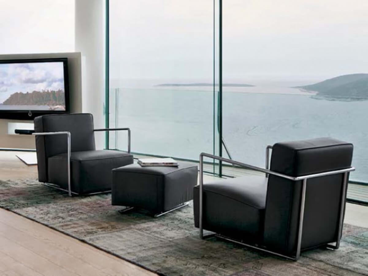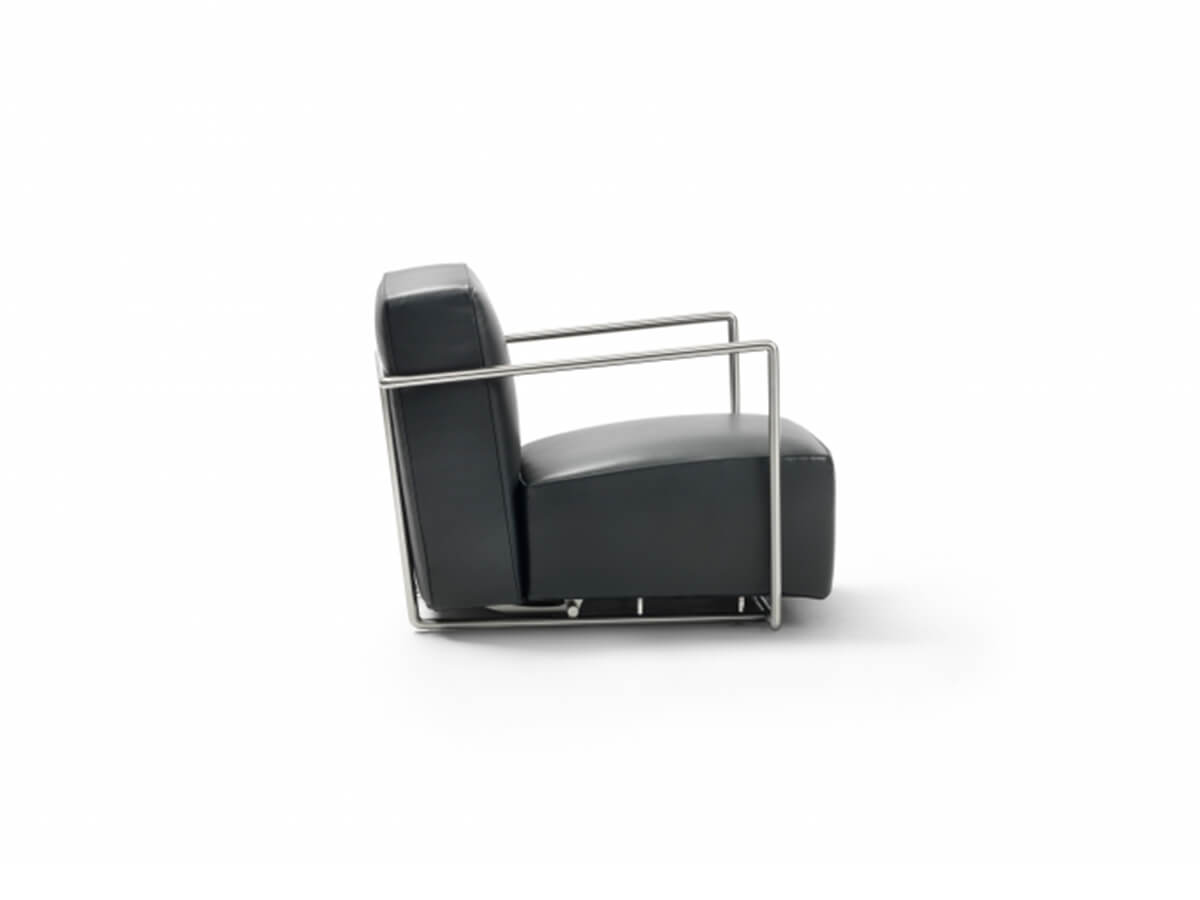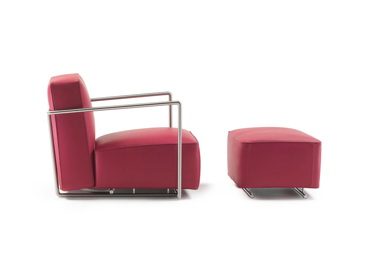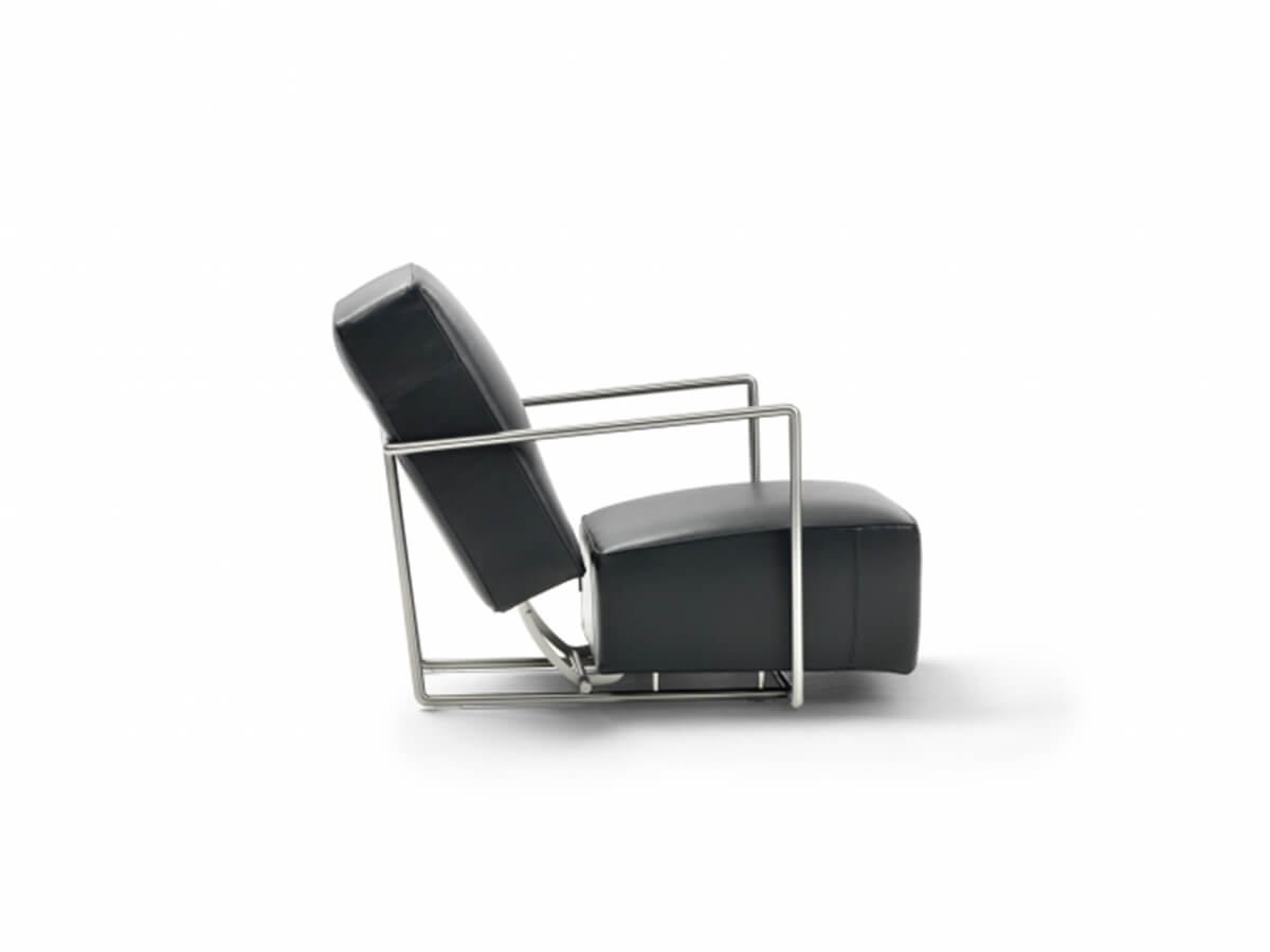 A tribute to the Modern Movement, born from the great inspiration of Antonio Citterio and guided towards modern forms and designs by the Flexform craftsmanship quality. The use of black leather and the tubular metal structure highlight the solid anchor that A.B.C has towards an illustrious past. The low seat, on the other hand, is contemporary, resulting in a perfect integration of the padded volumes within the supporting structure, available in different finishes. Complete with footrest pouf, A.B.C is a guarantee of comfort. The A.B.C re-edition has a different design of the base and the elimination of the armrest which gives a softer look to the structure in general. Optional accessory is the headrest pad with goose down padding for an even more accentuated feeling of comfort.* Technical features: all versions of the armchair are with movement