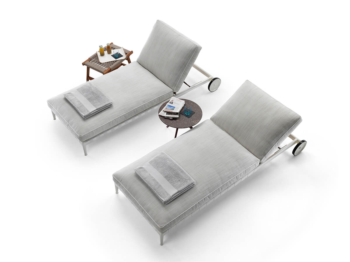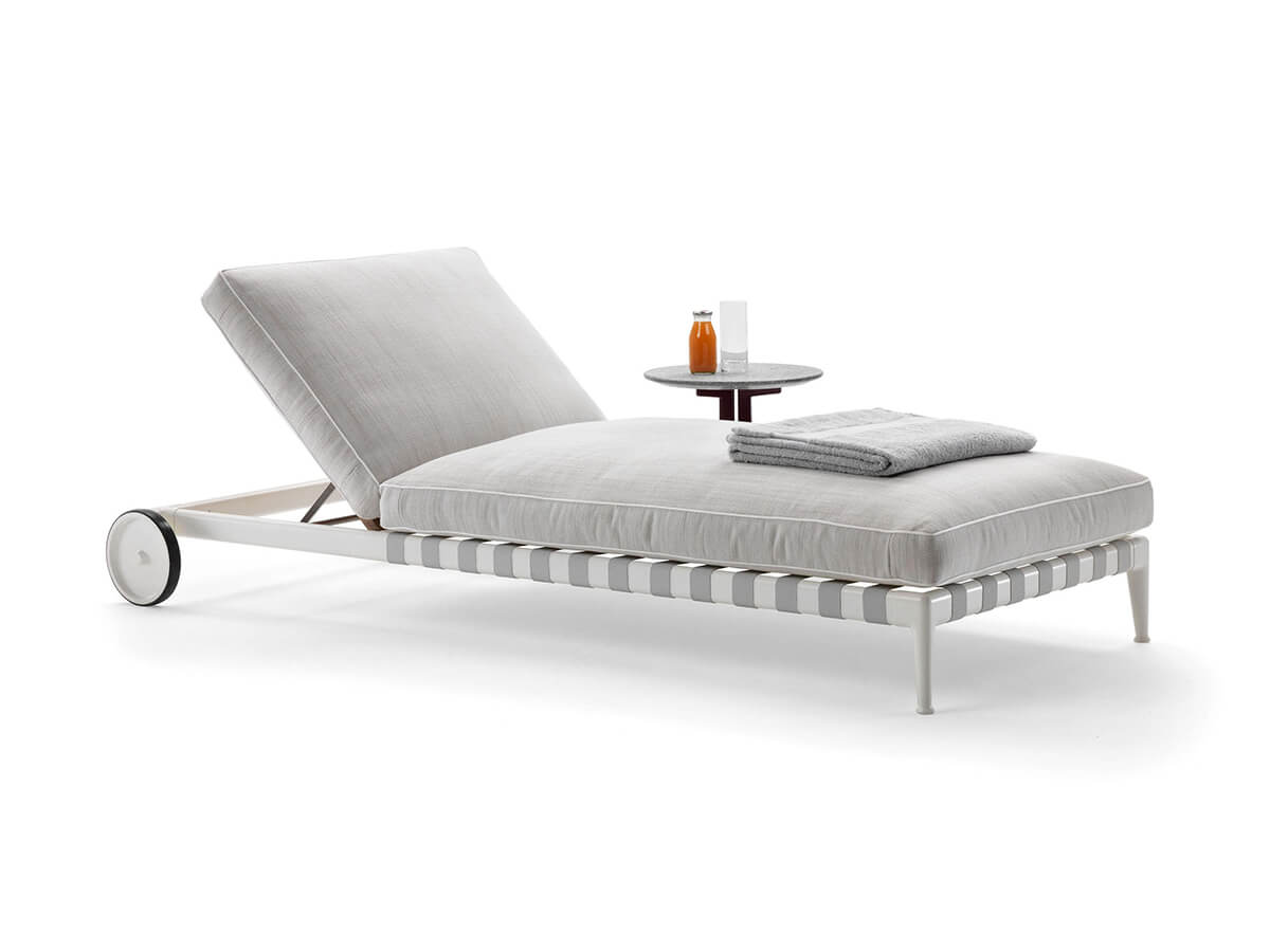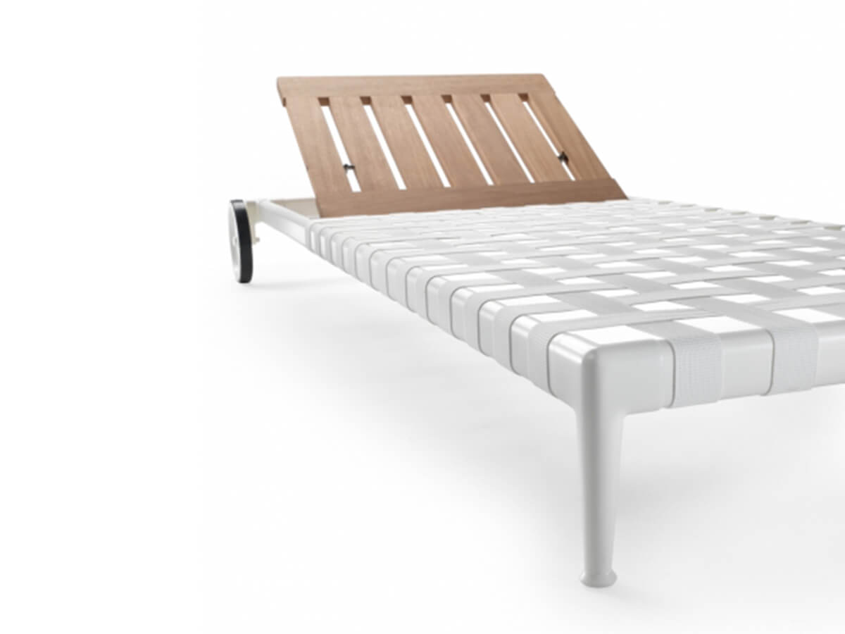 An outdoor element with a light aesthetic, capable of lasting over time and withstanding even the most adverse weather conditions. Atlante is full of details and design experiments that underline its high degree of customization. The aluminium base is epoxy powder coated in a series of refined colors, while the elastic straps are available in different colors. The soft mattress padded with polyester fiber guarantees maximum comfort. Atlante offers a reclining backrest thanks to a functional mechanism that allows you to adjust the inclination to facilitate sleep, relaxation, reading and much more.* Technical features: water repellent elastic straps available in white, sand, gray and anthracite colors. Cushions with grosgrain profile.