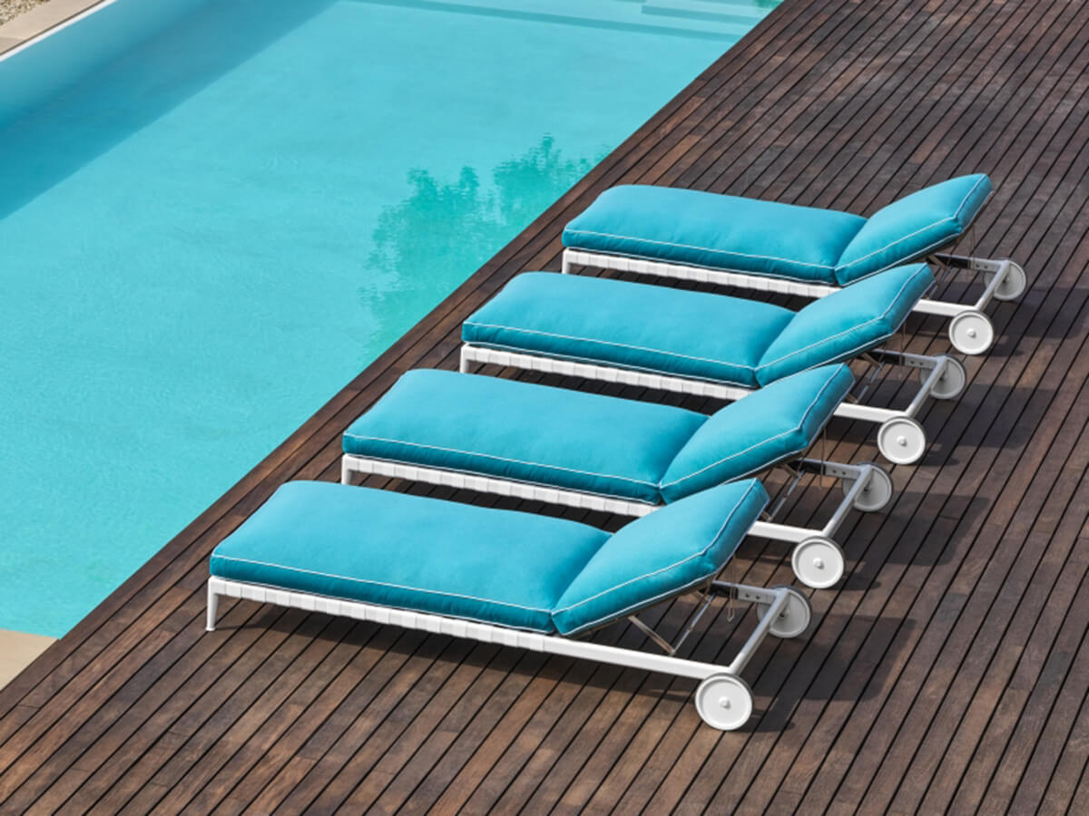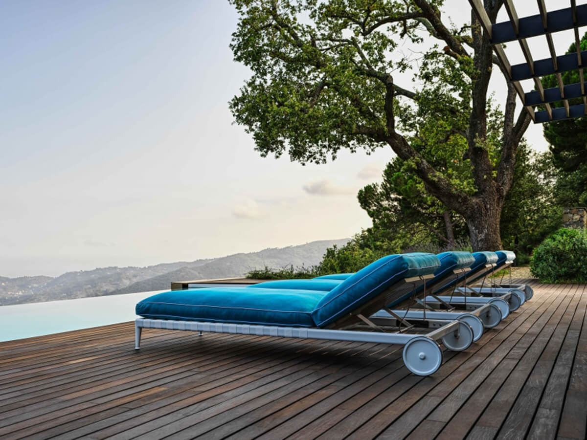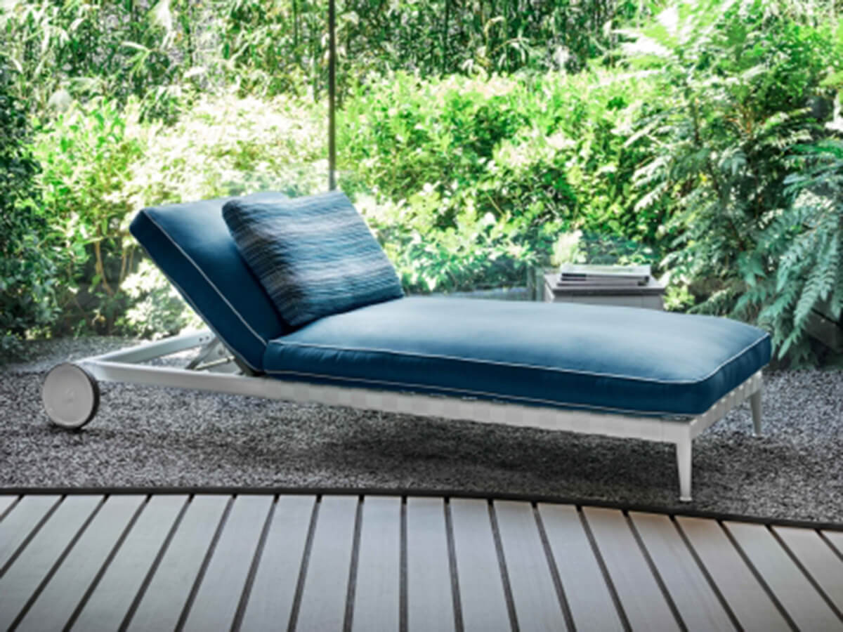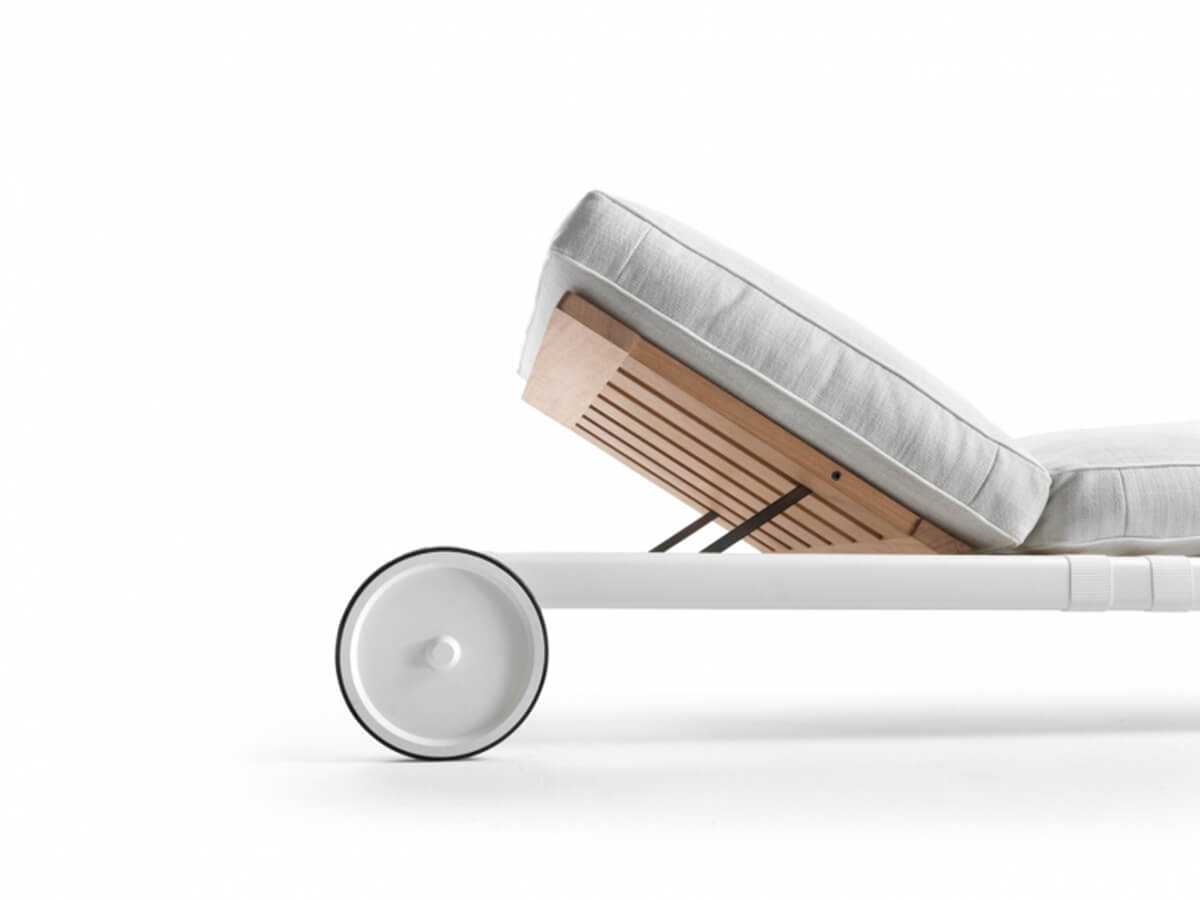 An outdoor element with a light aesthetic, capable of lasting over time and withstanding even the most adverse weather conditions. Atlante is full of details and design experiments that underline its high degree of customization. The aluminium base is epoxy powder coated in a series of refined colors, while the elastic straps are available in different colors. The soft mattress padded with polyester fiber guarantees maximum comfort. Atlante offers a reclining backrest thanks to a functional mechanism that allows you to adjust the inclination to facilitate sleep, relaxation, reading and much more.* Technical features: water repellent elastic straps available in white, sand, gray and anthracite colors. Cushions with grosgrain profile.