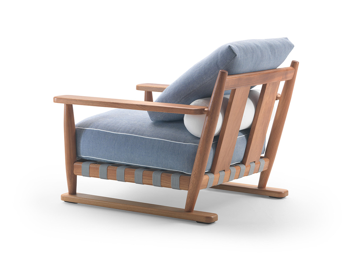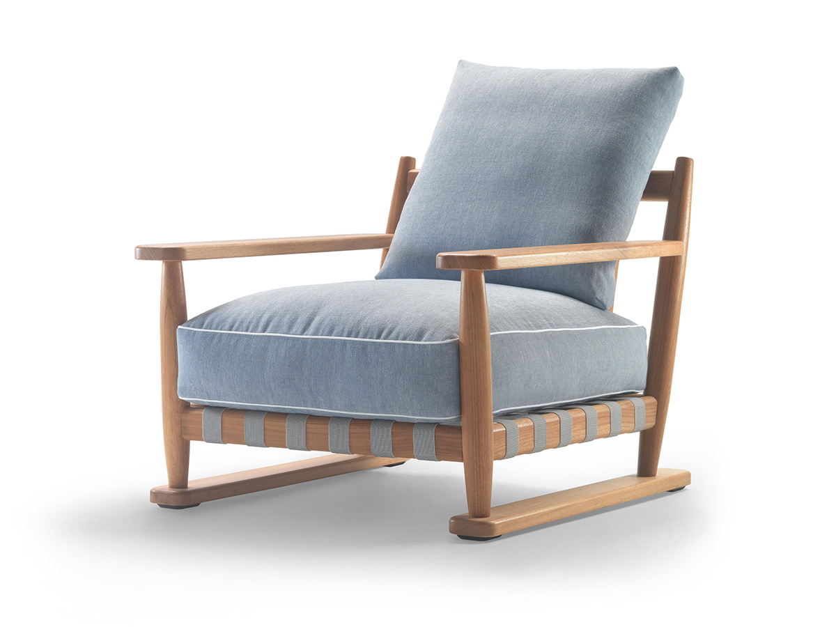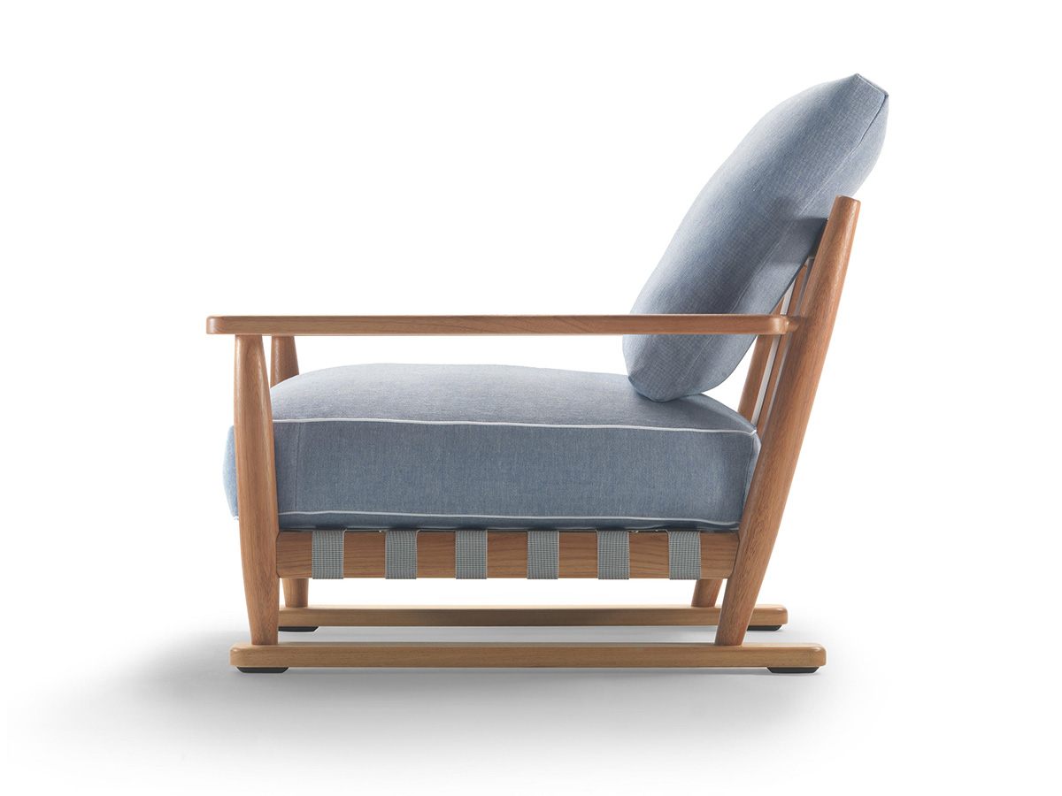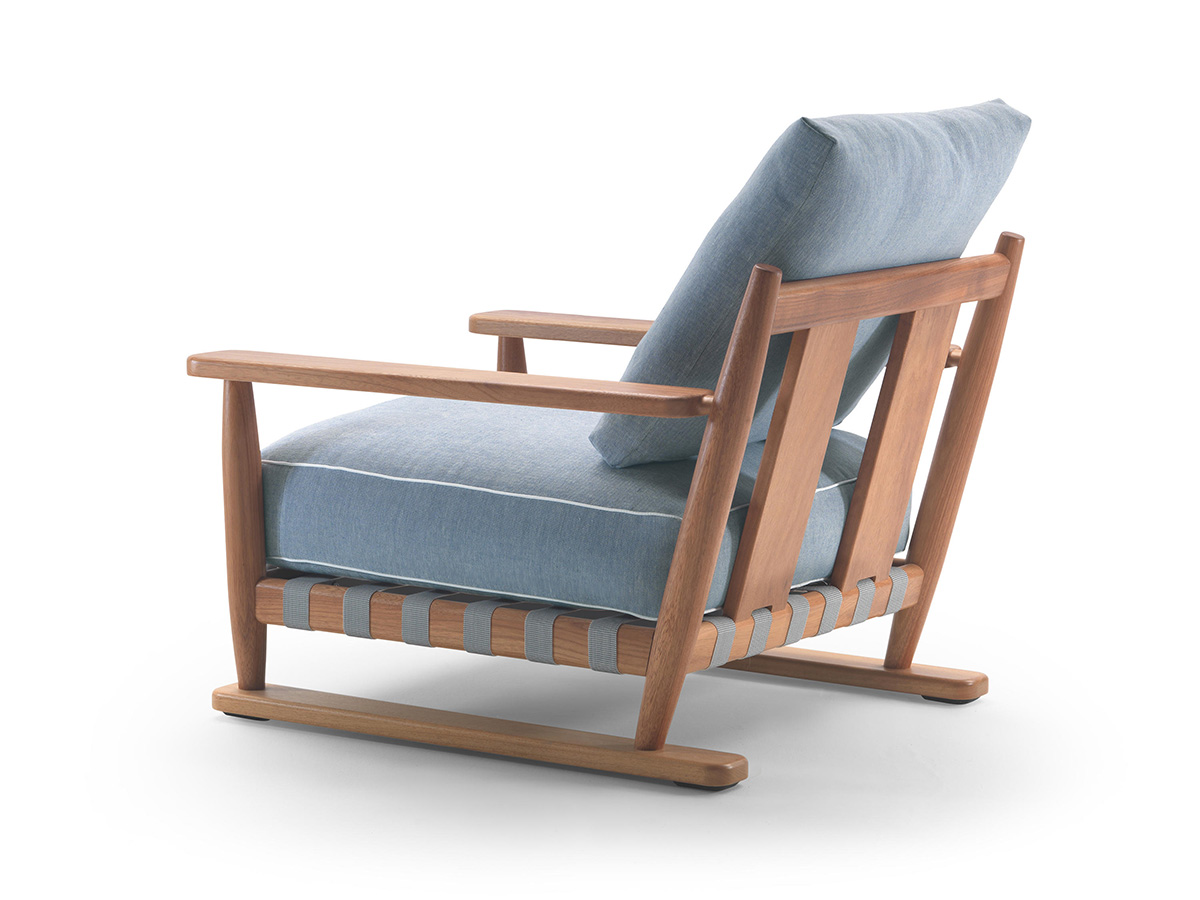 An armchair that pays homage to the tradition and craftsmanship that have always characterized Flexform's style. The structure of Meriggio is in solid wood that is sanded, turned and finished by hand for a unique look, free from any discrepancies. The base is configured with a sled design, with a support on the ground created by means of spacers in thermoplastic material which protect the wood from direct contact with the humidity of the floor. The seat cushions rest on elastic straps available in a variety of colors to better adapt to tastes. Meriggio is ideal for those who love to surround themselves with refined elements of great beauty and character.