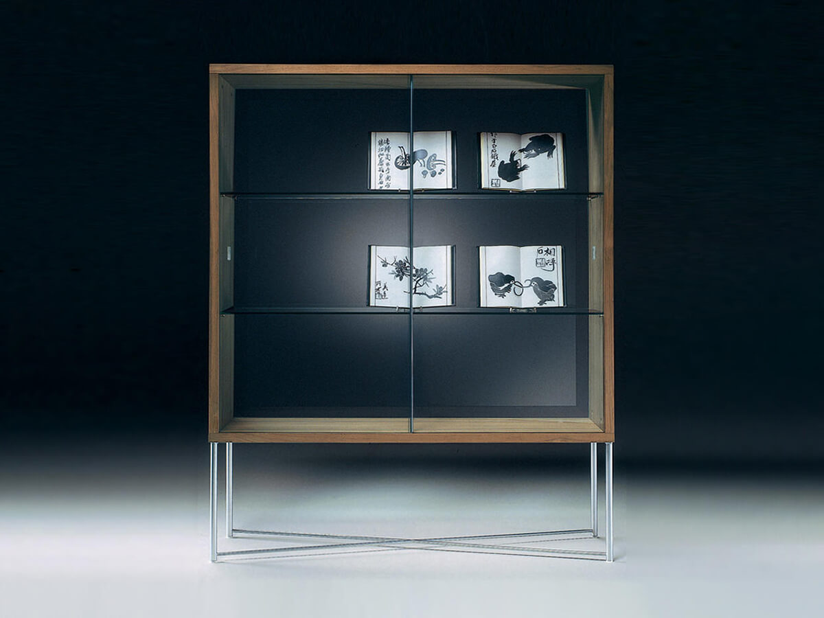 Moka is a piece of furniture that fits well in living spaces, or wherever a container of great elegance and expressive beauty is required. Born from the homonymous collection designed by Mario Asnago and Claudio Vender, Moka is a showcase consisting of a refined frame in Canaletto walnut or ash, available in a variety of finishes. The structure rests on a slender metal tubular which forms a particular cross design in the part that rests with the floor. Doors, back and shelves are in glass and give Moka a sort of impalpable lightness, ideal contrast with the hardest parts that compose it.* Technical features: sliding doors, back and shelves in transparent glass