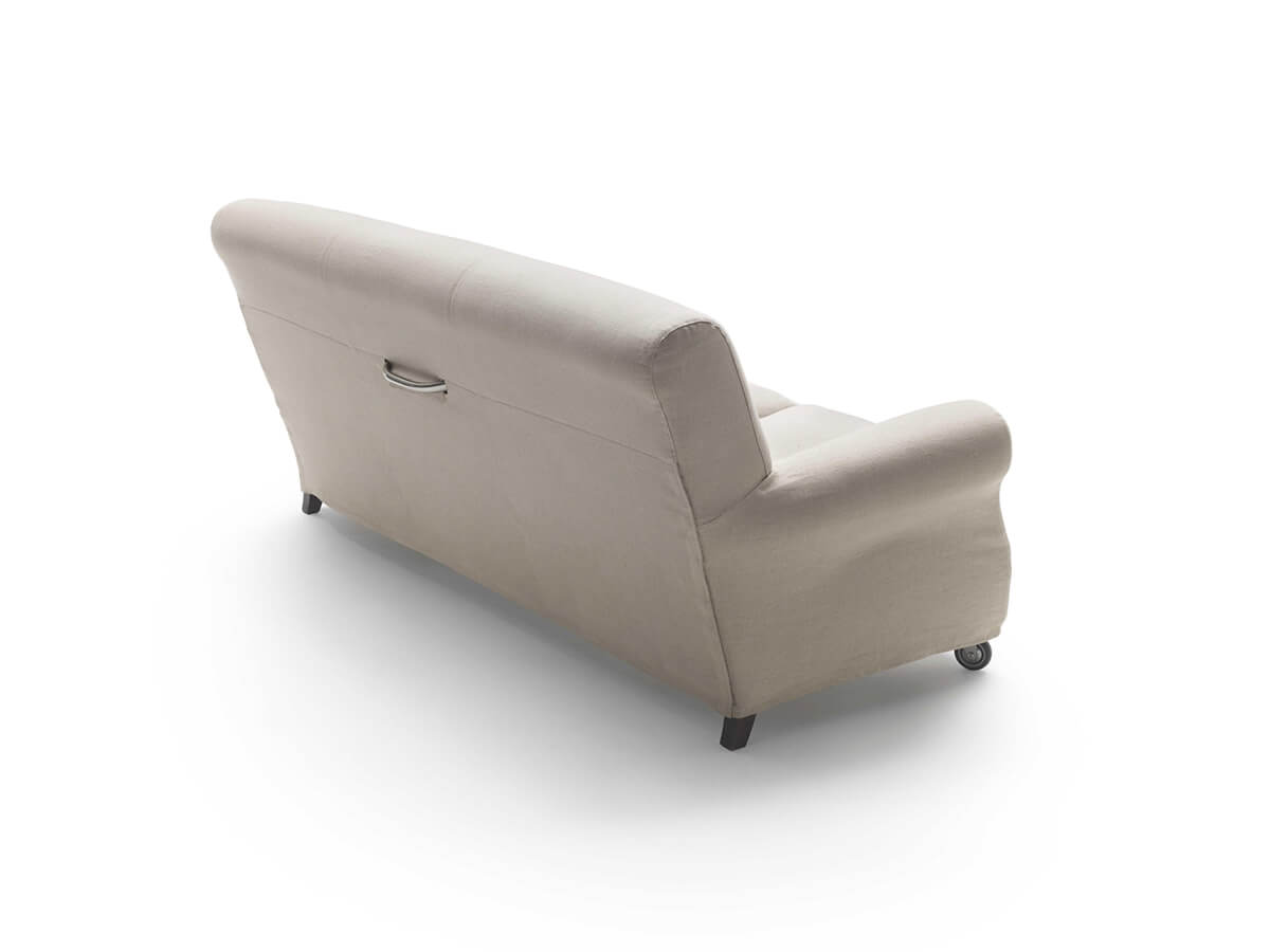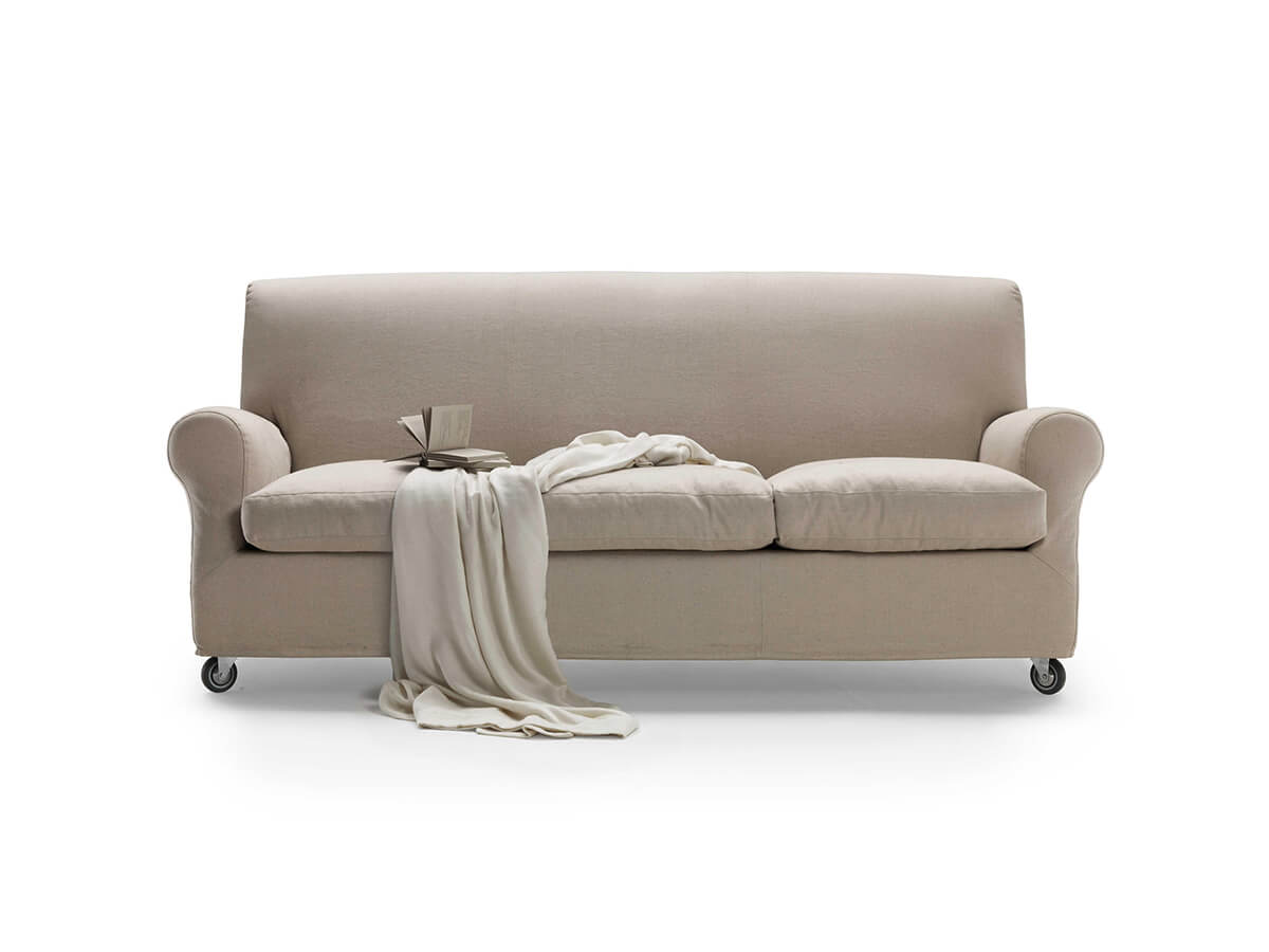 Nonnamaria was born from the famous design of "I Divani di Famiglia" undertaken by Flexform in the Eighties to celebrate and give new life to the so-called "period sofas", a contemporary reinterpretation of that familiar upholstery of which many still have imprinted the memory. The reassuring and extremely familiar aspect is taken up here and freed from frills and decorative details that weighed down the line now re-studied to satisfy a more minimal and essential taste. Available in two and three seater versions, it maintains the soft and generous silhouette, accentuated by the particular armrest which re-proposes the traditional “curl armrest”. Equipped with practical self-locking front wheels to facilitate movement, Nonnamaria is a perfect piece of furniture for those who want to have the best comfort while adding a touch of nostalgia.