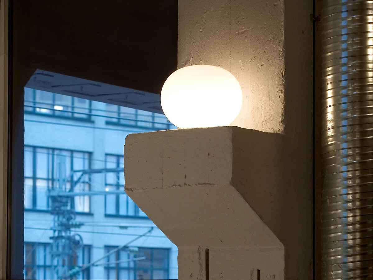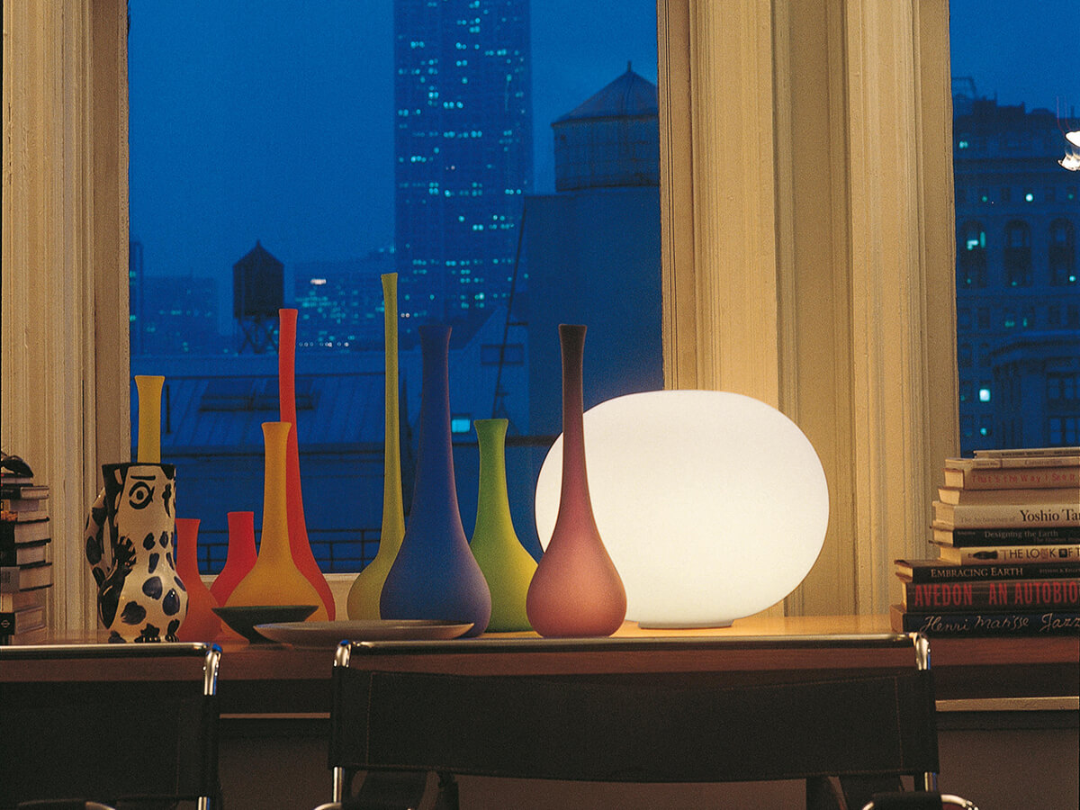 A diffused light lamp, capable of creating delicate and soft atmospheres in any environment it is placed. The diffuser is made of a hand-blown, cased opal glass, with an external acid-etched finish by a threaded die-cast aluminium alloy ring nut. The thin steel base is articulated in a tapered stem then opened in a circular plate. On the cable there is the electronic dimmer that allows the adjustment of the light intensity in steps. The numerous colours available are aimed at improving the overall impression and versatility in the different rooms of the house.