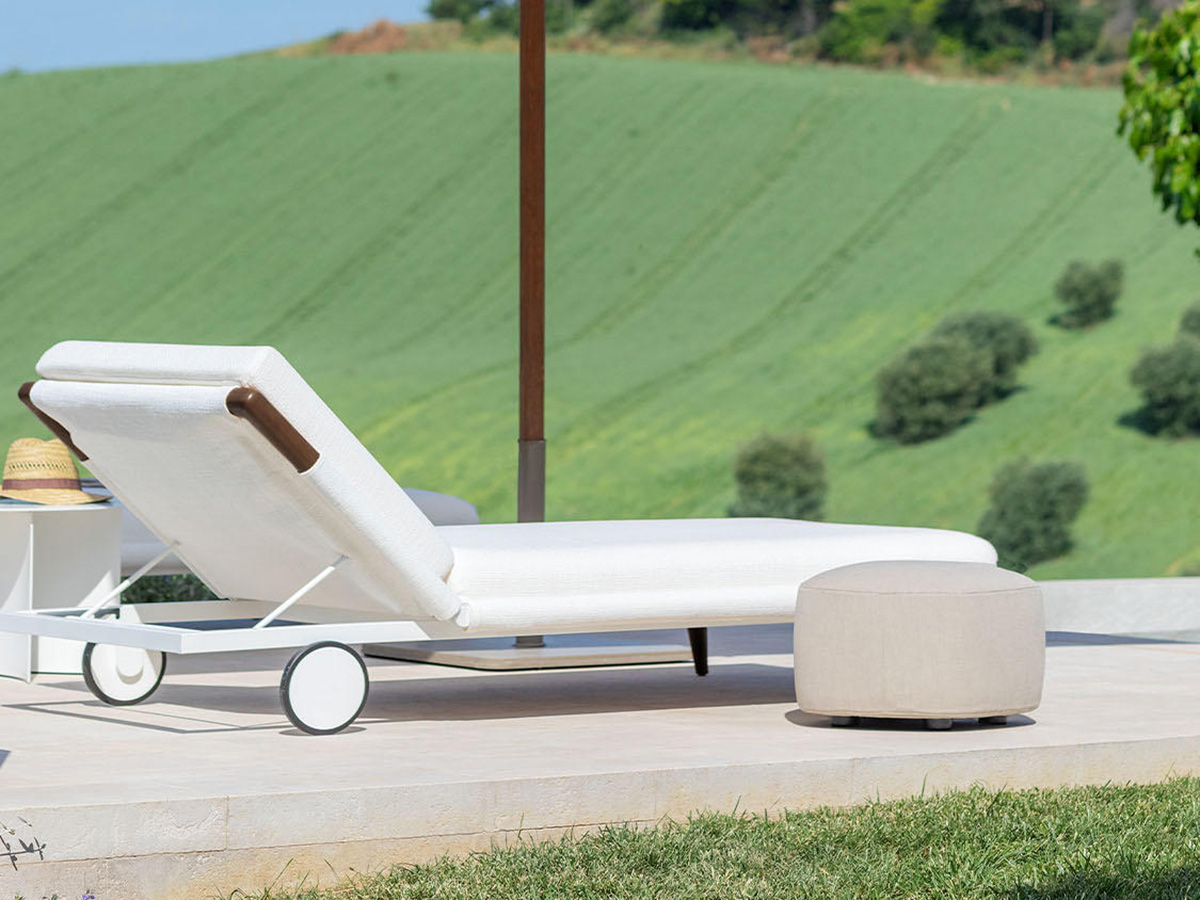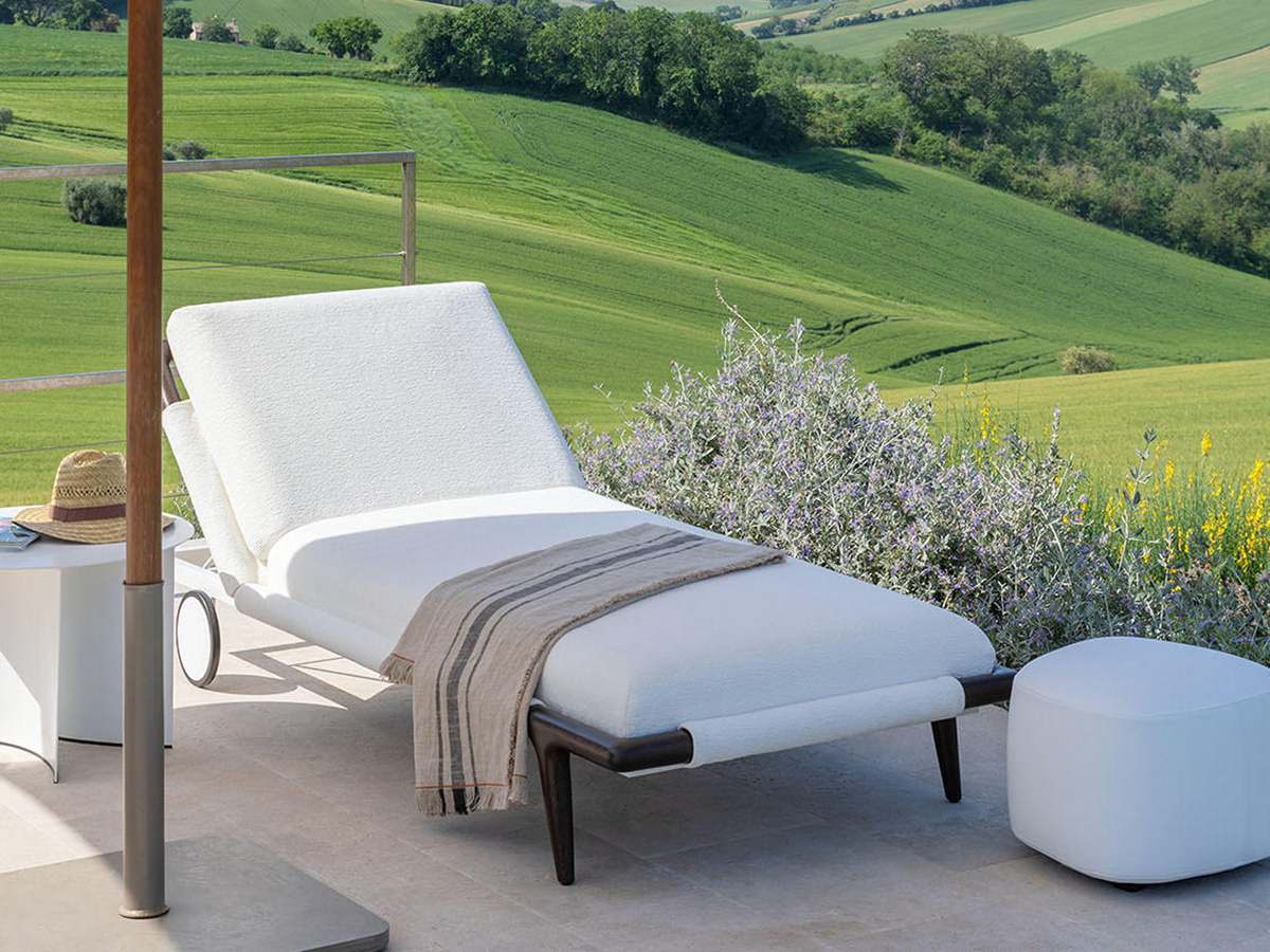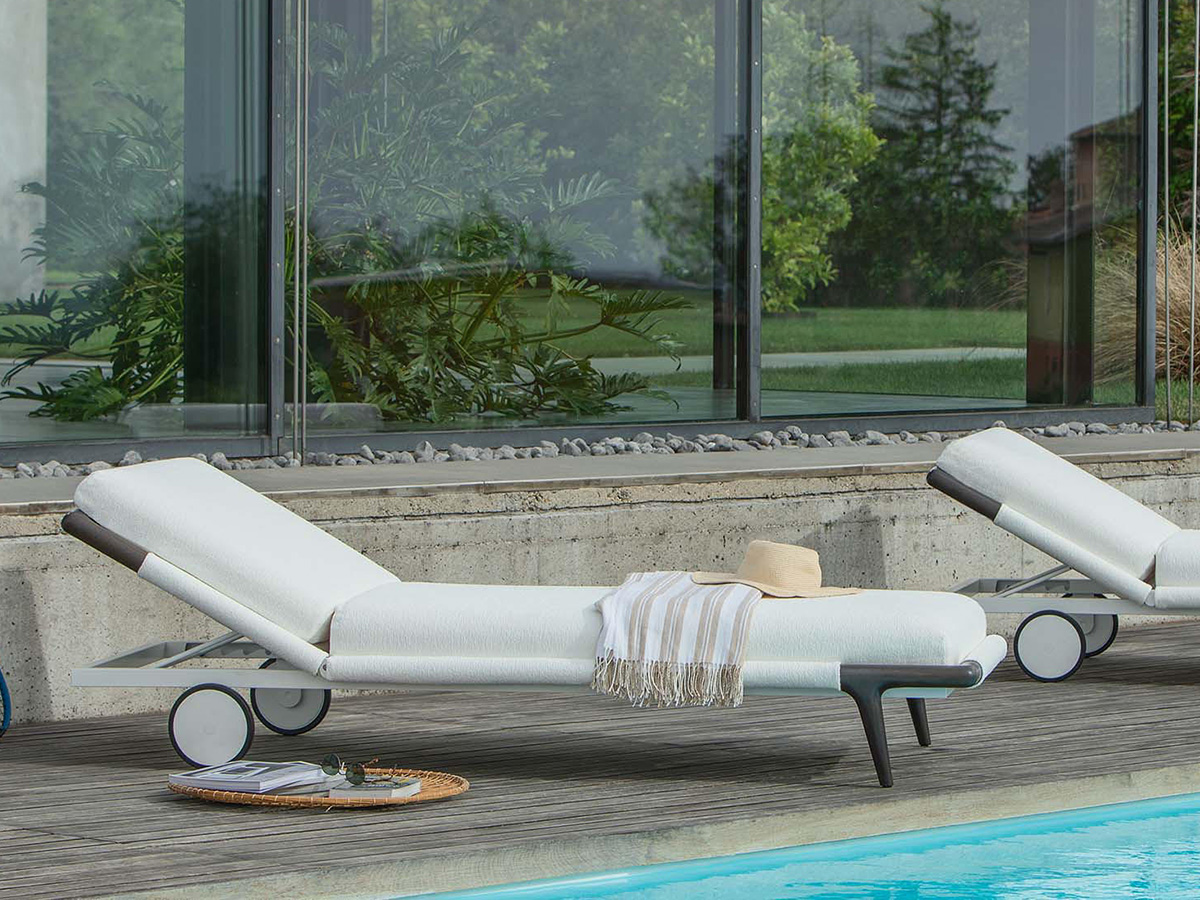 Flou arrives in the outdoor world, giving life to a series of outdoor elements that take from the company the strong artisan connotation transfigured no longer to the sleeping space but to the taste of those who love to spend hours of the day in the open air, in the company of friends and family. Gaudì is an outdoor lounger that elegantly revisits the classic shapes of the beach sunbed, giving it an aluminum structure painted with white epoxy powders plus precious visible details of the headboard and front feet in iroko wood. The result is an outdoor element with an exquisitely internal and intimate flavour, which makes use of water-repellent fabrics and coatings specially designed for rain and bad weather so as to guarantee practically indestructible furnishings.