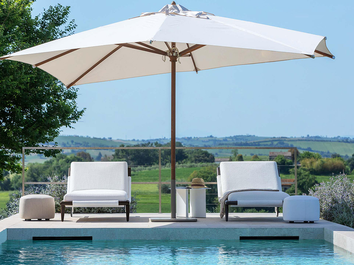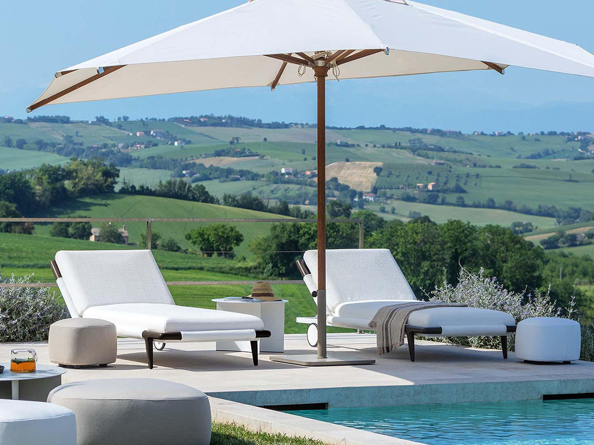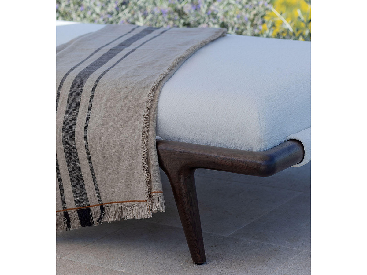 Flou arrives in the outdoor world, giving life to a series of outdoor elements that take from the company the strong artisan connotation transfigured no longer to the sleeping space but to the taste of those who love to spend hours of the day in the open air, in the company of friends and family. Gaudì is an outdoor lounger that elegantly revisits the classic shapes of the beach sunbed, giving it an aluminum structure painted with white epoxy powders plus precious visible details of the headboard and front feet in iroko wood. The result is an outdoor element with an exquisitely internal and intimate flavour, which makes use of water-repellent fabrics and coatings specially designed for rain and bad weather so as to guarantee practically indestructible furnishings.