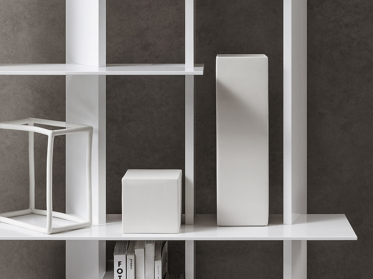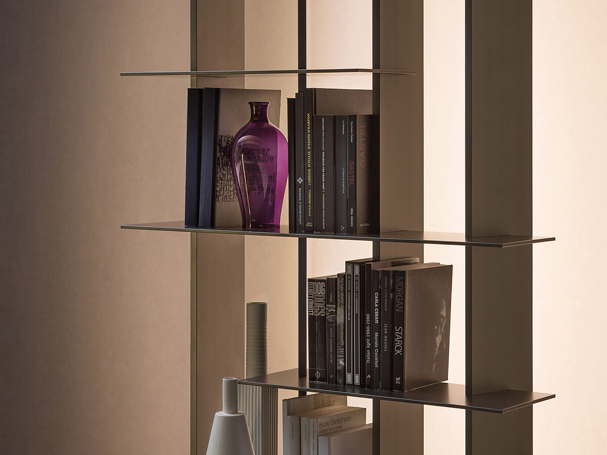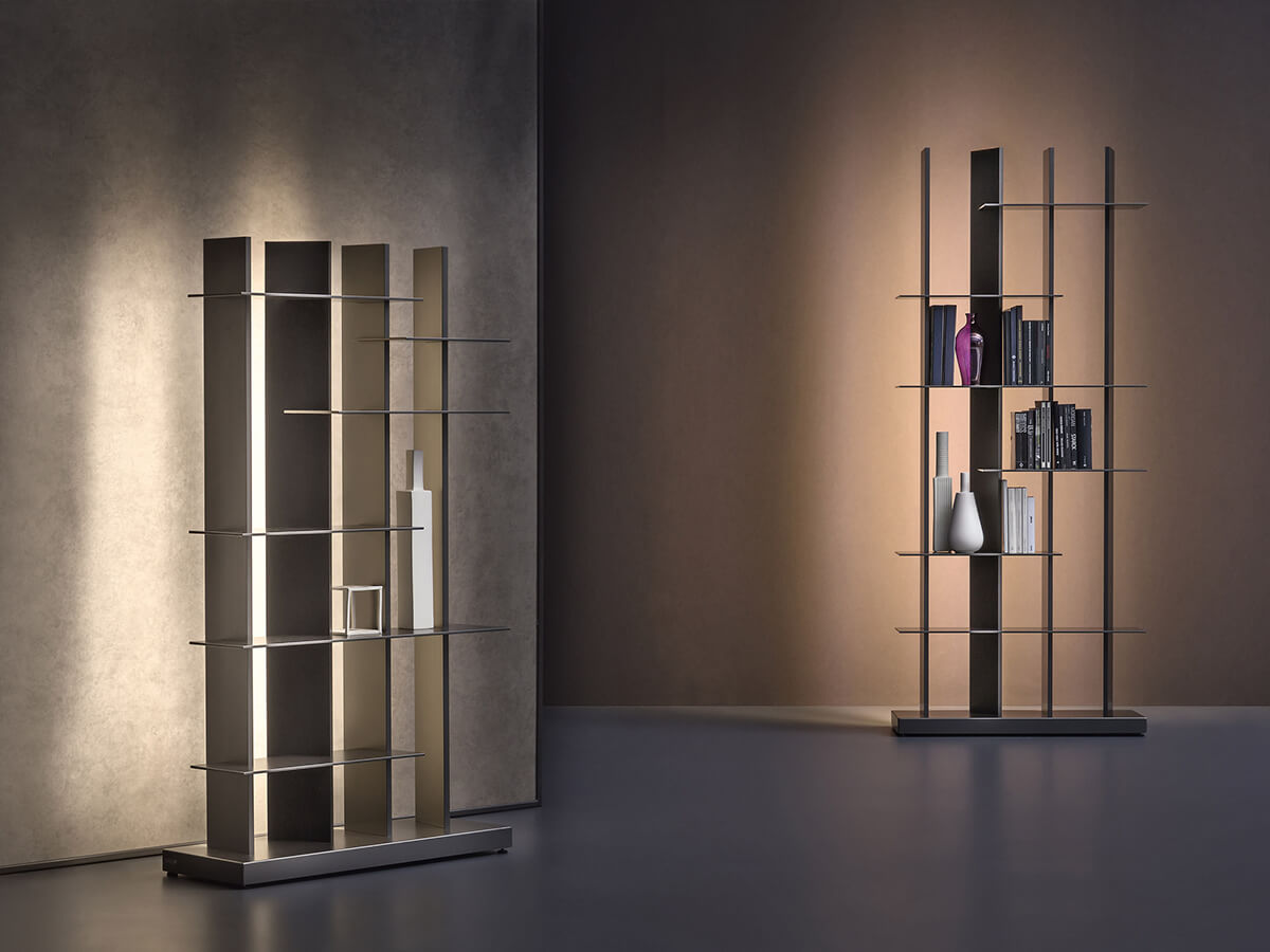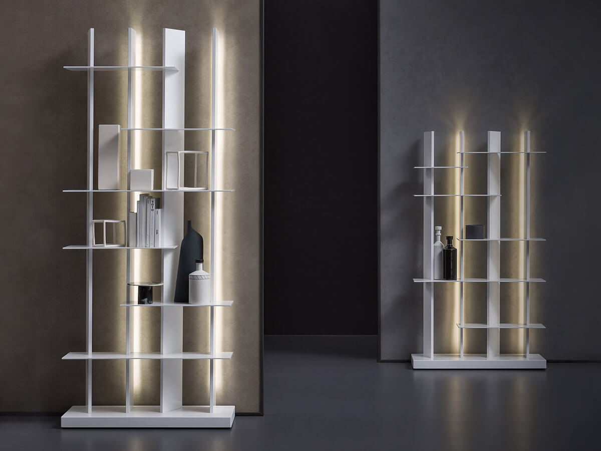 One of the most successful examples of bright furniture, artfully packaged to sum up elegance, practicality and aesthetic taste in a whole. Light is used here not as an external agent, but a real determining factor, giving life to these light furnishings capable of creating a unique atmosphere. The first and third uprights of the CC light bookcase host LEDs that when turned on draw suggestive shapes and diffuse a quality of light equivalent to any floor lamp. The light structure of the bookcase enhances the play of luminescence, creating suggestive inlays for the eye. Available in different heights and colors according to taste.