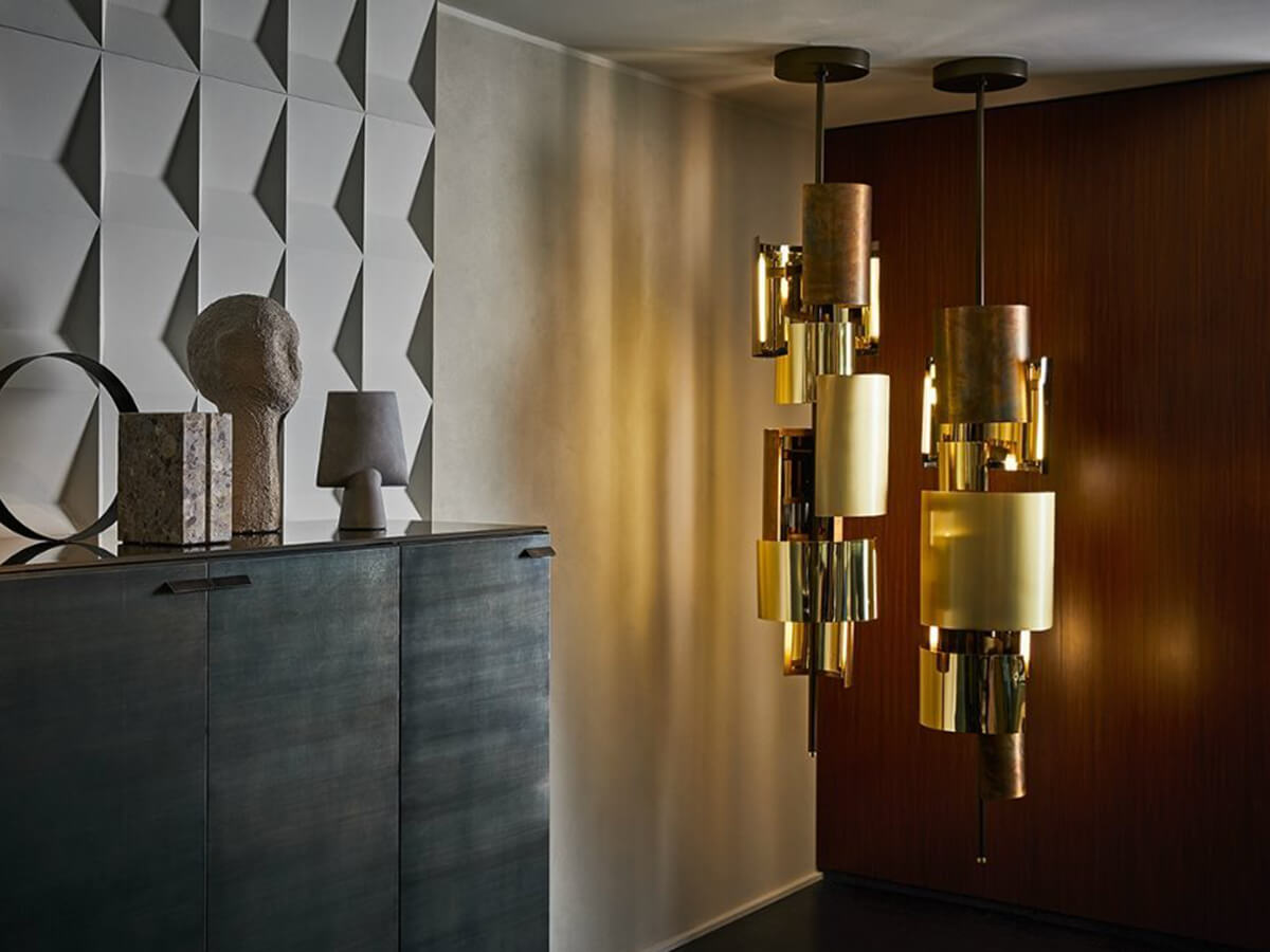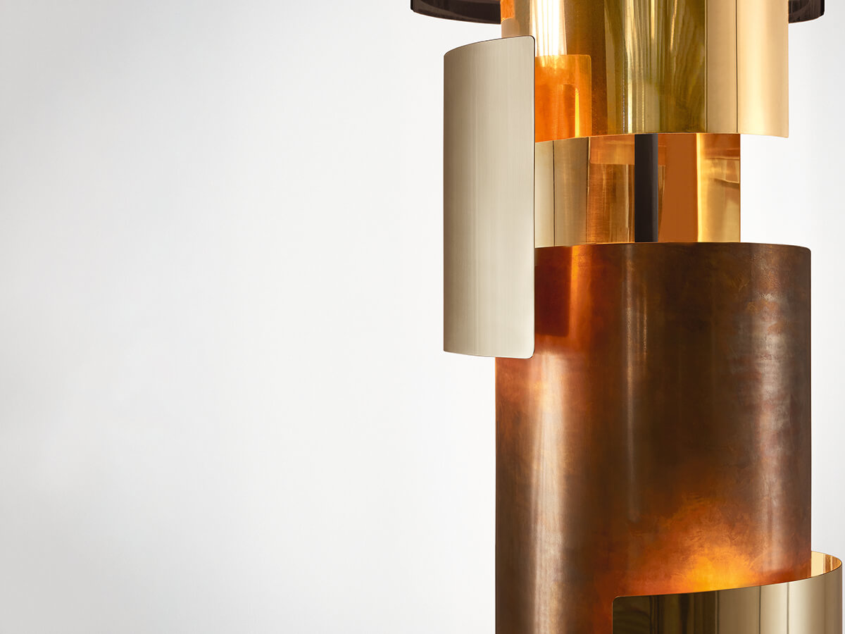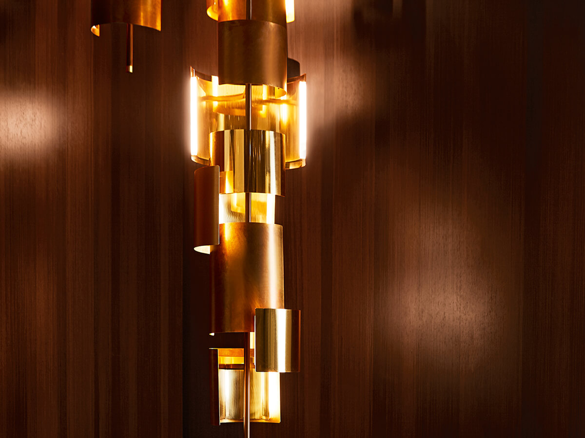 Luxurious and scenographic, the Eris suspension lamp by Gallotti & Radice takes on the precious appearance of a real luminous sculpture, in which the golden reflections of the brass flood the environment with their warm and fascinating shimmer. Signed by the designer Massimo Castagna, its deconstructed forms involve a decomposition of a cylindrical volume, which is sectioned into brass bands that overlap one another and which differ in the finishing treatment, alternating some satin ones with others hand burnished. Eris develops vertically, making it therefore suitable for spectacular compositions in which one or more lamps fall from the ceiling almost to the ground.* Technical features: bronzed black painted structure and bands in polished, satin, burnished and black chromed brass - Non-dimmable LED light lamp
