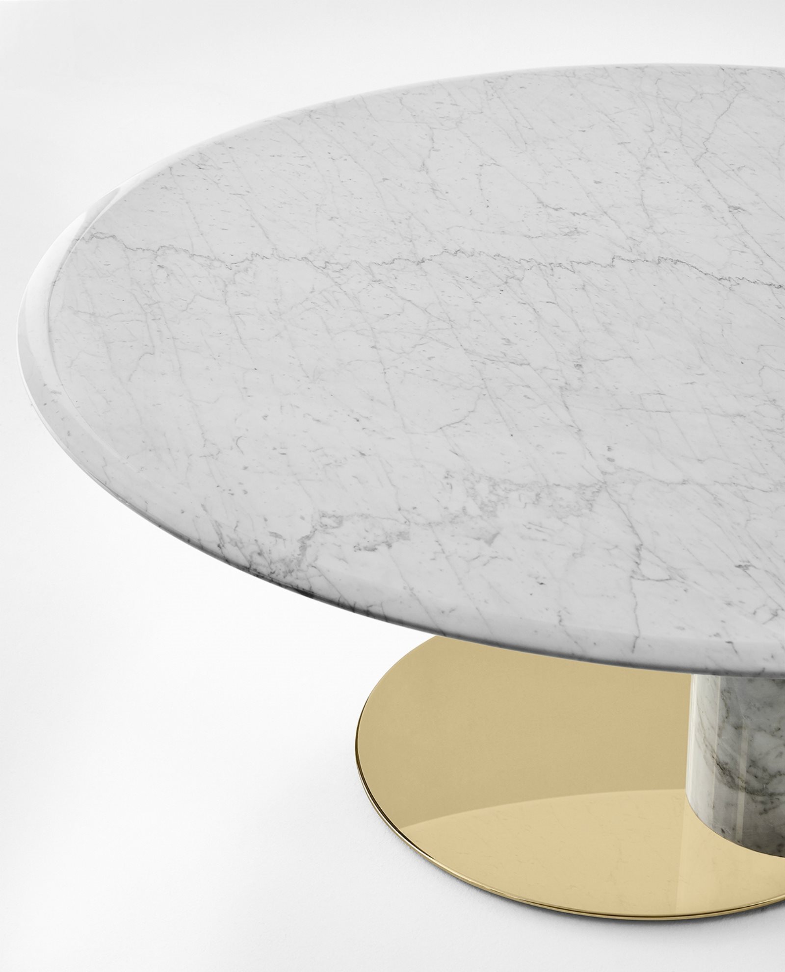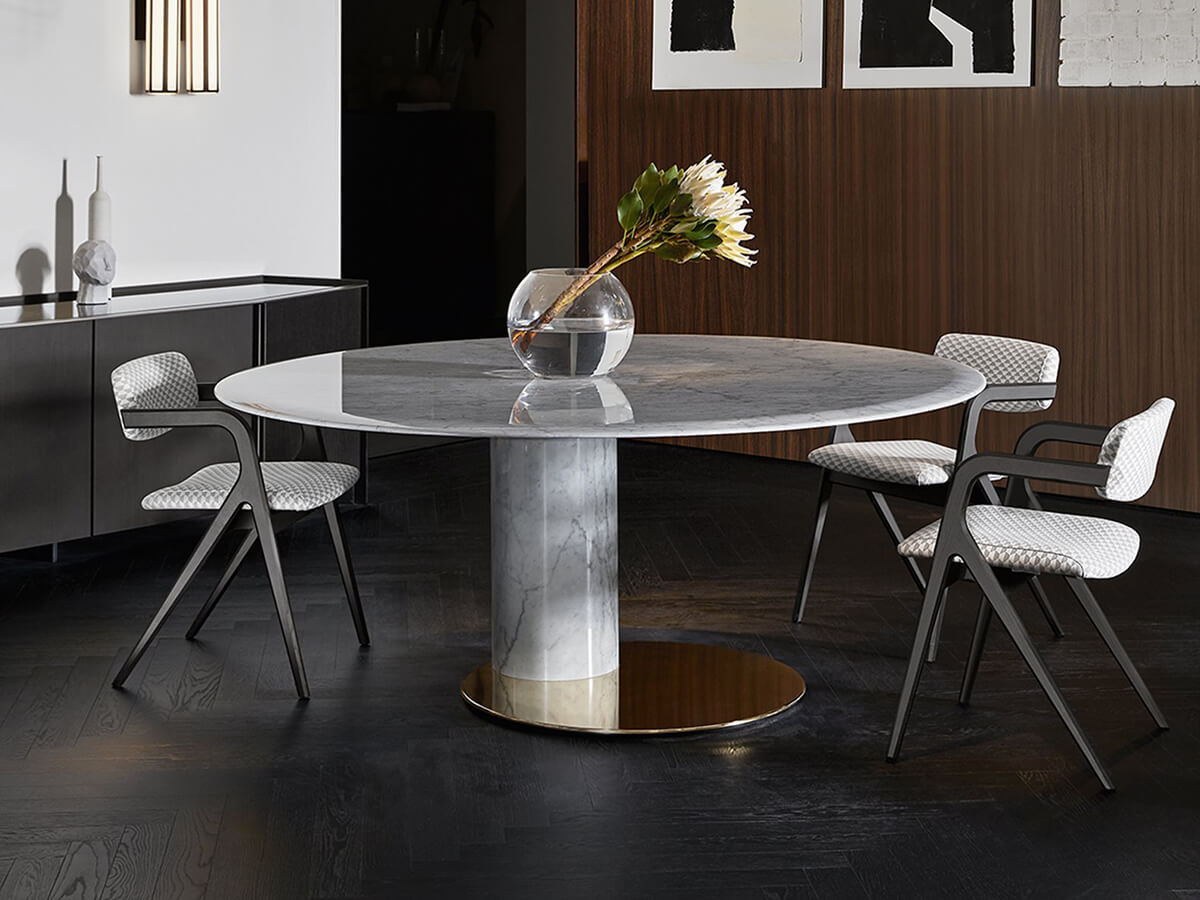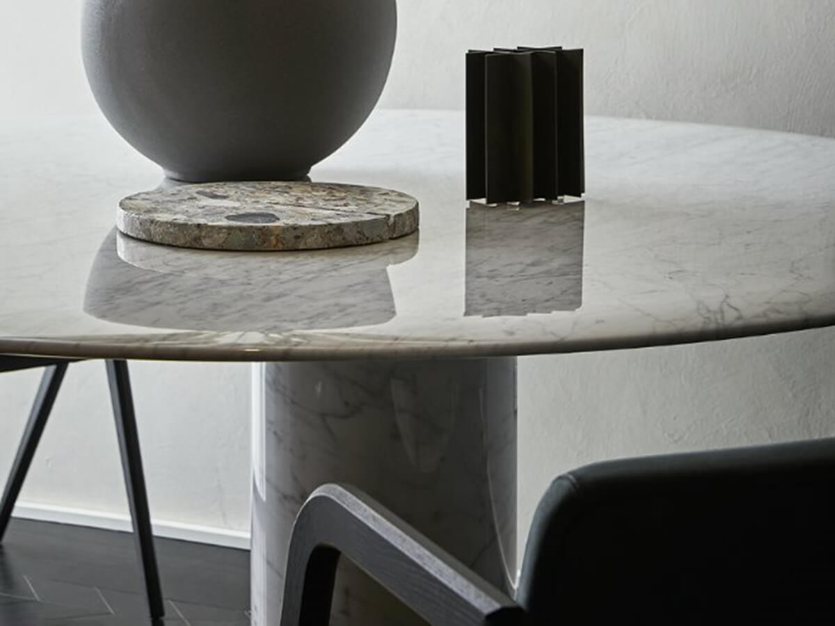 Designed by the designer duo Gabriele & Oscar Buratti, the Oto table by Gallotti & Radice represents an original interpretation of the classic archetype of the round table supported by a single central leg. Following in the footsteps of Eero Saarinen, the great inventor of this type of tables, the Buratti brothers experimented with a slippage of the support leg, which in Oto is off-centered with respect to the top, thus giving life to an asymmetrical shape that changes effect depending on the point of observation. The choice of finishes gives the table an aura of elegance and preciousness that reaches the highest levels of opulence in the Oto Big version, made entirely of marble.* Technical features for the classic version: structure in glossy painted metal in black, blue, gray and licorice. For the Oto Big version: ground plate in brass-plated stainless steel