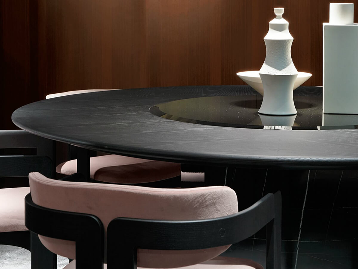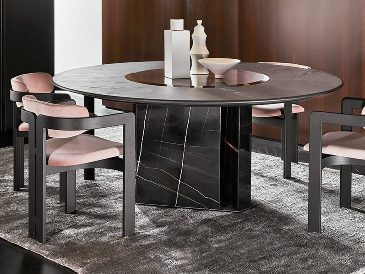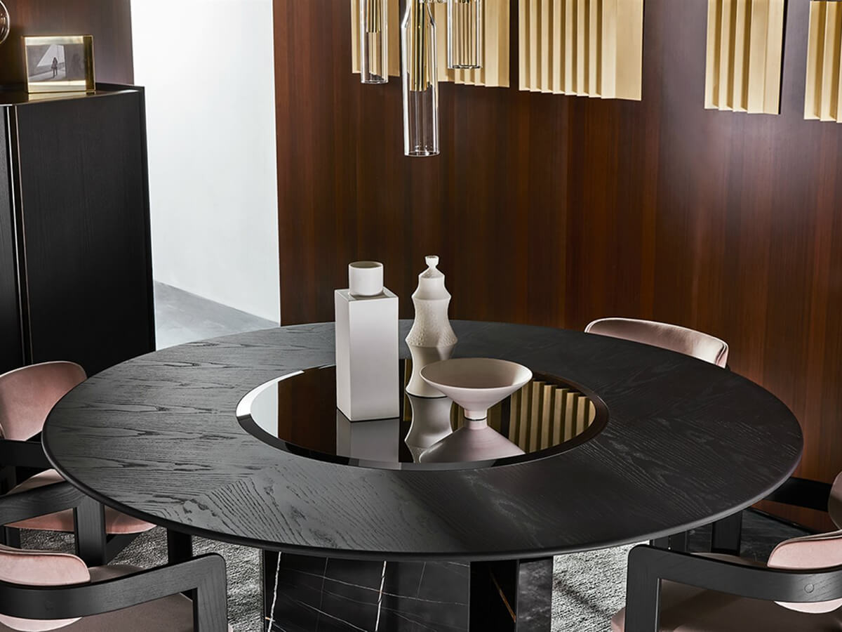 Platium is one of the most luxurious and impressive tables in the Gallotti & Radice catalog. The top consists of a large glass plate, available in different finishes, which culminates in a wide bevel along the two short sides. The base is made up of three large central supports, which can be covered in marble. Always refined and statuesque, it can take on warmer tones as in the Cashmere Gold finish or in a more algid and flawless version dominated by dark tones, a concept emphasized in the Platium W variant in which the black-stained ash top is supported by a marble base. Sahara Noir or Stardust Gray. The Platium Round version maintains the legs, now arranged in a triangle as a central support, and the important bevel, which in this case accompanies the entire diameter of the top.