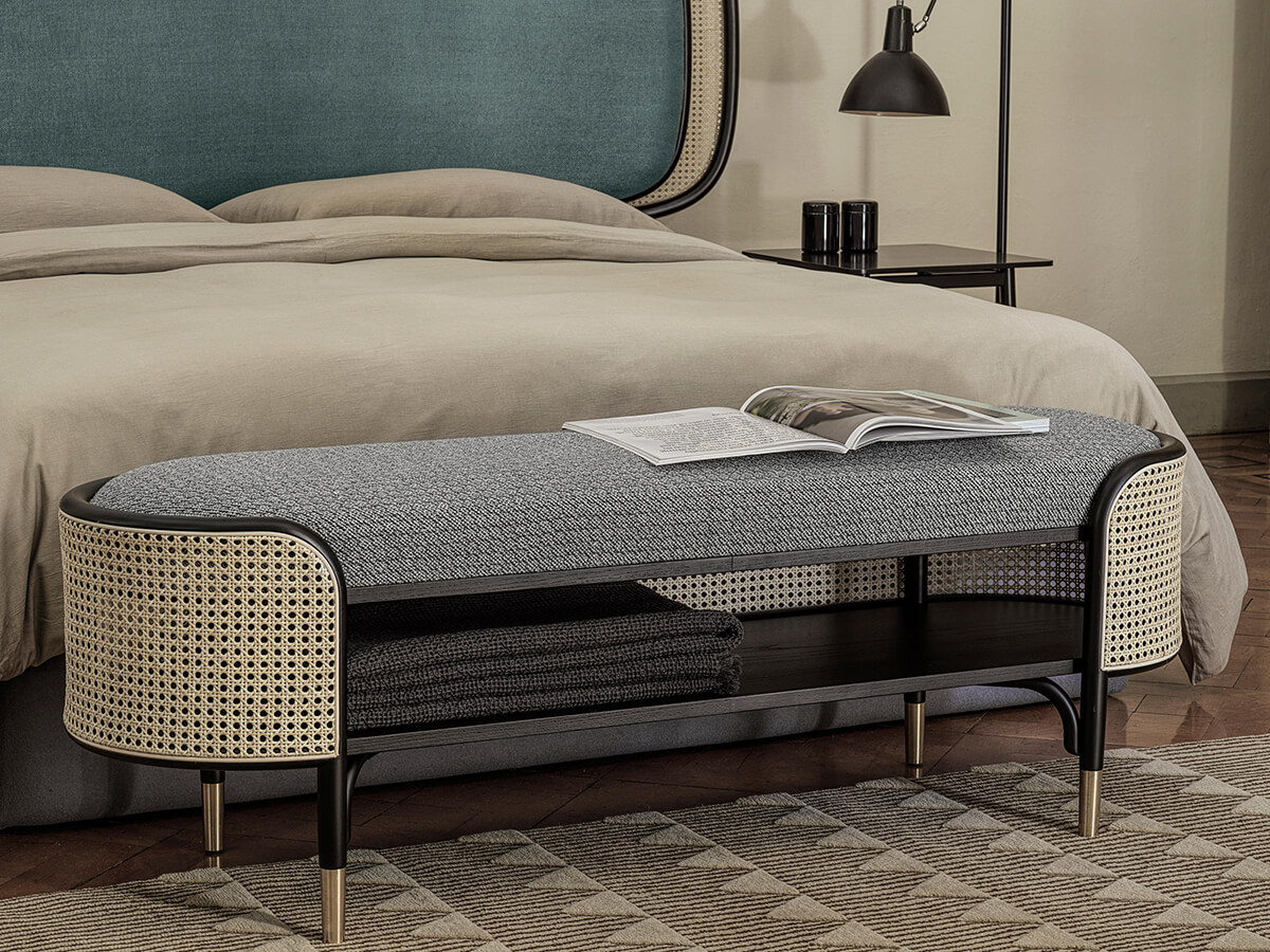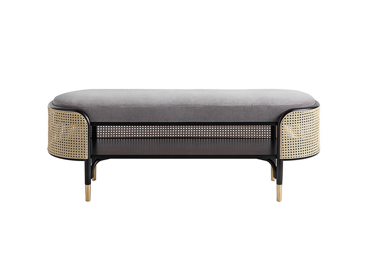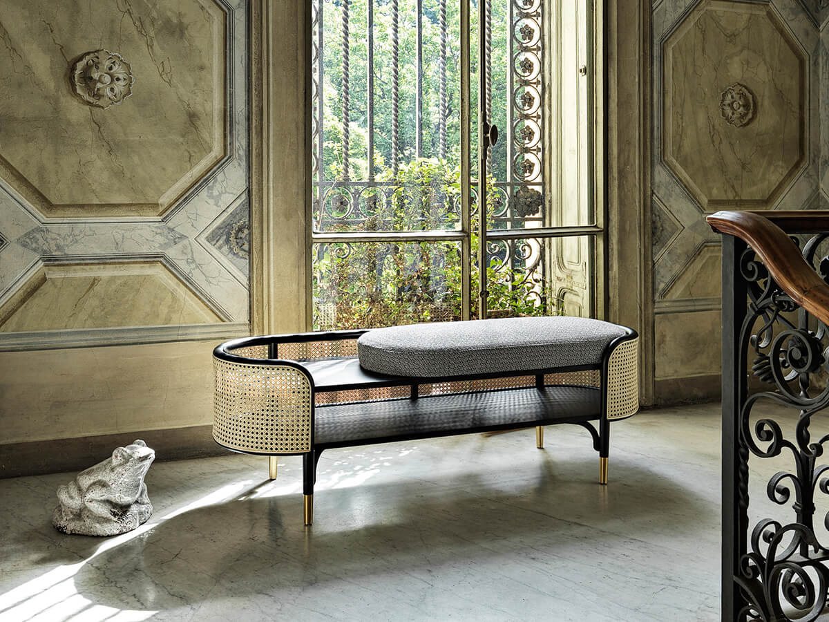 The Mos bench is a functional piece of furniture designed by GamFratesi. It acts both as a seat and as a container with an open shelf. The bench is a contemporary reinterpretation of a piece of furniture from the past, ideal for use in the sleeping area at the foot of the bed, or in an entrance hall or living room. The bench is visually light and delicate, has an elliptical shape and is finished with attention to detail. The shell is made of enveloping Vienna straw, which hides the lower support surface and connects the seat to the feet with brass tips. The table top and seat cushion are upholstered in a variety of materials. The MOS bench is part of the family of containers designed by GamFratesi which includes console, sideboard, bookcase and coffee table.