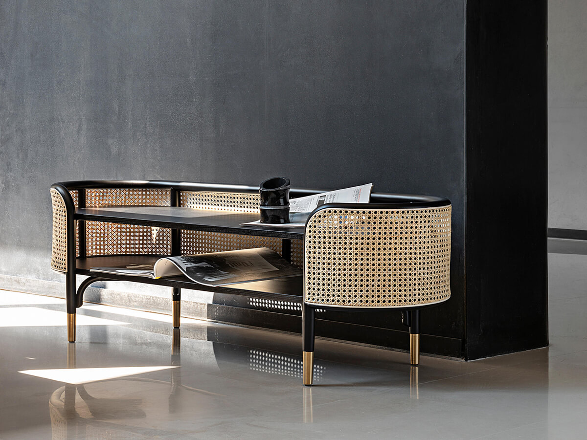 *Price valid for the version without seat cushion - frame in stained beechwood and inserts in woven cane - brass caps and shelves in ashwood (cod. PCMOSGTEP).