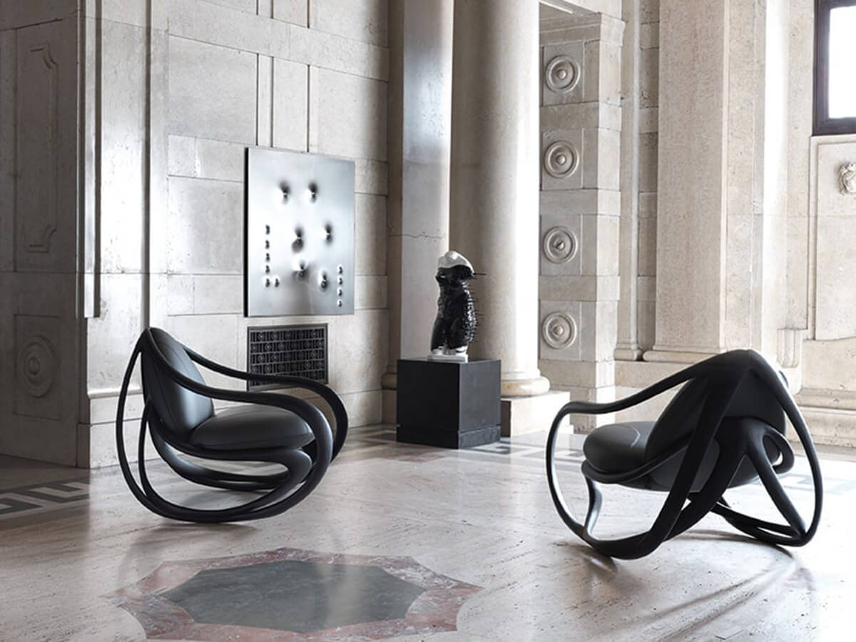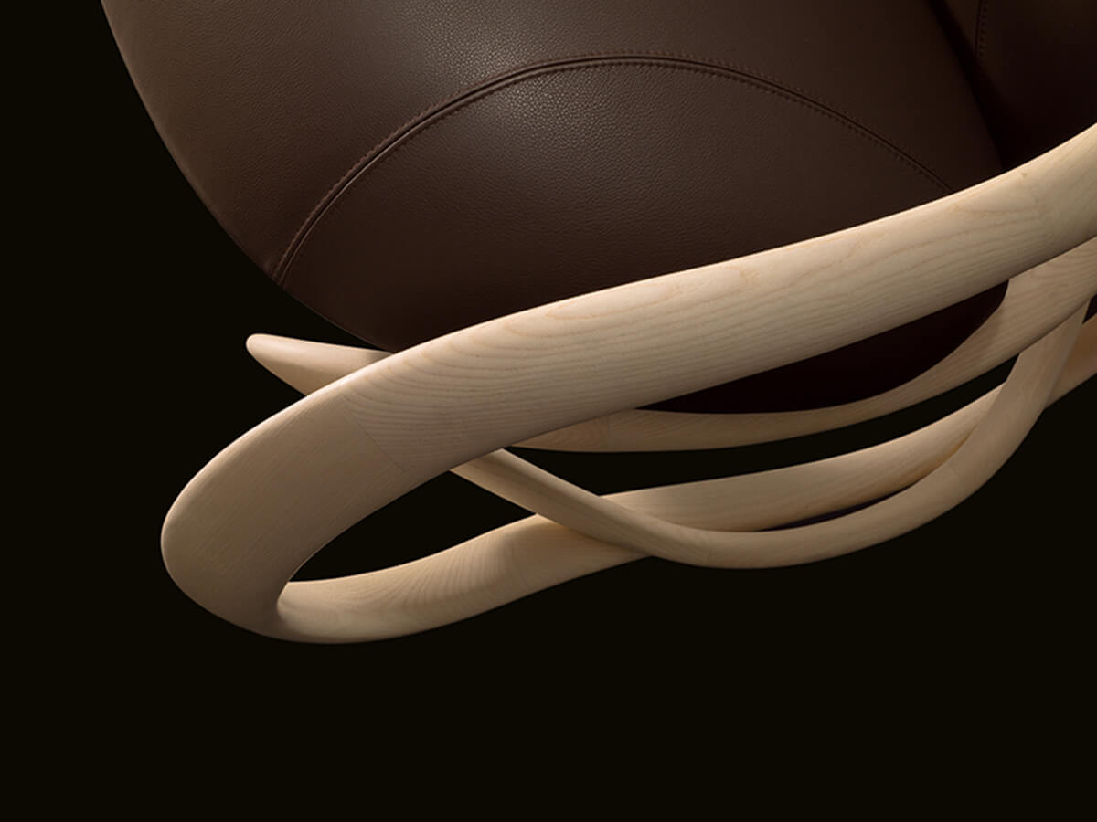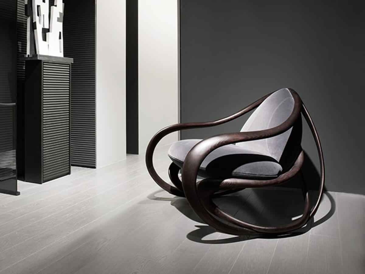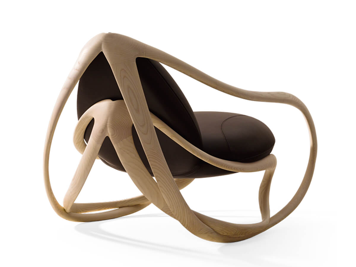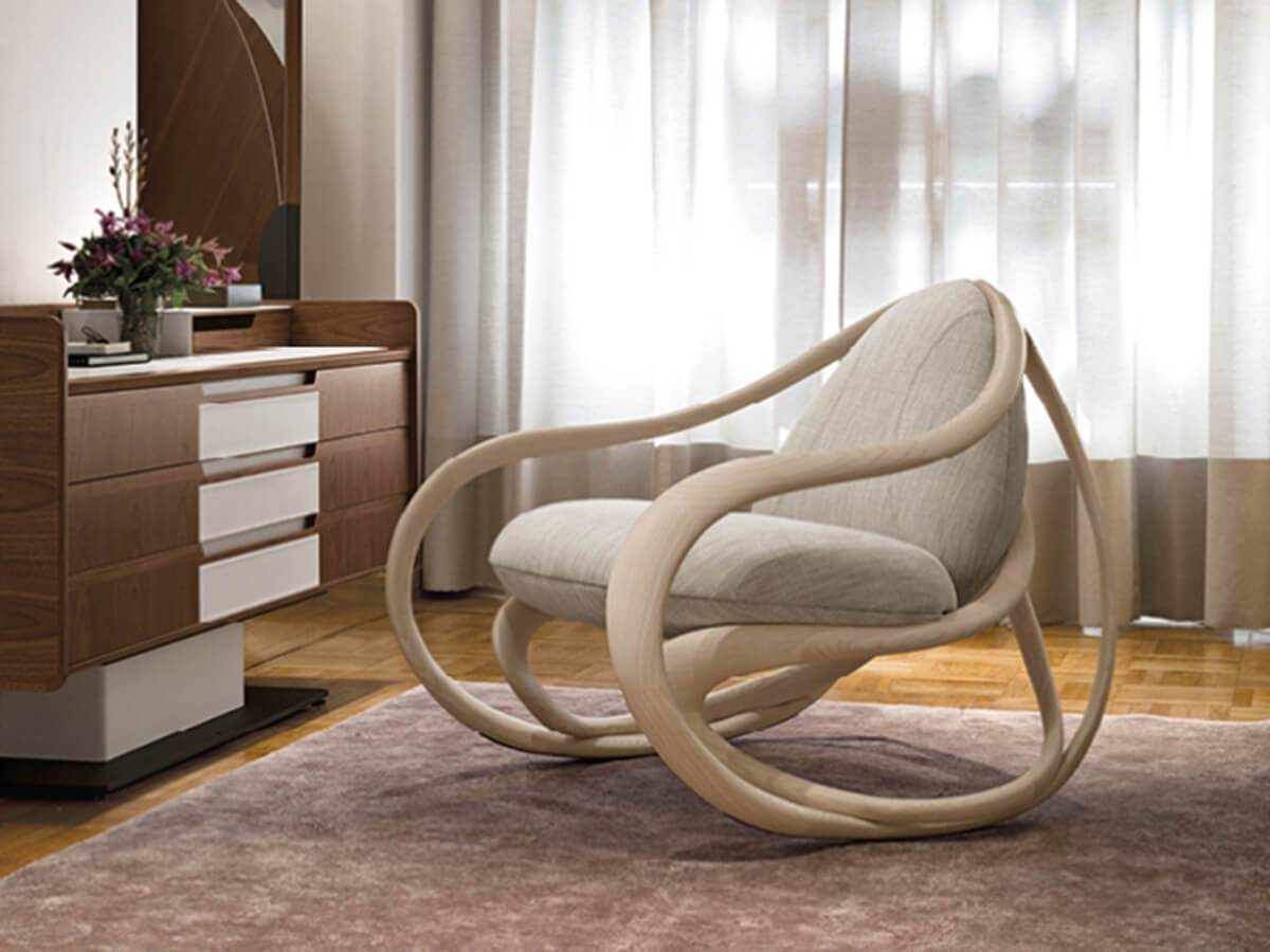The Move rocking armchair by Giorgetti can be considered a sample of high cabinet-making by the skilled Giorgetti craftsmen, capable of modulating the ash wood of the base into gentle intertwined curves of organic inspiration. Marvelous to the eye and at the same time extraordinarily functional, this composition can be considered a real wooden sculpture and has two comfortable, generously padded seat and back cushions. Ash wood can be dyed in various nuances, thus allowing the Move armchair to integrate harmoniously into environments with the most diverse tastes.
