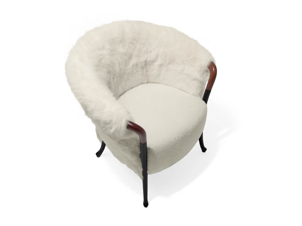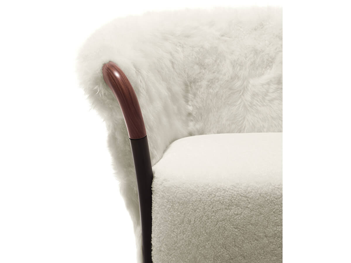 The Progetti armchair by Giorgetti is one of the most historic and iconic products of the brand. Originally conceived in 1987, Progetti is a splendid armchair with classic and timeless shapes. Its distinctive element is the wooden armrest that curves sinuously until it joins the long beech leg. This concept is then declined in an infinite series of variants: Progetti can in fact present itself both in the form of a small armchair for the bedroom and in those of a bergère with a high back, or even in the form of a comfortable armchair with deep and low. In the Progetti Blossom variant, the backrest is decorated with leather inserts, while the Progetti Fashion version presents a series of more captivating and fashionable coverings such as Kamet wool-cashmere with cabochon, Katori sheepskin or woven Twist leather.