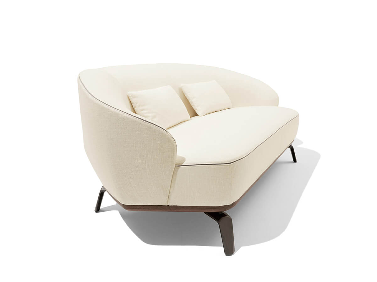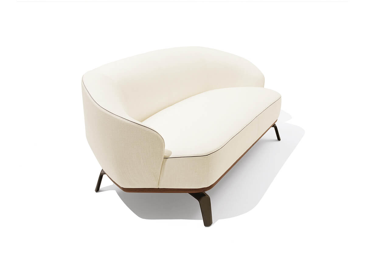 A collection of fixed sofas and armchairs with base in solid wood and canaletto walnut veneer, available in different finishes and colors. Tamino is a work aimed at enhancing elegance and aesthetic symmetry, where soft lines intertwine with each other, creating a unique suggestion of great impact. The Tamino base is available both with a ground base and with cast metal feet. The Polimex structure and the polyurethane foam padding give maximum softness during the seat. The upholstery is not removable, but has a particular leather insert along the profile that increases its stylistic value. Tamino is available in fabric or leather, with numerous variations.