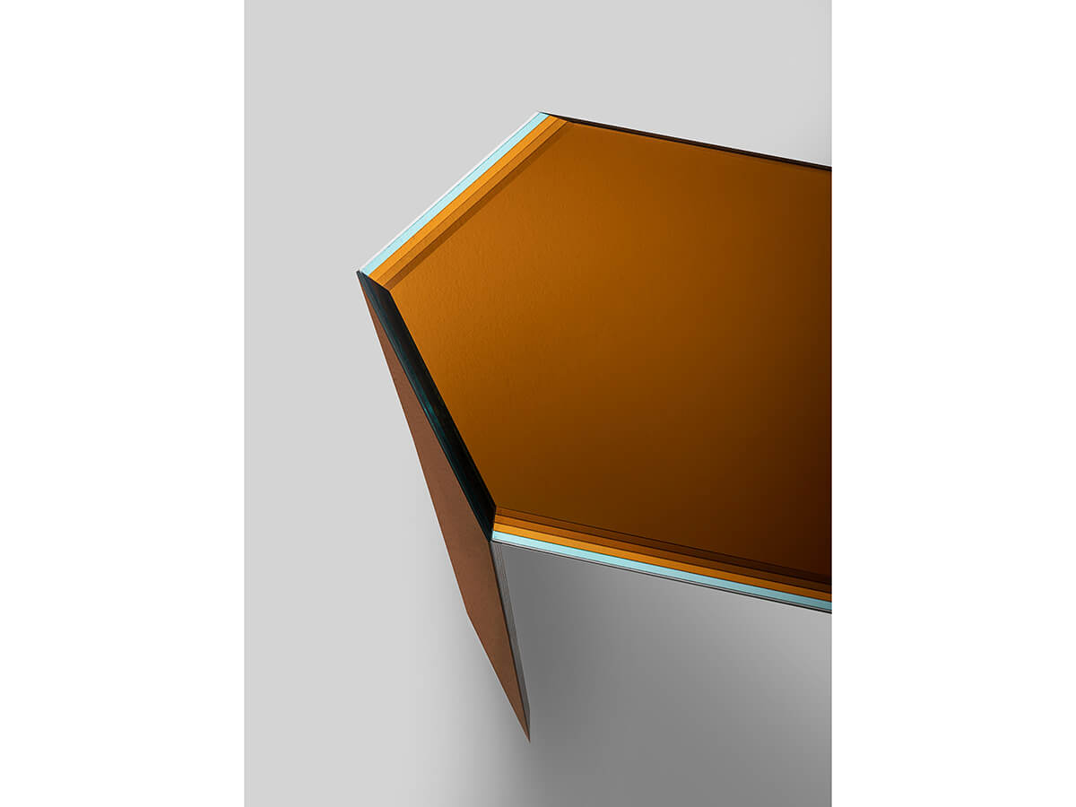 A piece of furniture with an unconventional charm, capable of attracting attention thanks to the power of its design, the result of an in-depth study by Glas Italia and Patricia Urquiola. Bisel is a collection made up of high tables, low tables and consoles each made in multi-layered and multi-chromatic glass, obtained by layering five extra-light glass slabs of minimum thickness with films of different colours. The multilayer crystal is shaped into different shapes and polished and faceted edge ground to better reflect the light and be impalpable. The transparencies obtained here create plays of wonderful nuances. The various components are then welded together in total purity thanks to special gluing techniques.