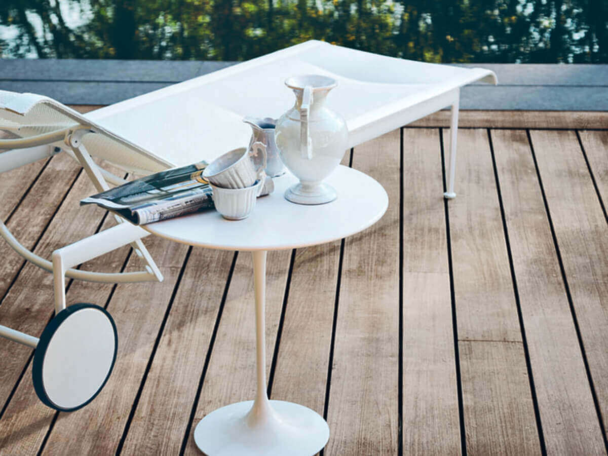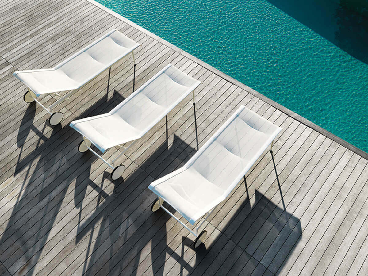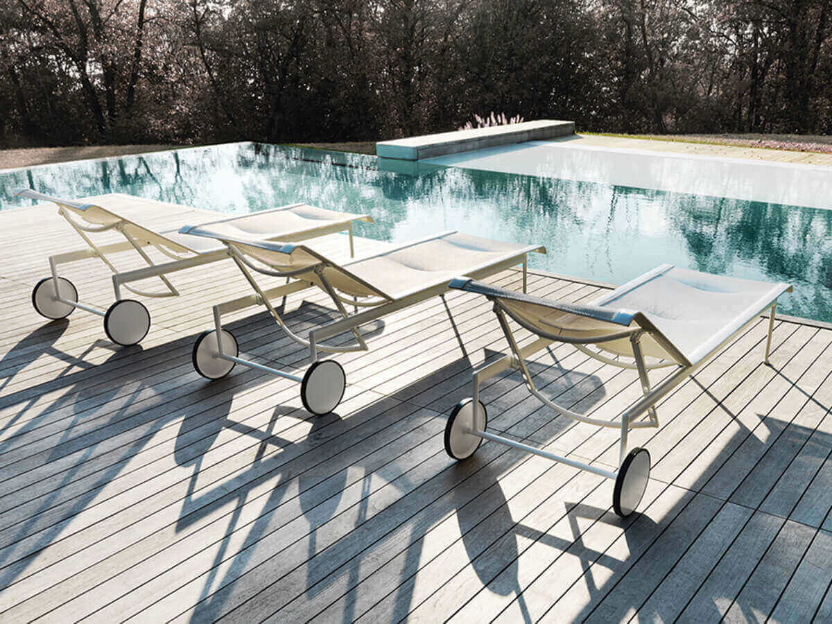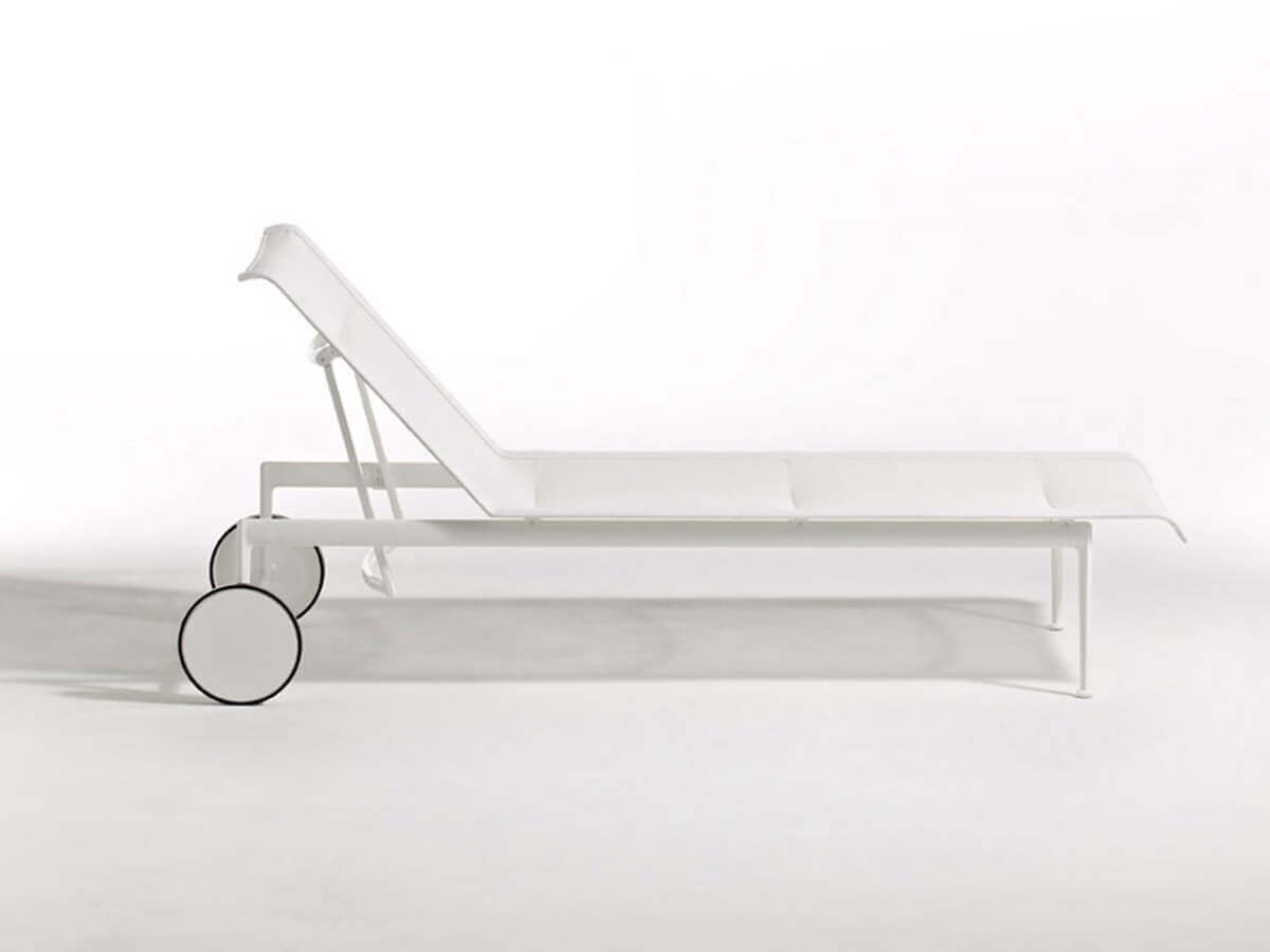 The 1966 chaise longue was born within the same outdoor collection designed by Richard Schultz on commission from Florence Knoll. Designed in 1966, it conveys a sober and elegant style that does not disdain some peculiarities of great ingenuity. Here we mention the painted aluminium structure and the woven polyester fiber mesh, both elements capable of withstanding time and bad weather. Schultz conceives this object precisely to withstand the salty winds of the ocean. A peculiarity of 1966 is the presence of wheels at the rear, just above the reclining seat, perfect for facilitating movement in open spaces.